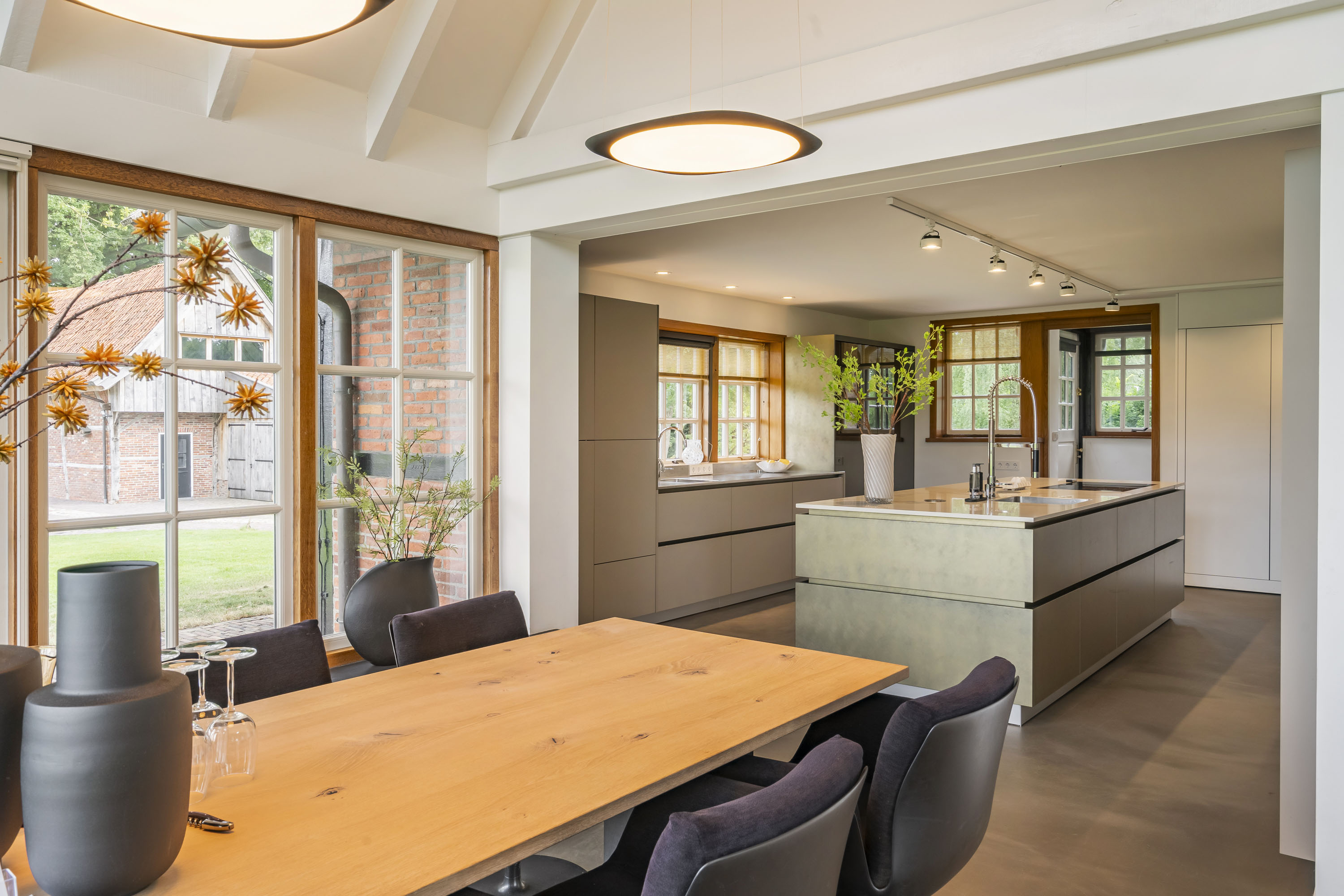 - royale leefkeuken met o.a. modern kookeiland en inbouwkeuken voorzien van composiet en RVS werkblad en luxe inbouwapparatuur waaronder oven, stoomoven, magnetron, koelkast, vriezer, vaatwasser, Quooker, en wijnkast. Volop ruimte om samen met familie of vrienden gezellig te dineren.