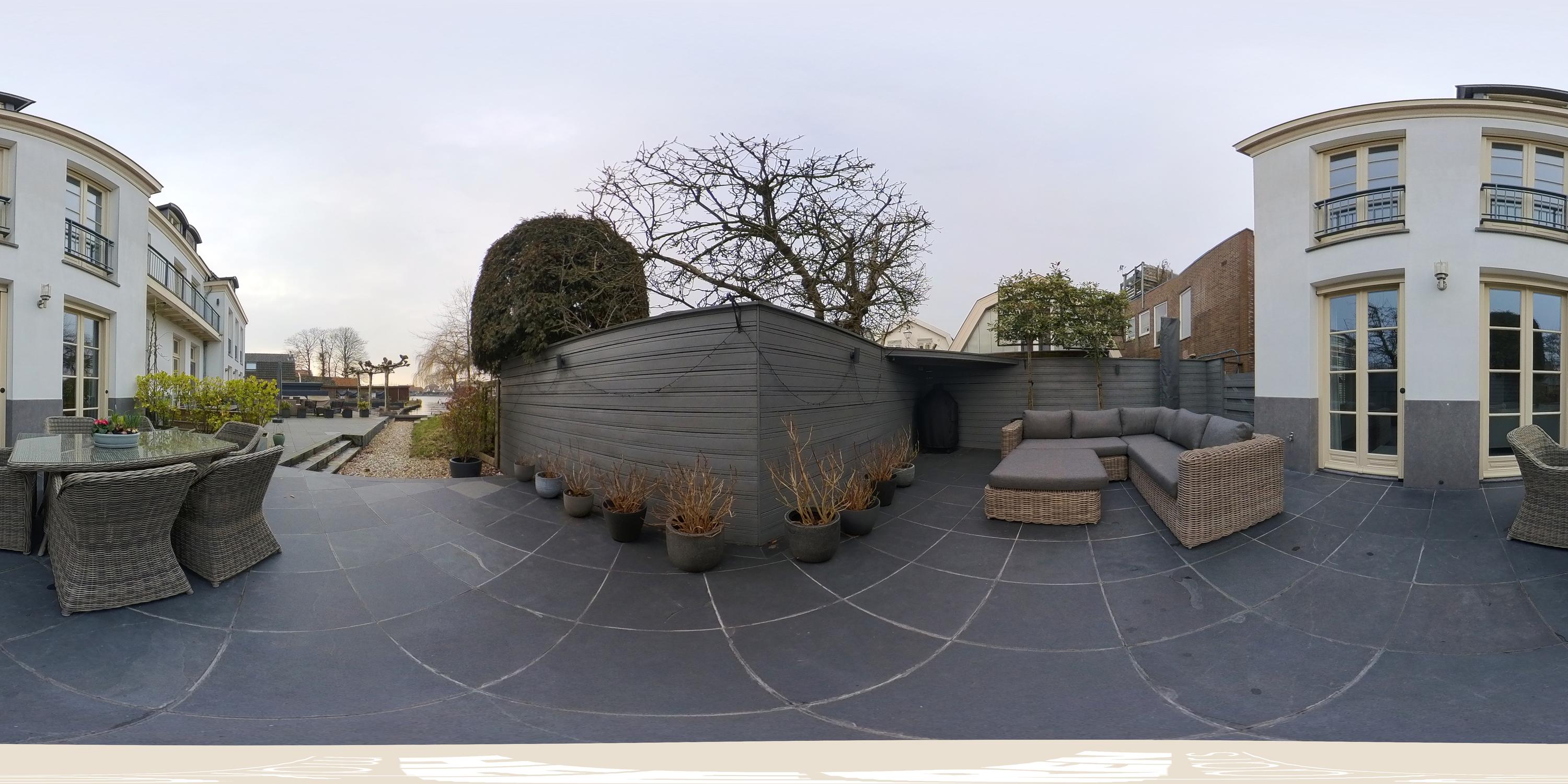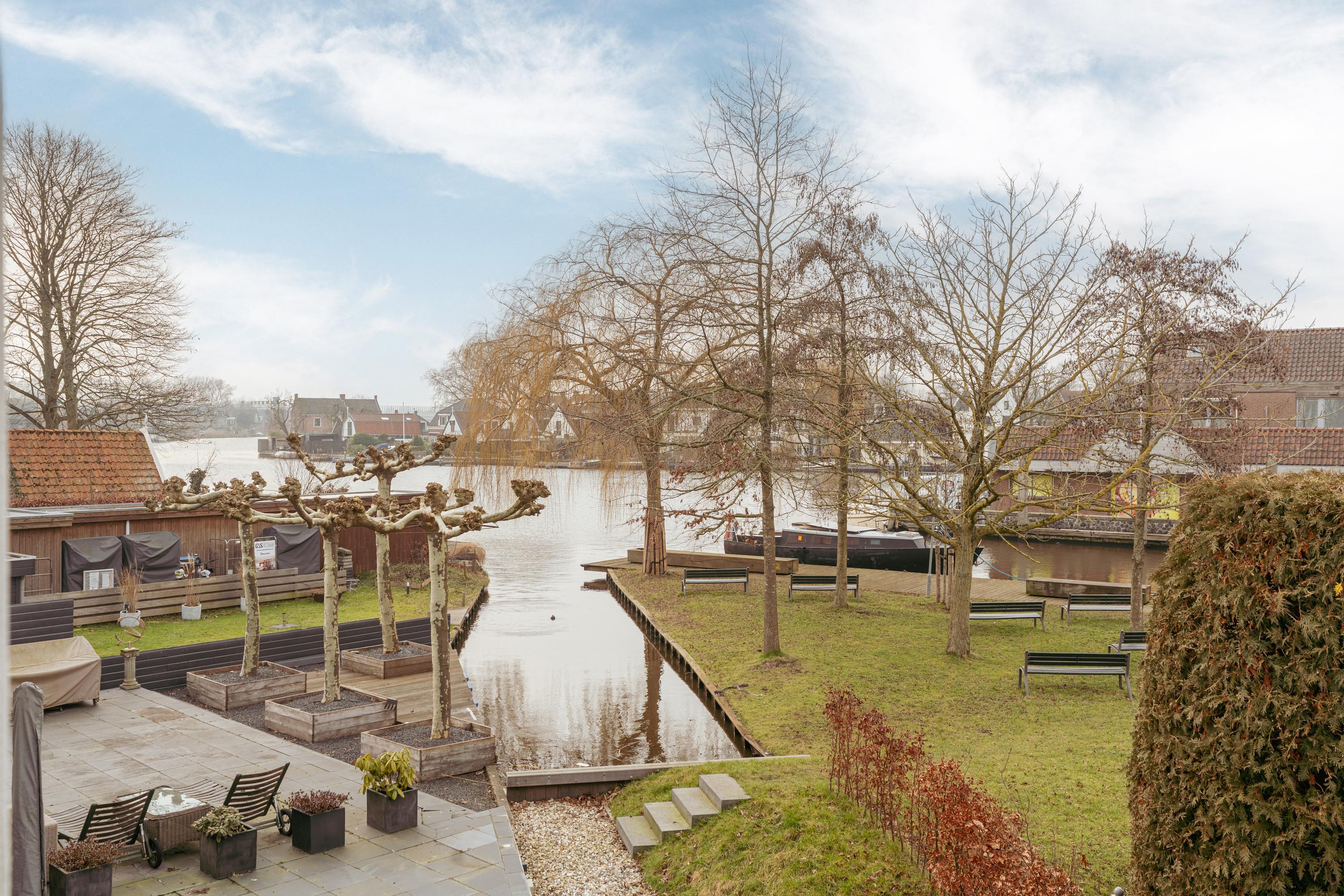 The terrace is finished with anthracite-coloured tiles, located along a side branch of the Amstel. A wonderful place to enjoy drinks with friends on summer evenings while overlooking the water; in winter, skating here is even a possibility. In the front garden, there is a separate storage unit of approximately 7 m², fitted with electricity. A rear access path runs alongside the house.