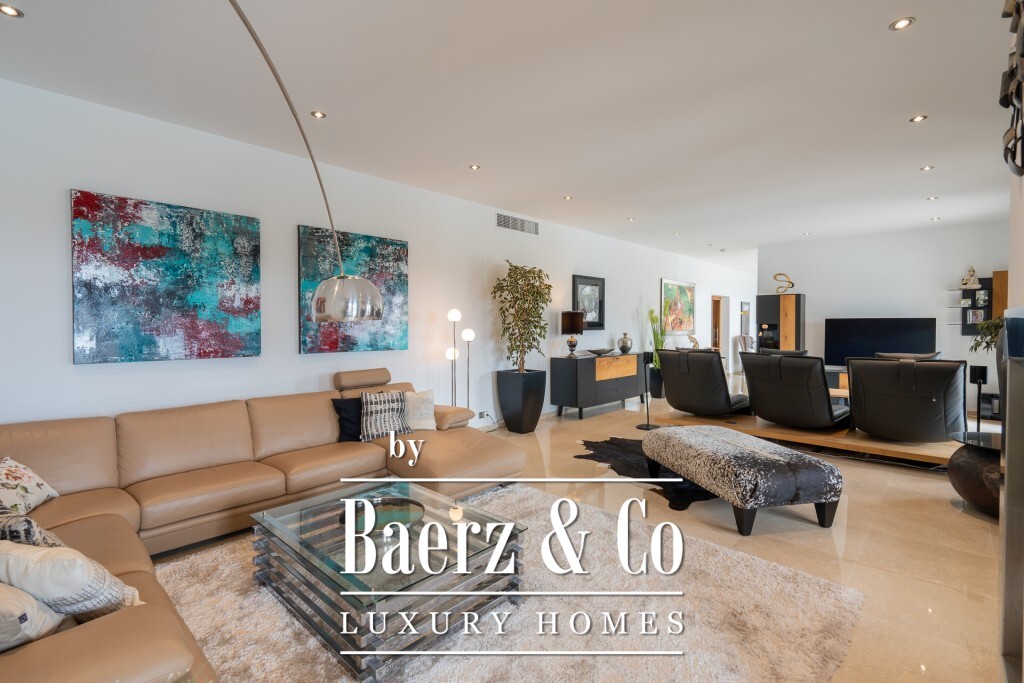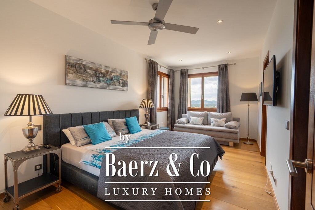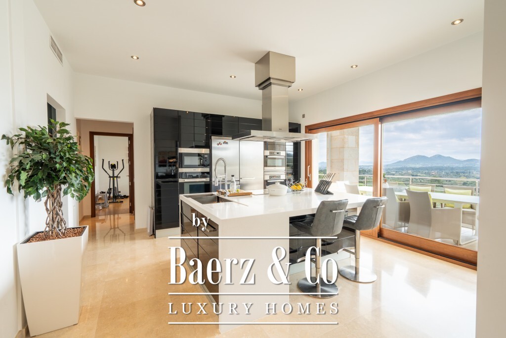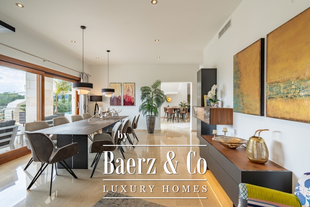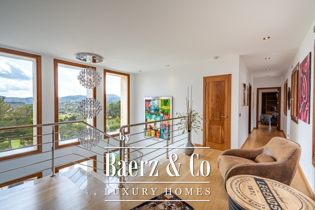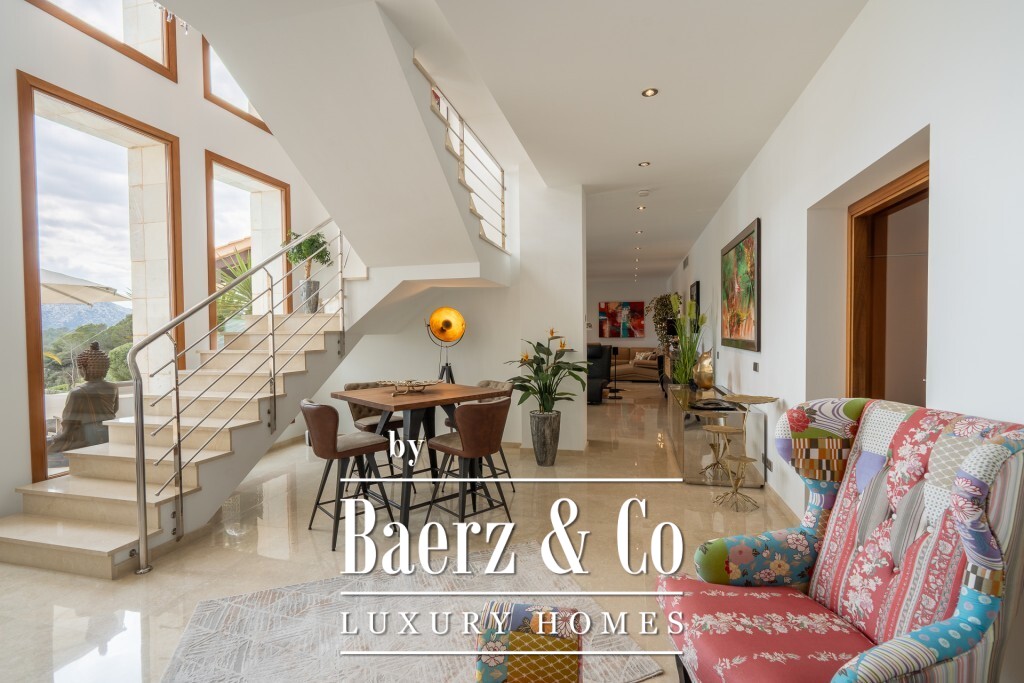 Mediterranean villa Pollença stands as a rare offering in one of the island's most sought-after settings, surrounded by just 20 exclusive residences and directly bordering a 9-hole golf course. Spanning a 2,319 m² plot and offering 672 m² of living area, this villa is poised above the landscape, delivering panoramic sea and mountain views that extend across the greens towards the bays of Pollensa and Alcudia. The south-facing orientation enhances the light-filled interiors, while intelligent landscaping guarantees complete seclusion for the pool, terraces, and gardens.
