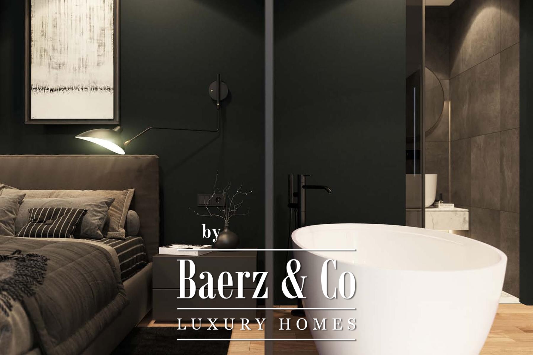 Spanning 213 m², this property is thoughtfully arranged over two levels. The ground floor centers around a spacious, open-plan living area with a kitchen island and dining space, where expansive glass walls invite natural light and connect the interiors to a covered terrace and landscaped garden. The layout includes a bedroom with ensuite bath and walk-in wardrobe, a guest toilet, laundry, and technical room. Upstairs, three luxurious bedrooms each feature a private bathroom, walk-in wardrobe, and access to wide sea-facing terraces.
