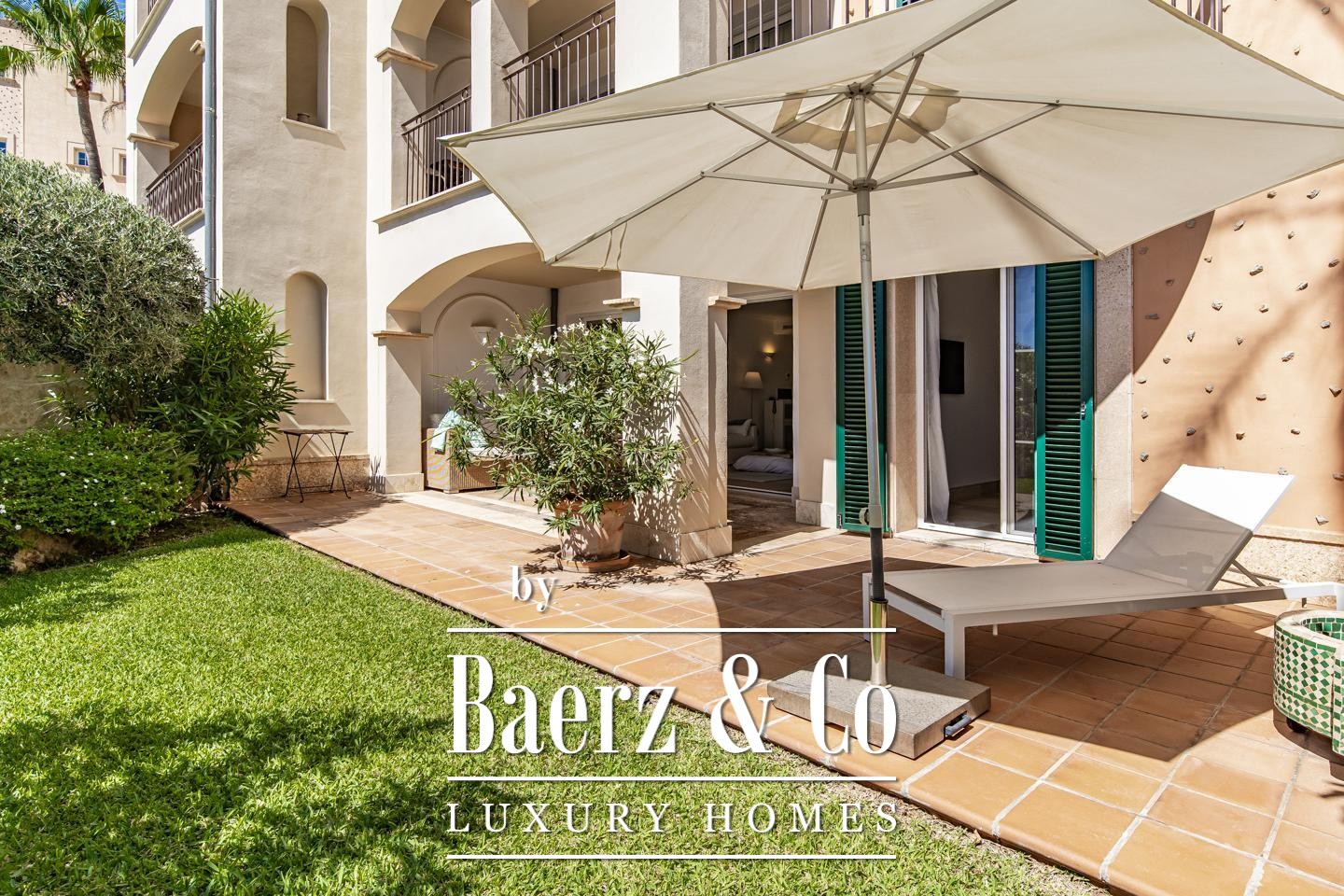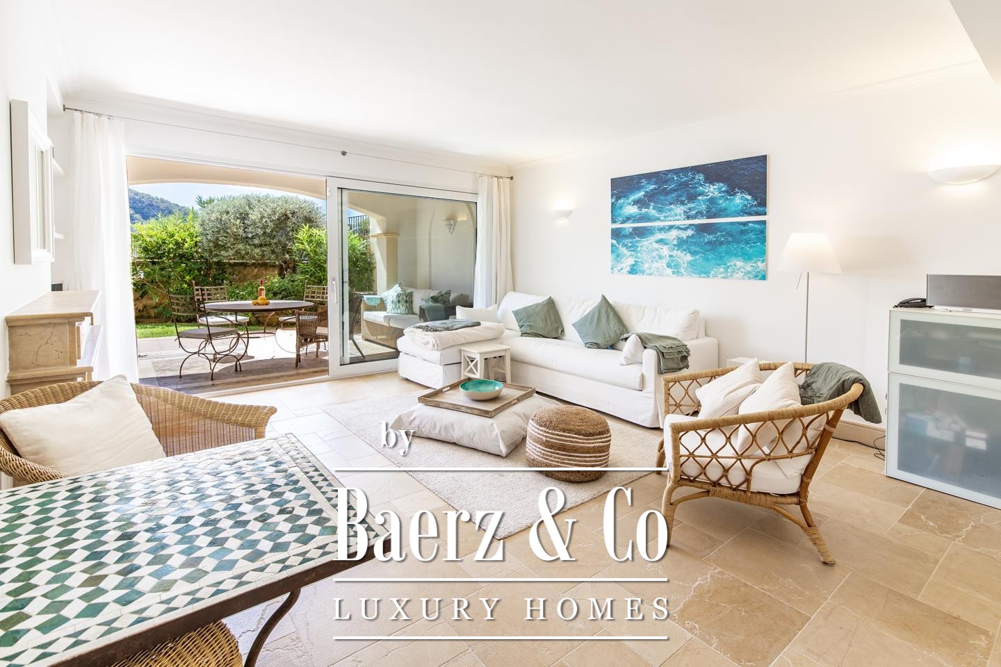 Apartment Port d'Andratx offers a refined blend of architecture and Mediterranean light, set within one of the area’s most distinguished communities. Just moments from Cala Llamp, this residence combines comfort and serenity with a sense of understated luxury. The apartment spans approximately 95 m², with one bedroom and an en-suite bathroom featuring bathtub and shower. Marble floors, underfloor heating, and a Poggenpohl kitchen with Küppersbusch appliances reflect a thoughtful approach to design. The living area and main bedroom both open onto a 33 m² terrace, leading into a private garden—a tranquil space to savour Mallorca’s gentle climate.