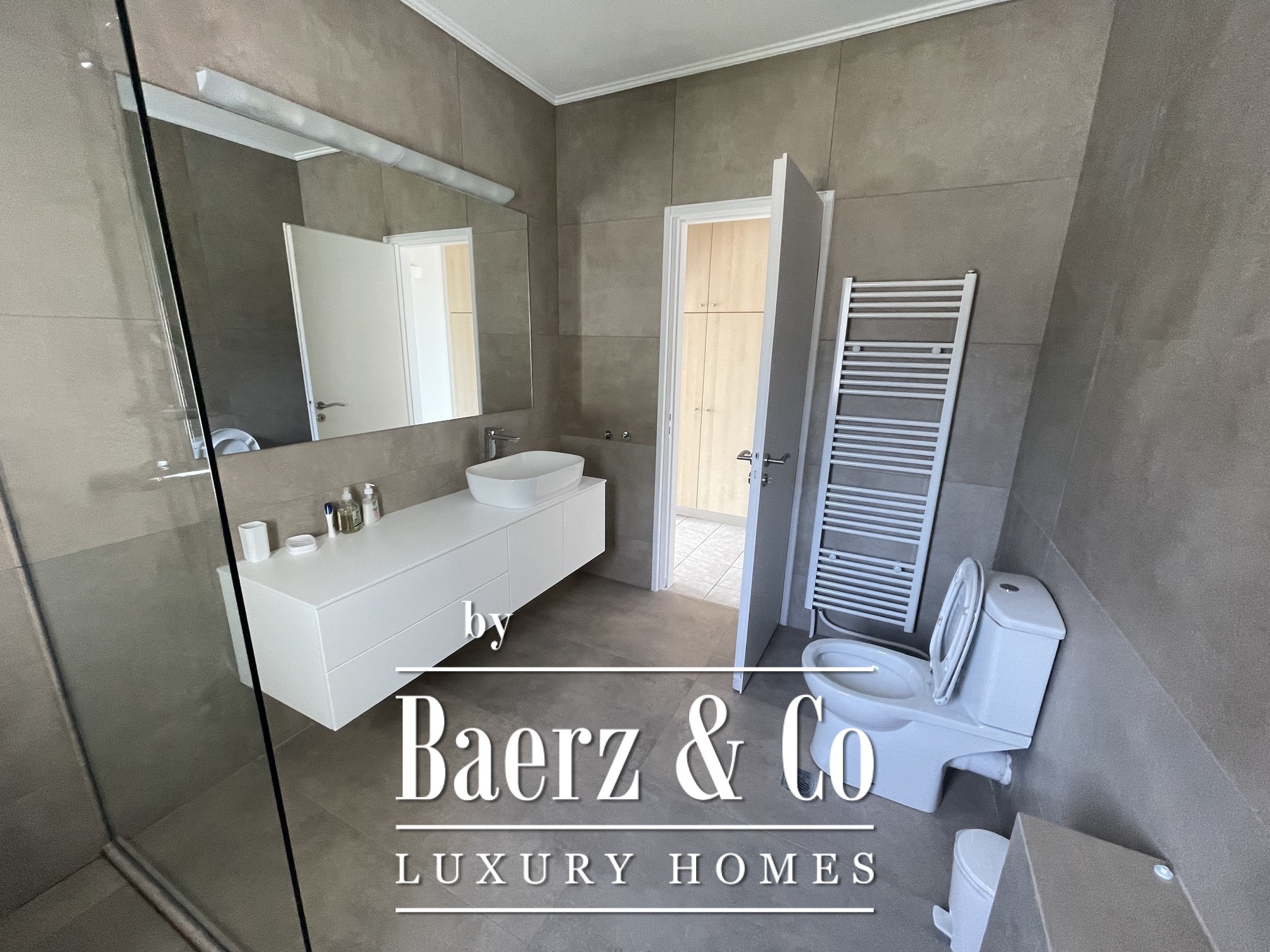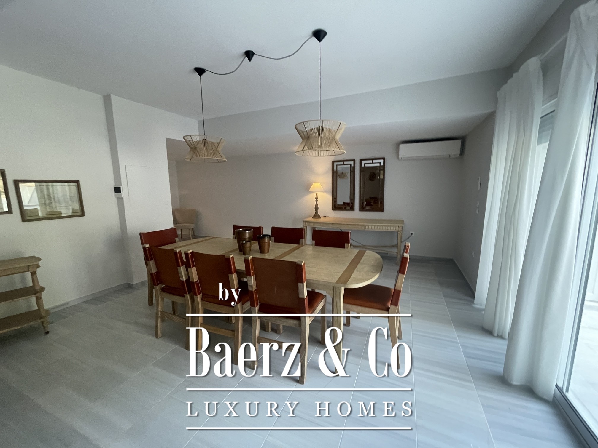 Interiors feature contemporary finishes and an abundance of natural light, with the design prioritizing openness and connection to the outdoors. The main living areas flow seamlessly toward sunlit terraces, a landscaped garden, and a private swimming pool, making everyday life and entertaining effortless. A fully equipped kitchen offers generous space for culinary pursuits, further enhancing the sense of comfort and modern ease.