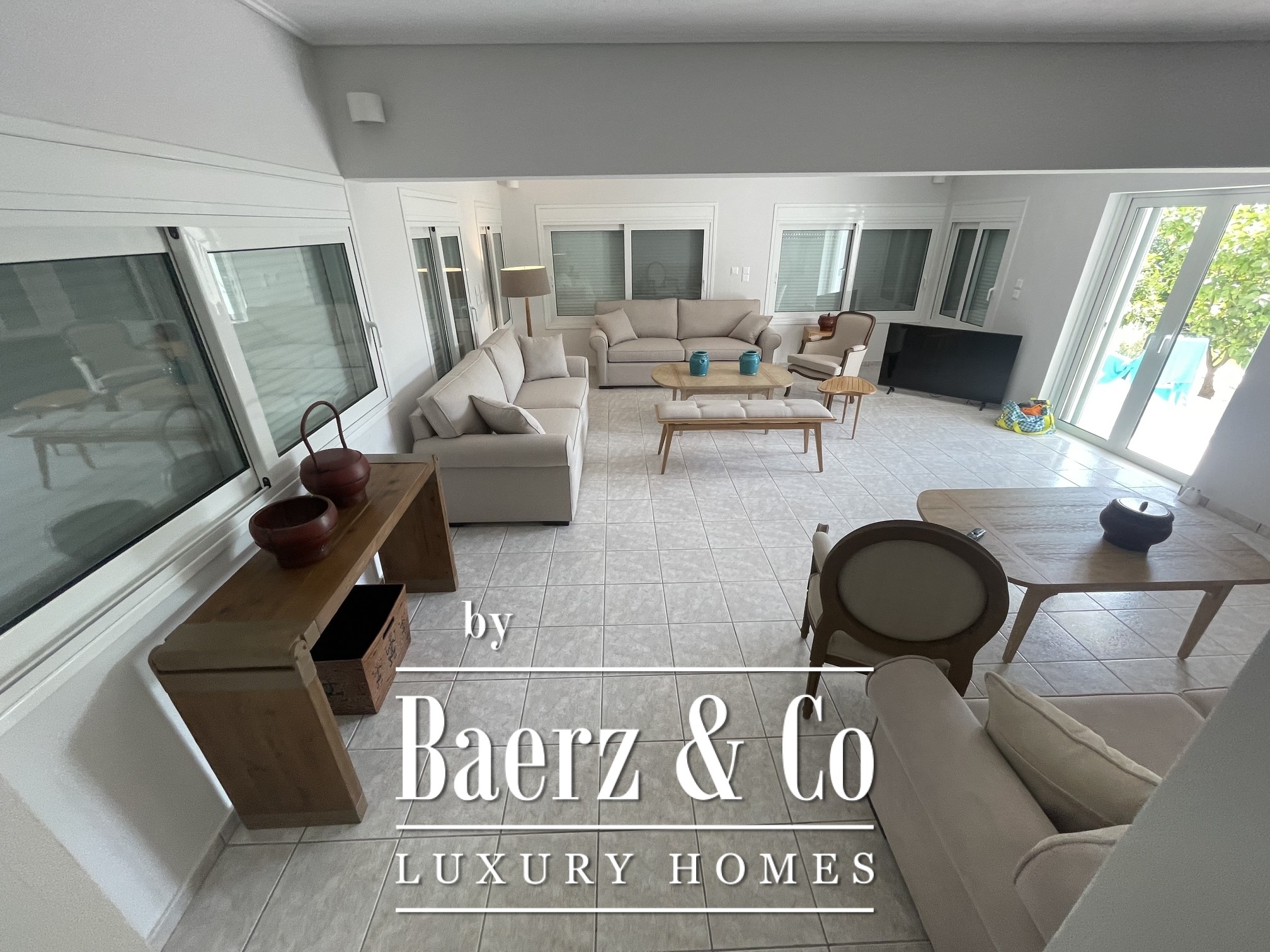 Villa for sale Porto Heli encapsulates refined Mediterranean living in one of Greece’s most coveted coastal settings. Set discreetly among private estates just steps from the sea, this recently renovated residence offers 425 m² of living space within a 1,065 m² landscaped plot. The property is arranged over three independent levels, with five spacious bedrooms and six bathrooms, creating options for both intimate family life and independent guest accommodation.