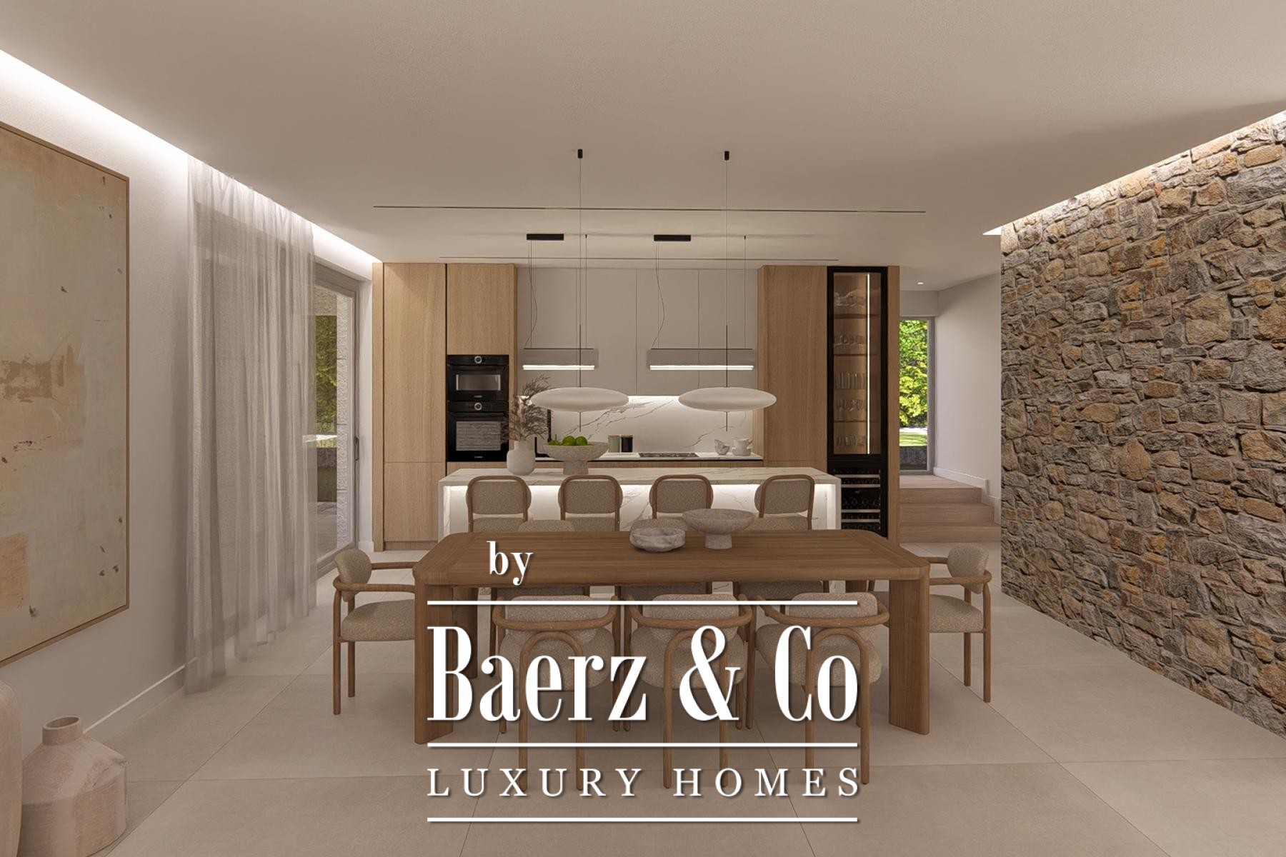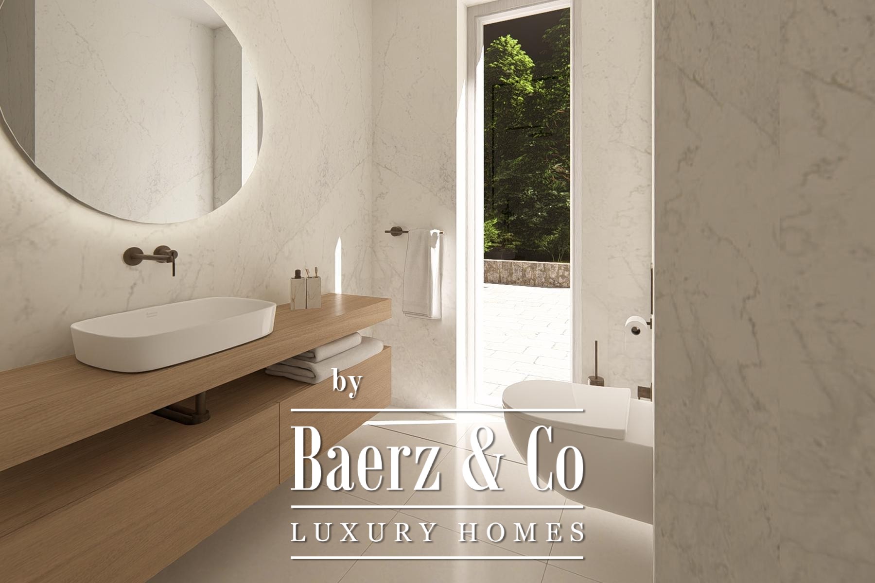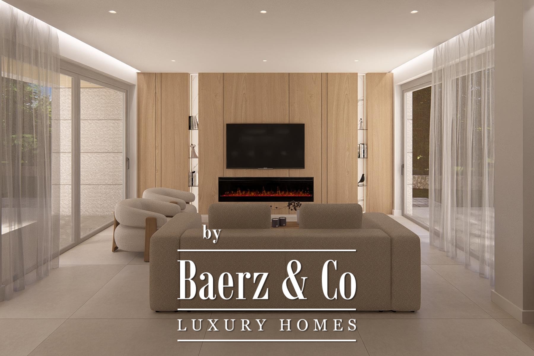 The main level welcomes you with an open living room, kitchen, and dining area, flowing onto a covered terrace with a barbecue. Here, expansive glass doors frame sea views and bring in natural light. The ground floor features one bedroom with its own private bathroom, while the first floor holds three further bedrooms, each with en-suite bathrooms and loggia access. The upper floor opens to a generous terrace, enhancing the flow between indoors and out.