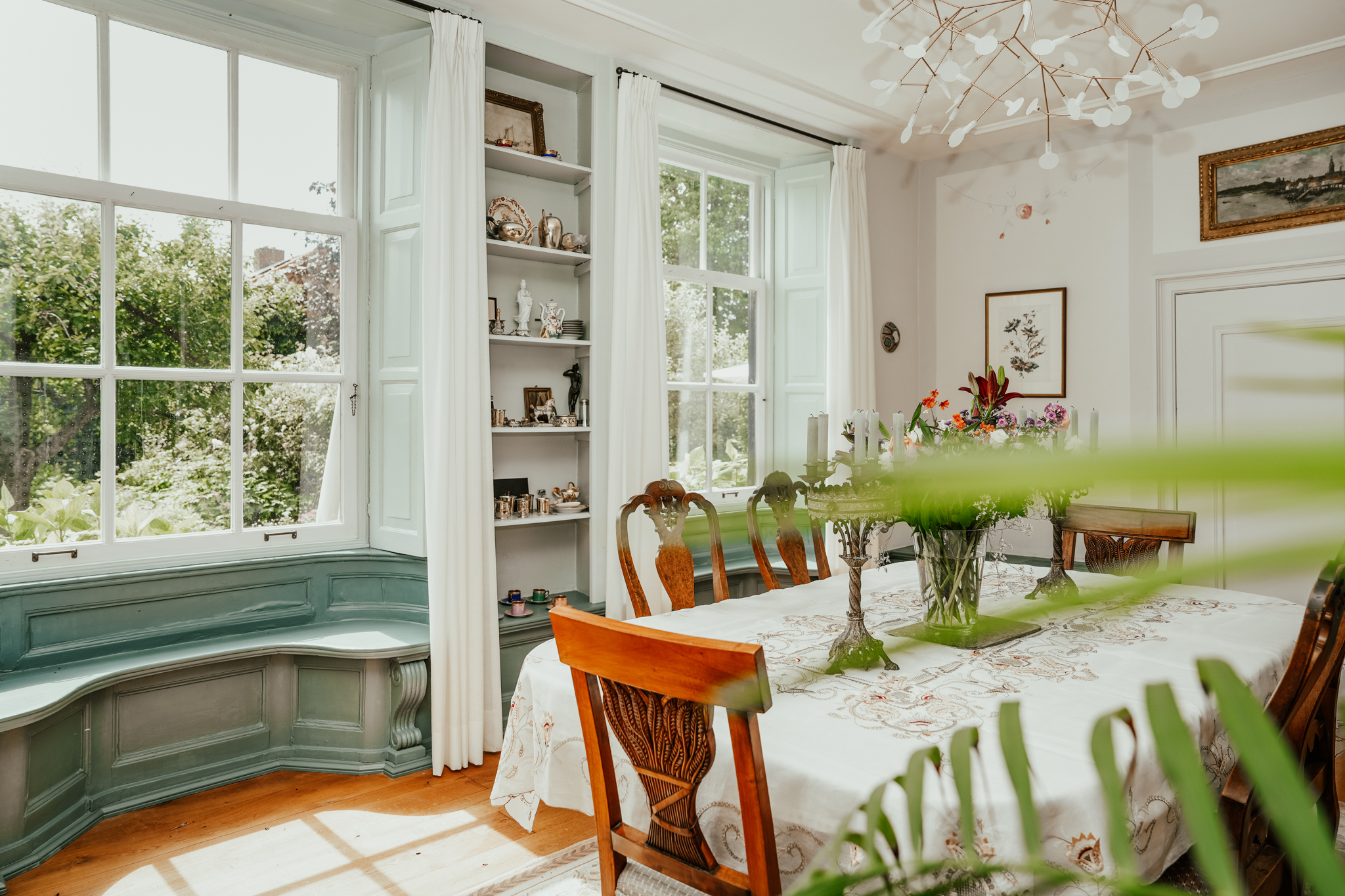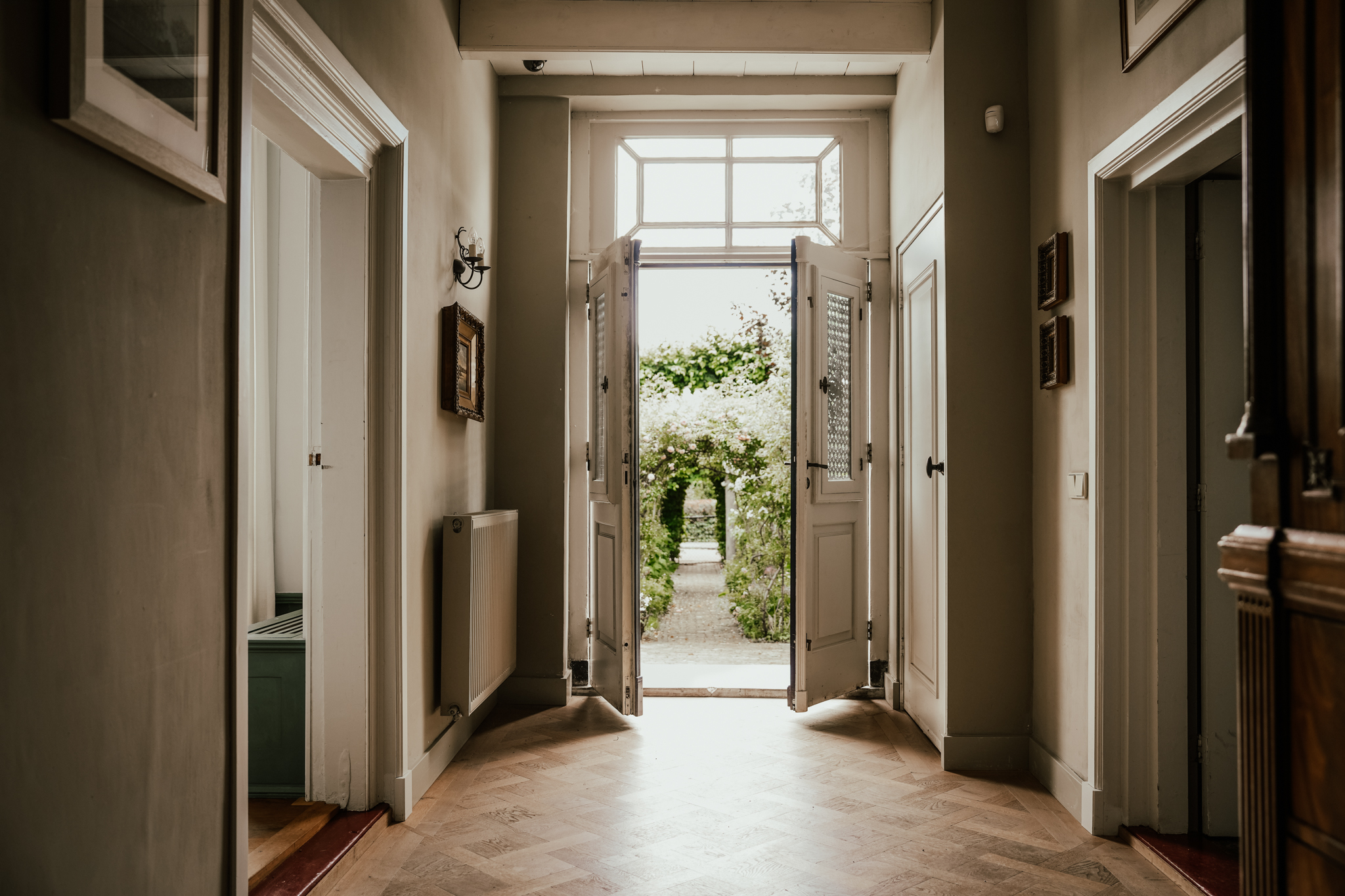 The landing leads to three spacious bedrooms and a balcony. The master bedroom features an open fireplace, built-in wardrobes, and air conditioning. Tall sash windows provide beautiful views of the front garden and the Waaldijk.