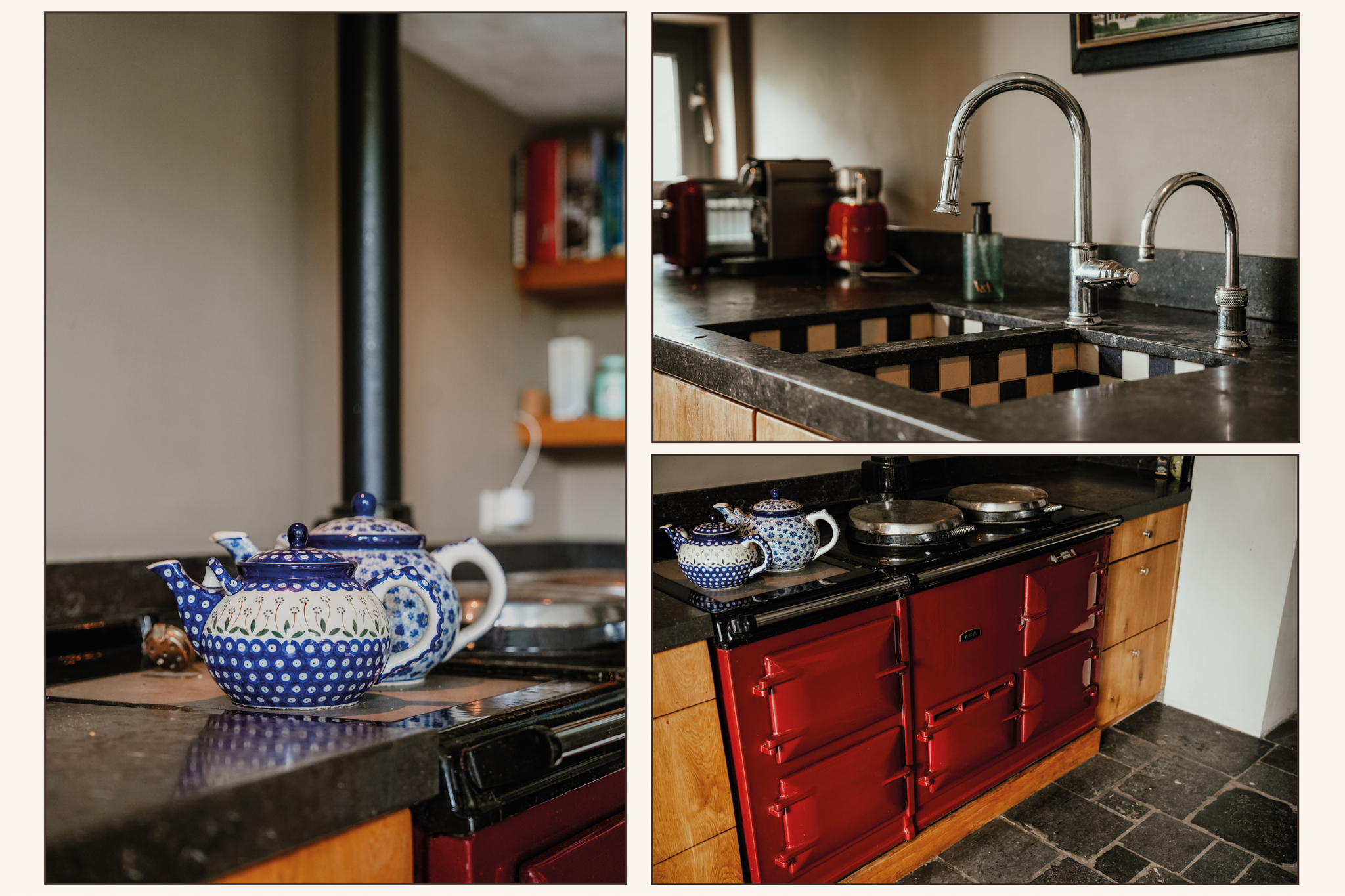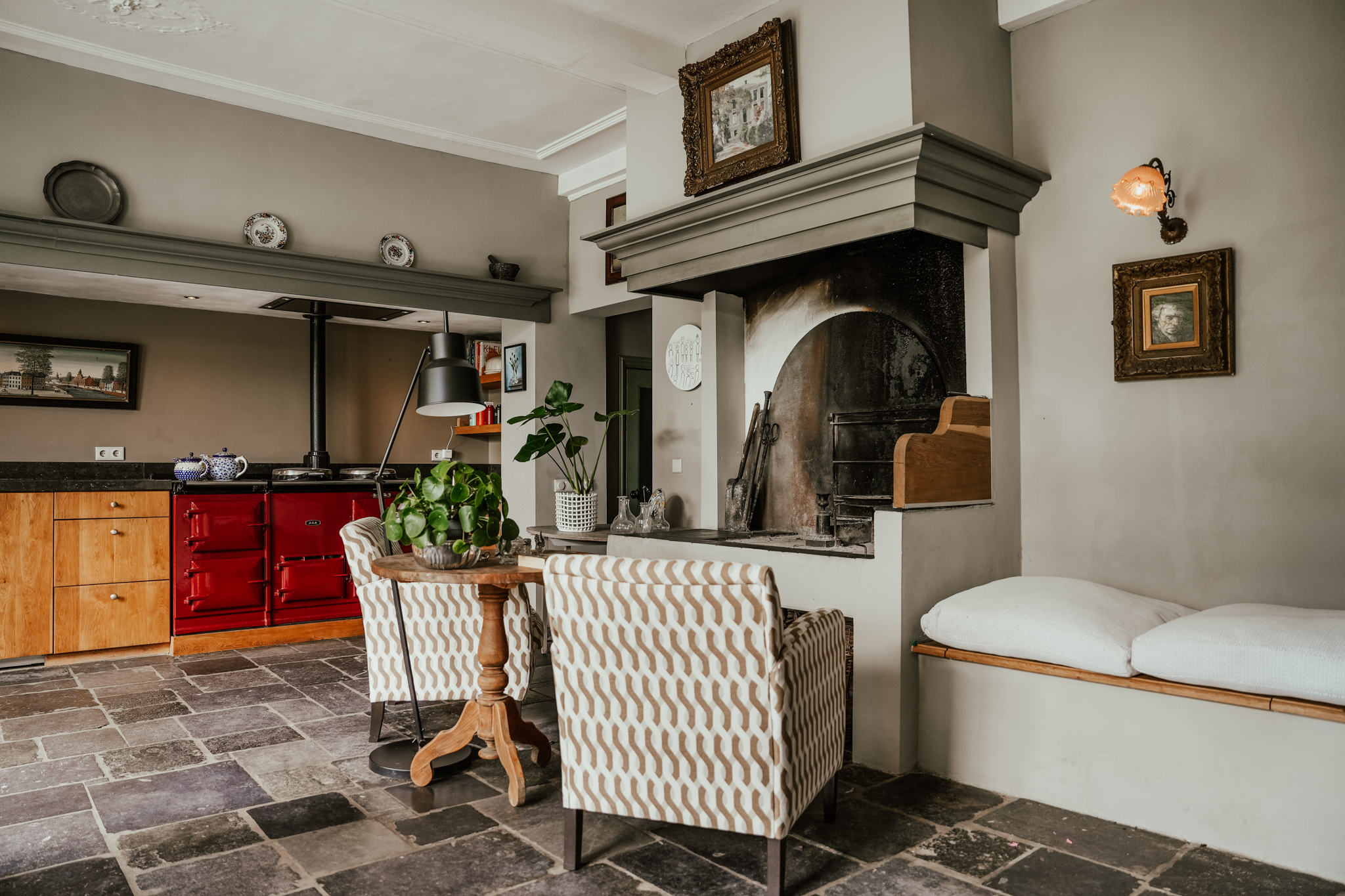 A broad stone staircase leads from the hallway to the cellar, which has full headroom and fixed wine racks. The expansive kitchen is the heart of the home, offering garden views. It features an antique limestone floor with underfloor heating, and a large AGA cooker beneath a wide mantelpiece. The custom-made oak kitchen with a stone countertop perfectly complements the ambiance of this living space. A raised fire pit that doubles as an open fireplace or grill is a highlight of the kitchen.