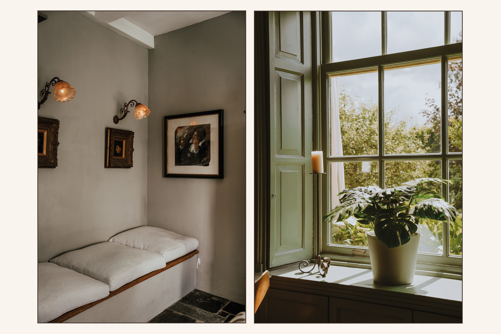 Elegant double panel doors connect the living room to the garden-facing dining room. This charming room offers deep window seats below the tall sash windows with authentic interior shutters, a built-in cupboard, and a plaster ceiling.