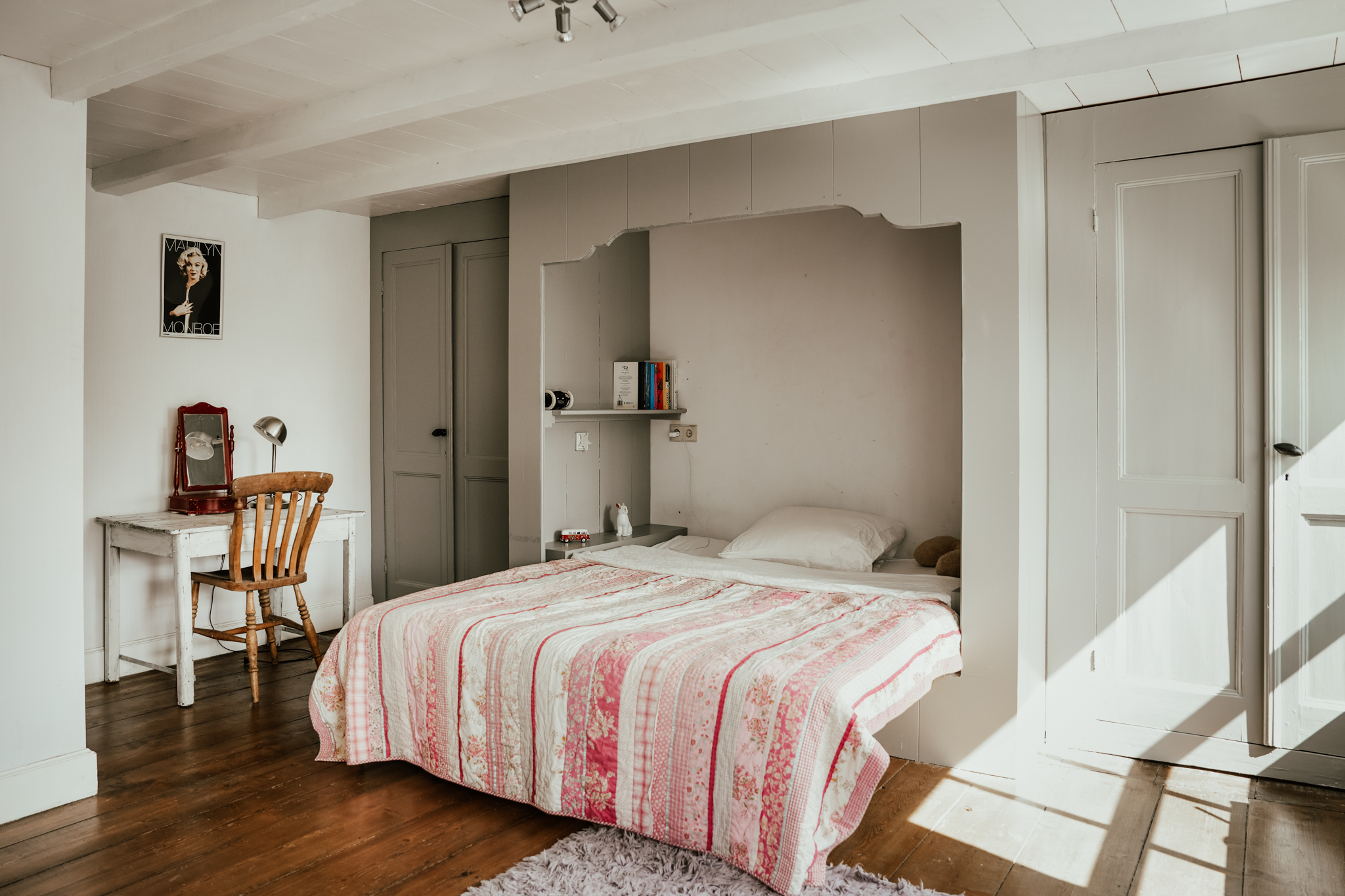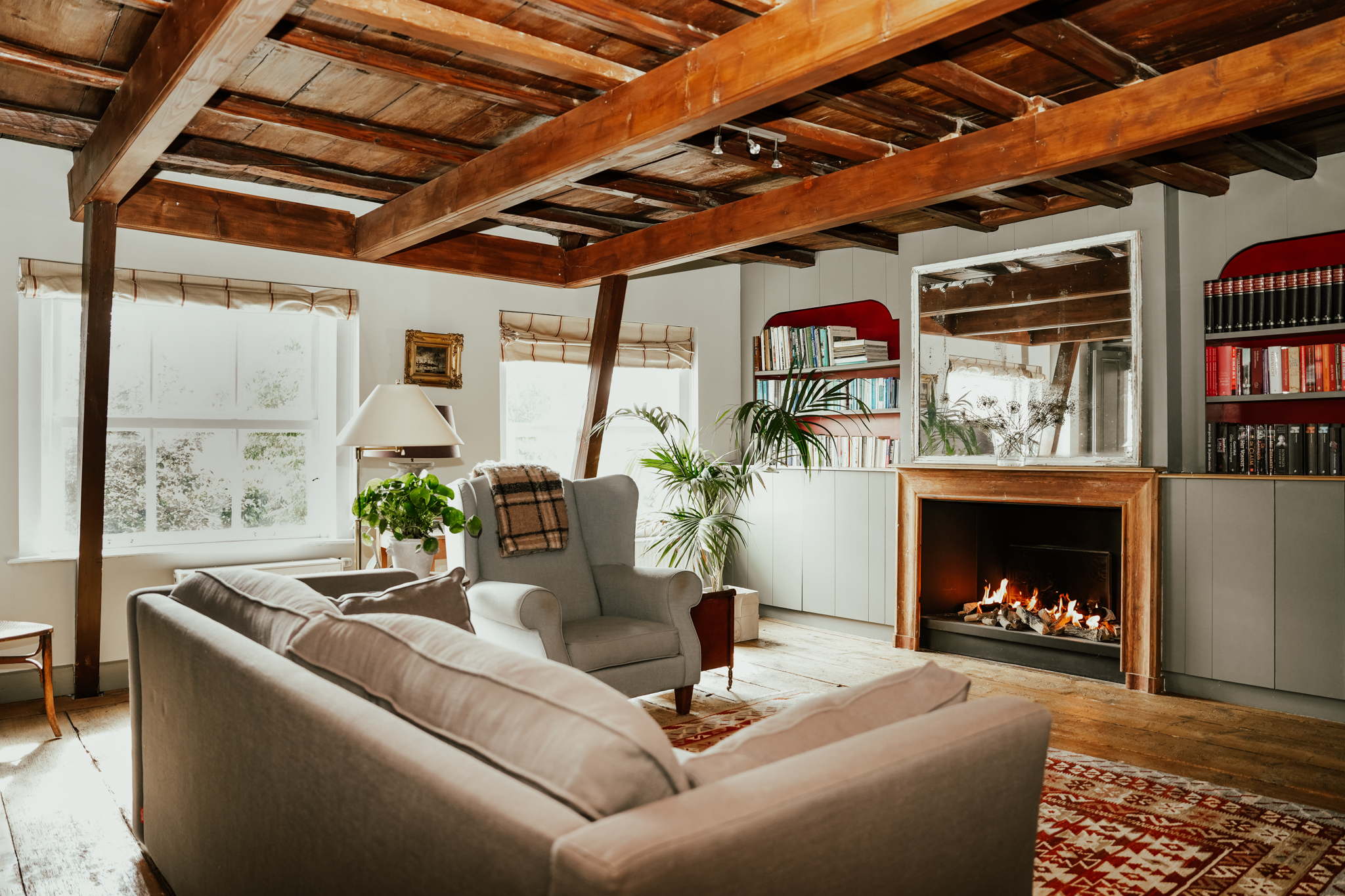 Of the two rear-facing rooms overlooking the garden, the largest currently serves as a second living room, TV room, and has an adjoining workspace. This room radiates authenticity with its beautifully restored beamed ceiling, sash windows, 200-year-old wide floorboards, and a fireplace with fixed cupboards. This room also provides access to the laundry room, workspace, and office.