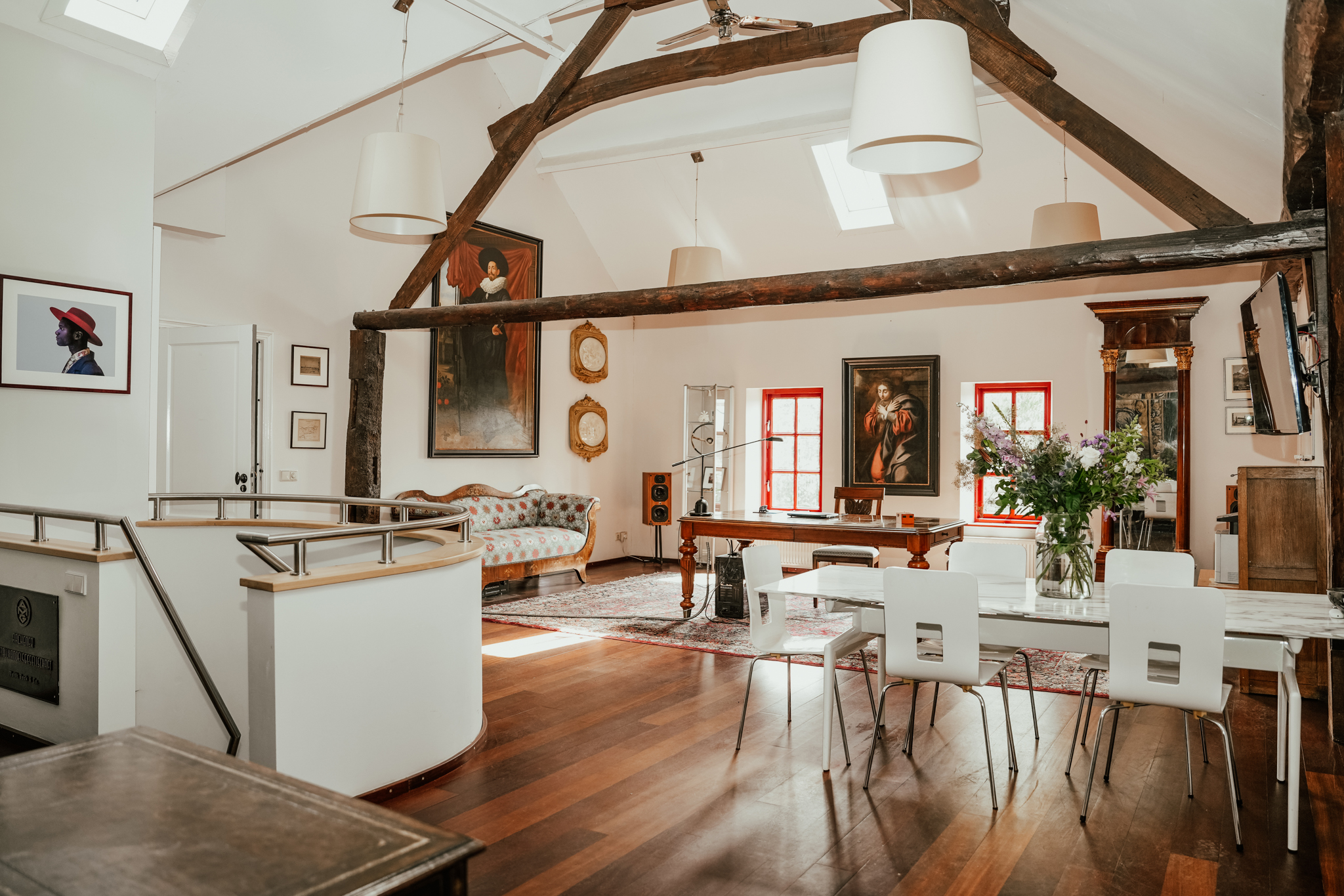 The impressive office space is located under the high, well-insulated thatched roof, with exposed rafters adding character. Skylights flood the room with natural light. This versatile space is ideal for multiple workstations, a meeting table, or even a snooker table. The office has a separate entrance from the ground floor but is also accessible from the first floor. It includes a pantry, toilet, and a large archive room with built-in shelving. Naturally, the office space is equipped with air conditioning.