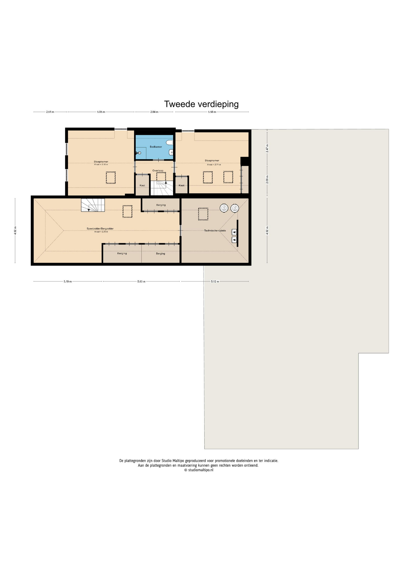 Above the front section of the house lies a large play/storage attic with fixed cupboards and a technical room. This roof section is also fully insulated.
