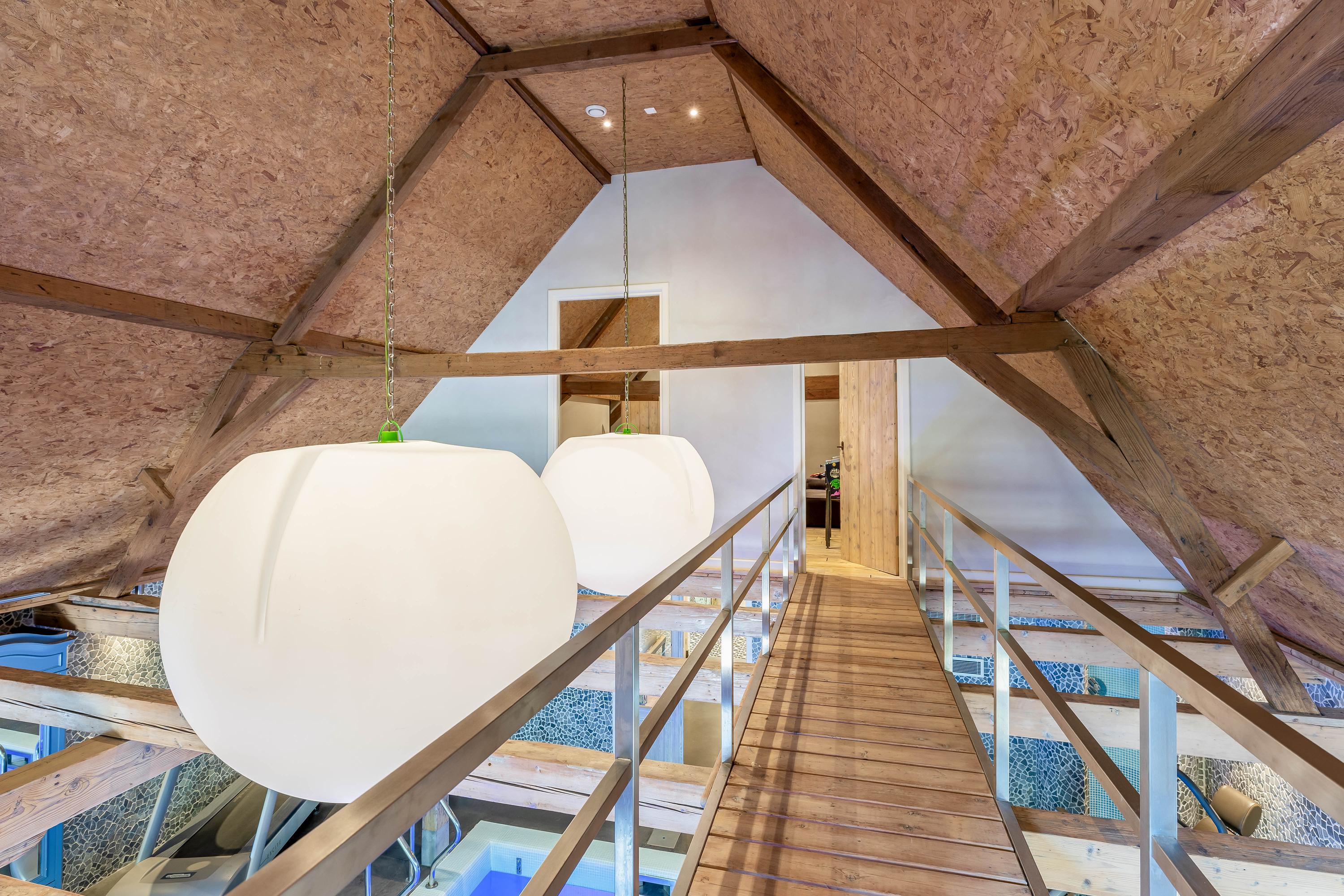 The renewed master suite includes an en-suite bathroom, while a dedicated entertainment room serves as a billiard lounge or guest accommodation. In the former stable, a generous wellness area unfolds with a swimming pool, jacuzzi, gym zone, and light streaming through original stable windows. The property’s serene sense of space is reinforced by 1,250m² of land, with an additional 4,430m² leased, offering orchards of cherry, walnut, apple, and pear trees, a garage over 80m², three horse stables, and a greenhouse.