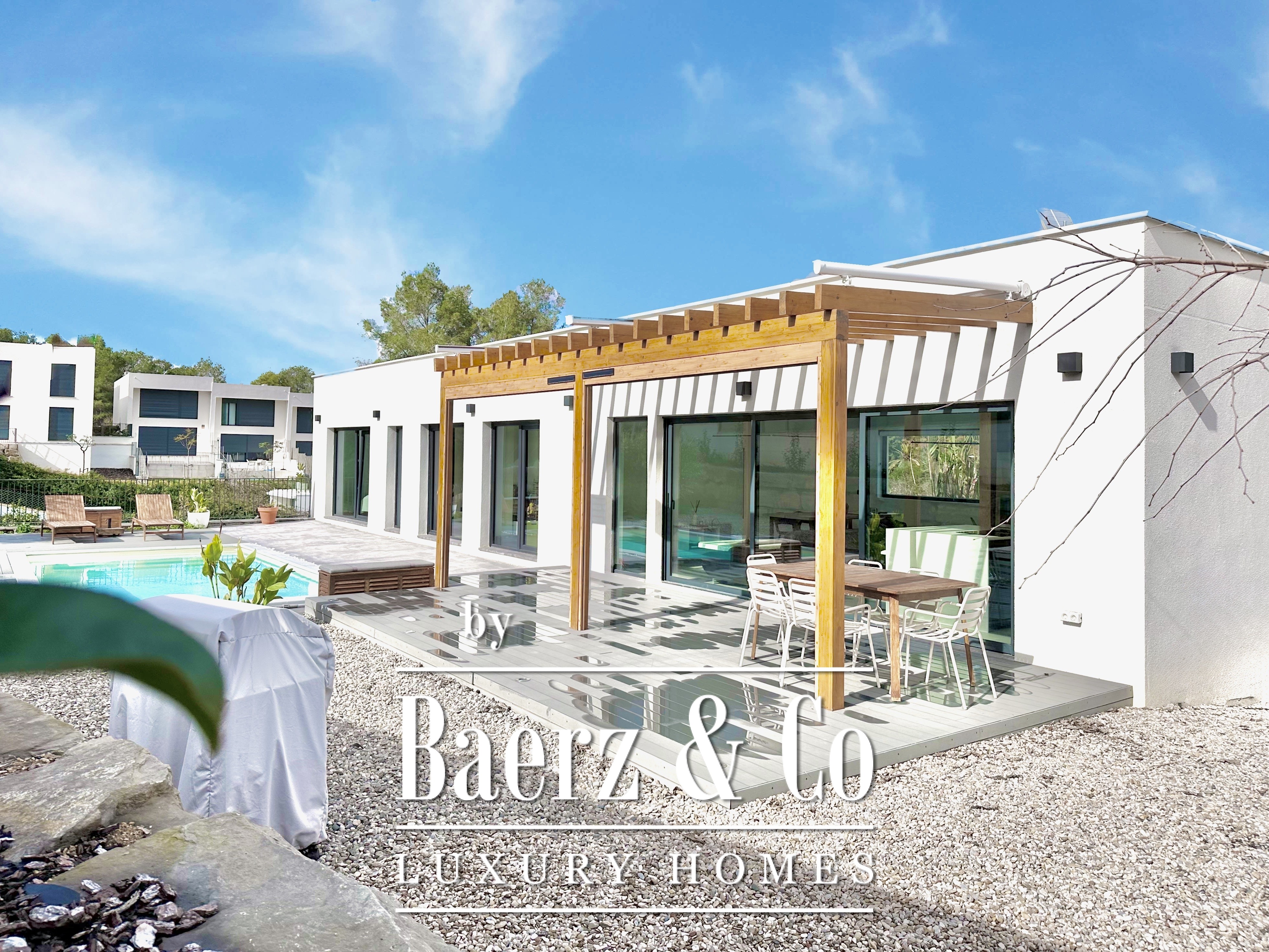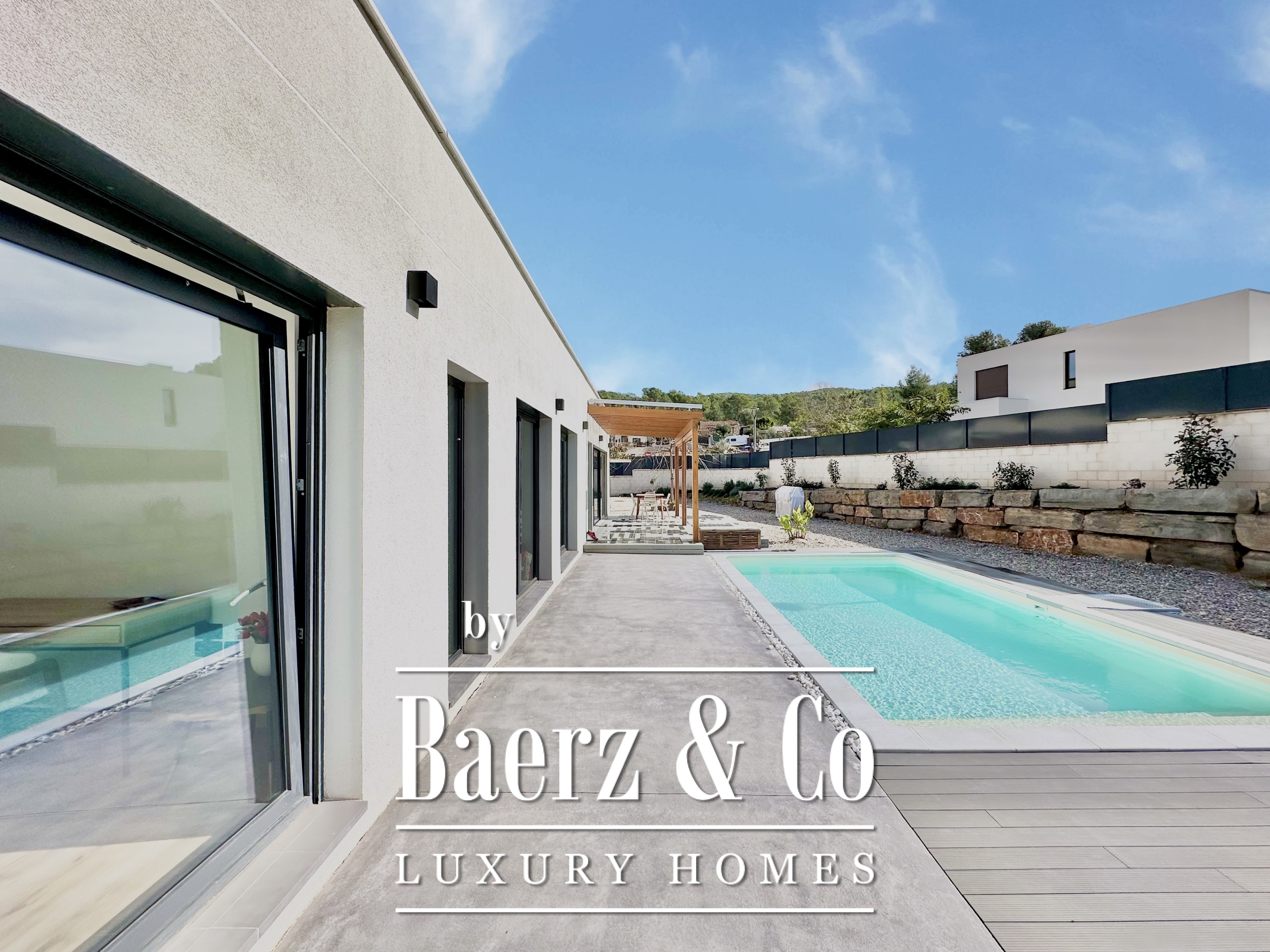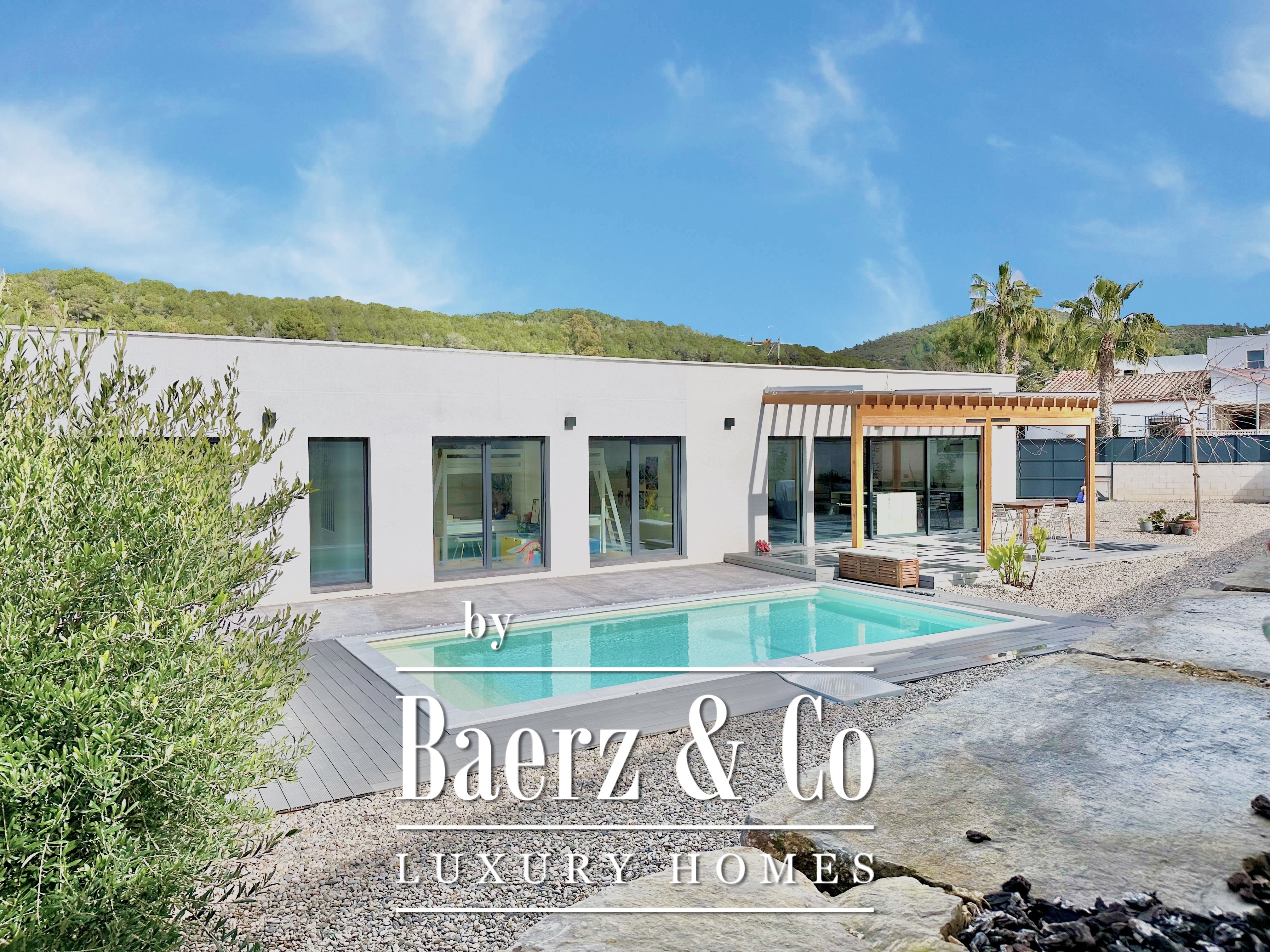 This modern villa Sitges is a newly completed, energy-efficient home designed with sustainability and contemporary minimalism at its core. Located in the tranquil Mas Alba area of Sitges, the property occupies an 860 m² double plot and offers 296 m² of living space, complemented by a 32 m² private pool and mountain views.