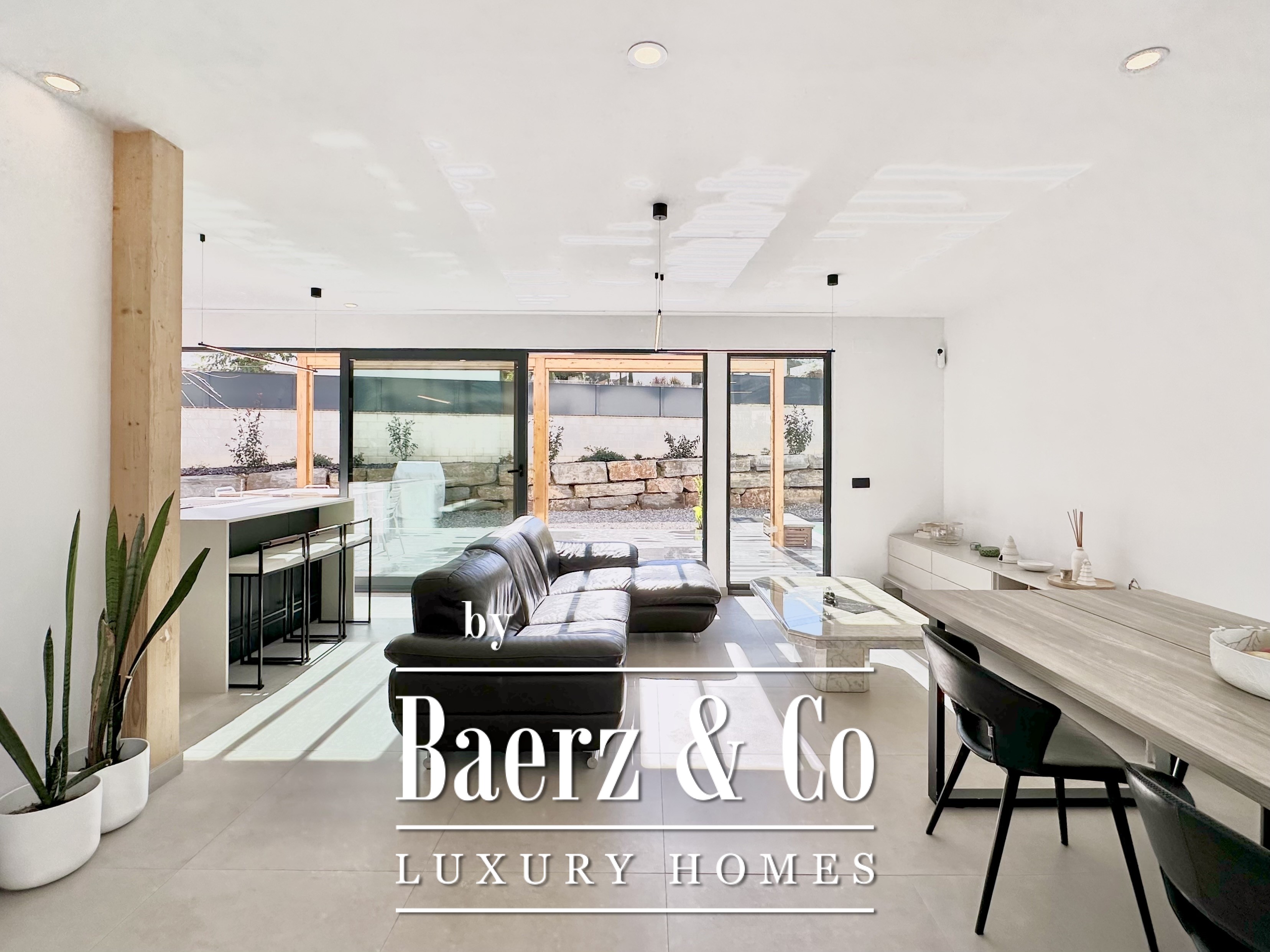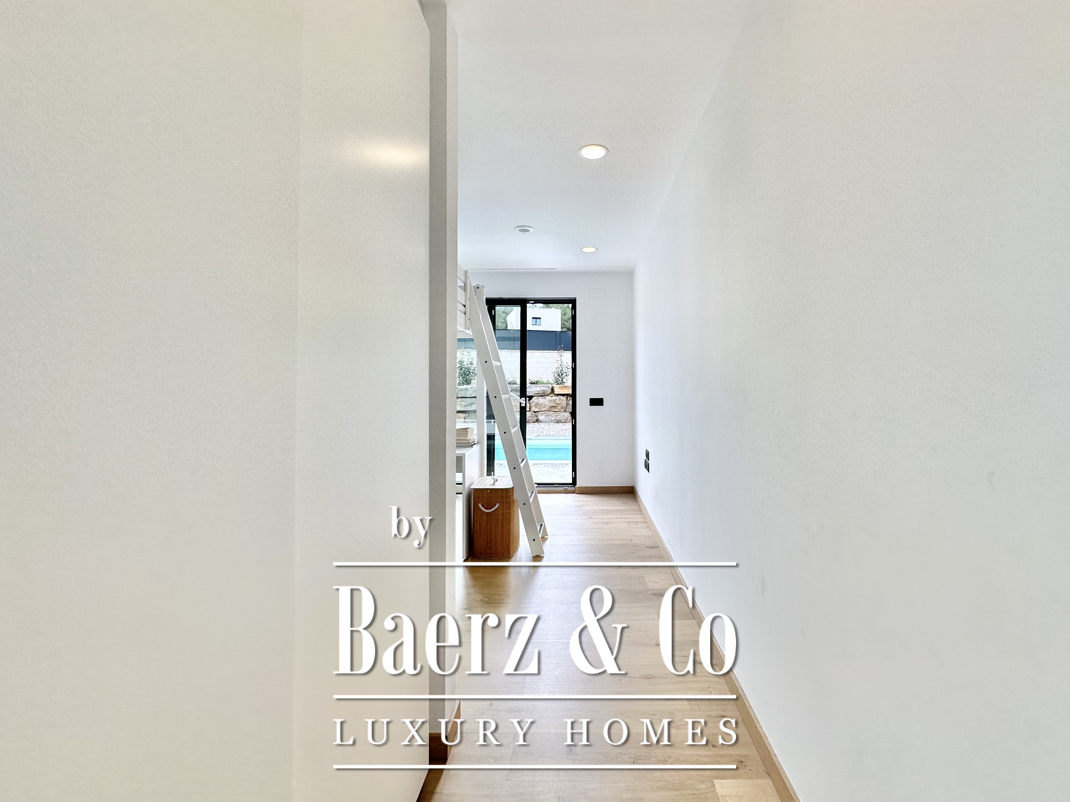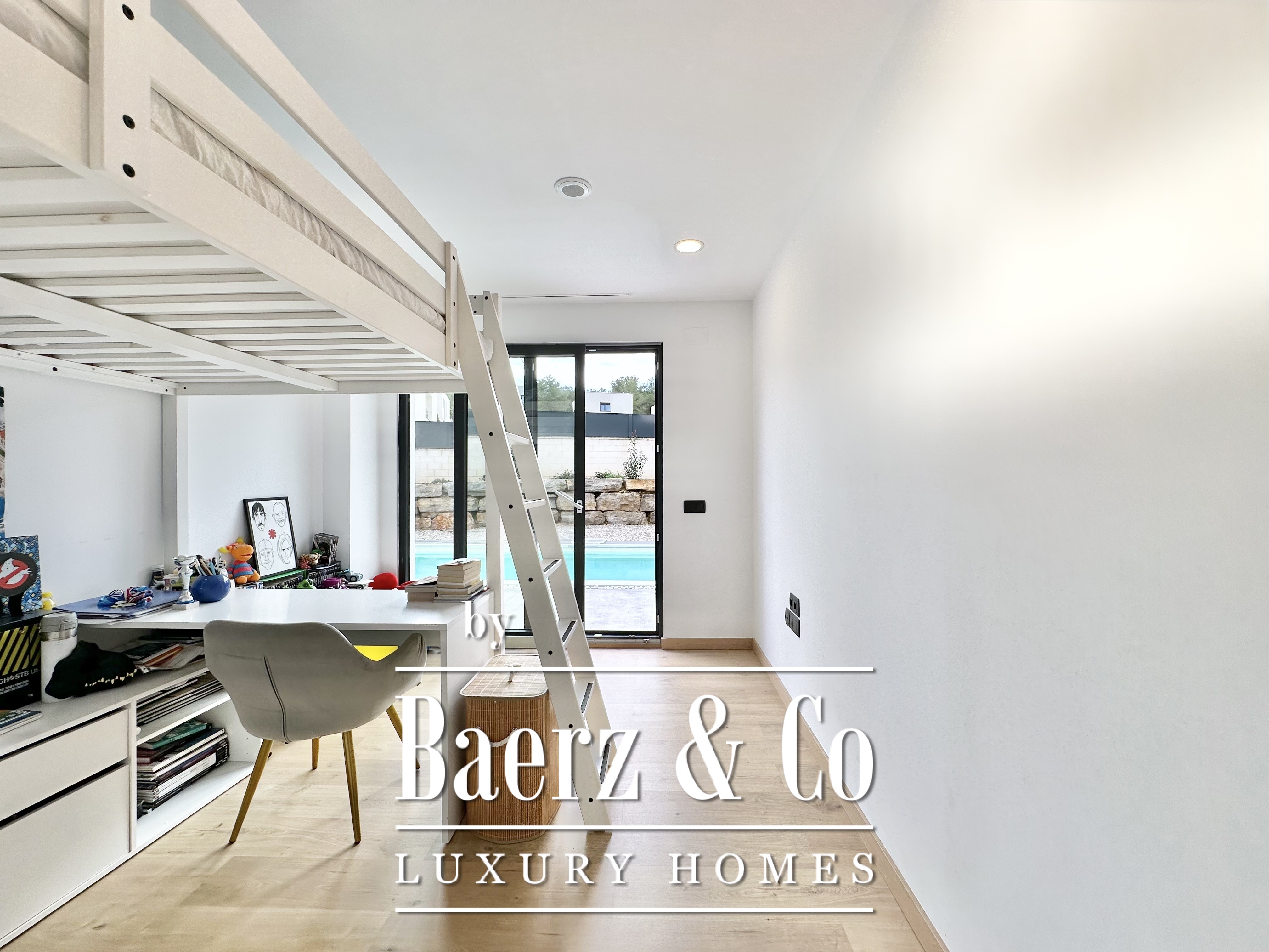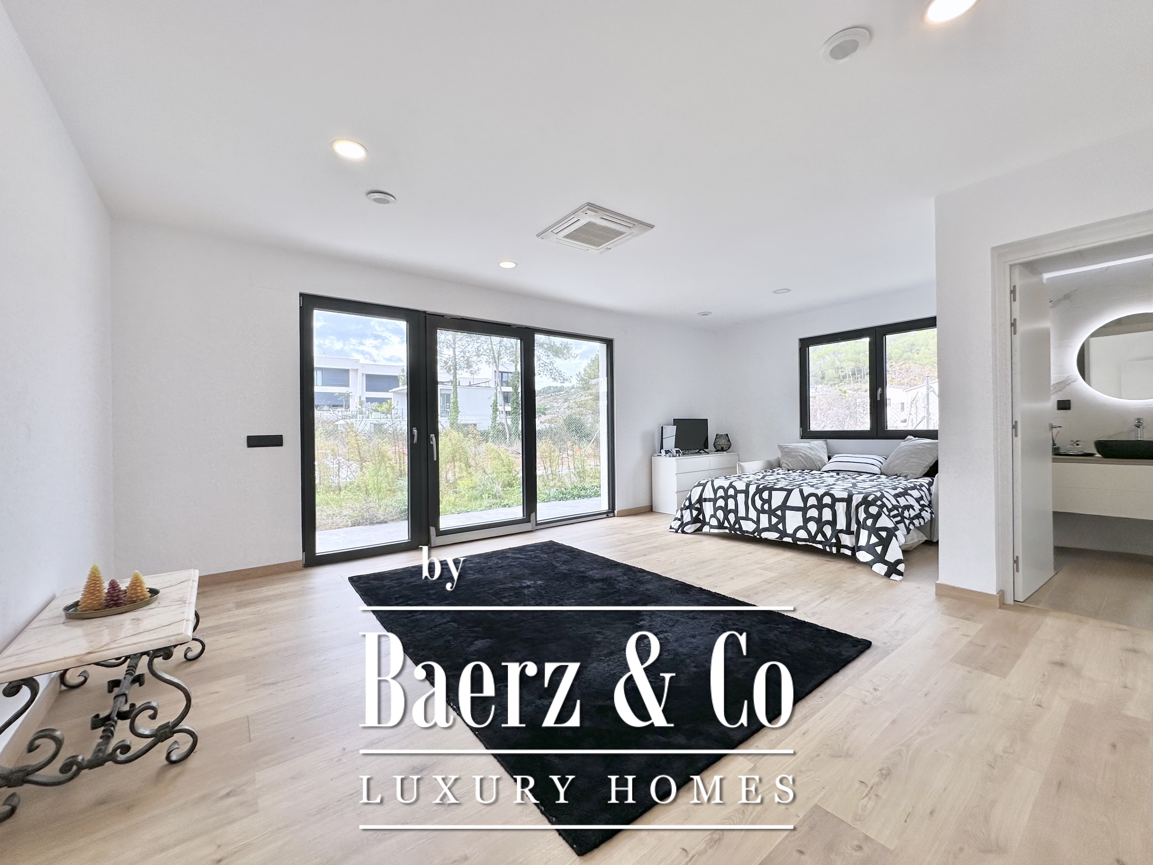 The layout is intentionally open and luminous. Floor-to-ceiling sliding glass doors in the spacious living and dining area connect seamlessly to the garden and pool, creating flow and bringing the outdoors into daily life. The modern, fully equipped kitchen is designed for both functionality and aesthetic clarity. Four bedrooms, including two en-suite, offer versatile accommodation. On the main floor, two double bedrooms share a full bath and open directly towards the pool, while the master suite features its own dressing room and private bathroom with garden views. On the lower floor, a guest suite and two large multipurpose rooms adapt to leisure, fitness, or work, alongside parking for two cars.