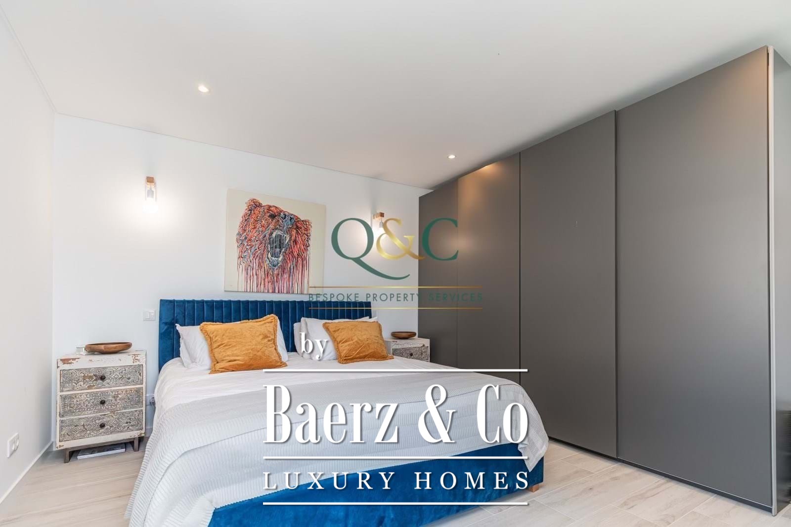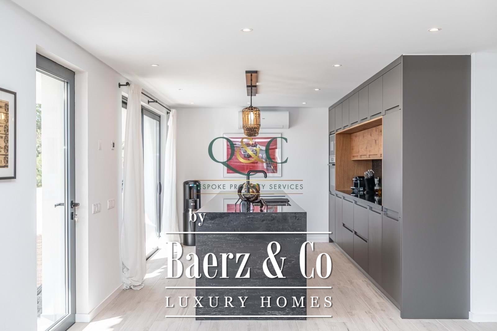 The luxury kitchen, with Bosch appliances, instant boiling water tap and 5cm granite worksurfaces, overlooks the pool, terrace and the sea beyond, and with underfloor heating to provide the perfect cooking environment. The living space with log burner enjoys the sea view, and the dining area overlooks the rear courtyard. The bright open-plan spaces combine to offer a serene connection with the beauty of the Algarve hillside.