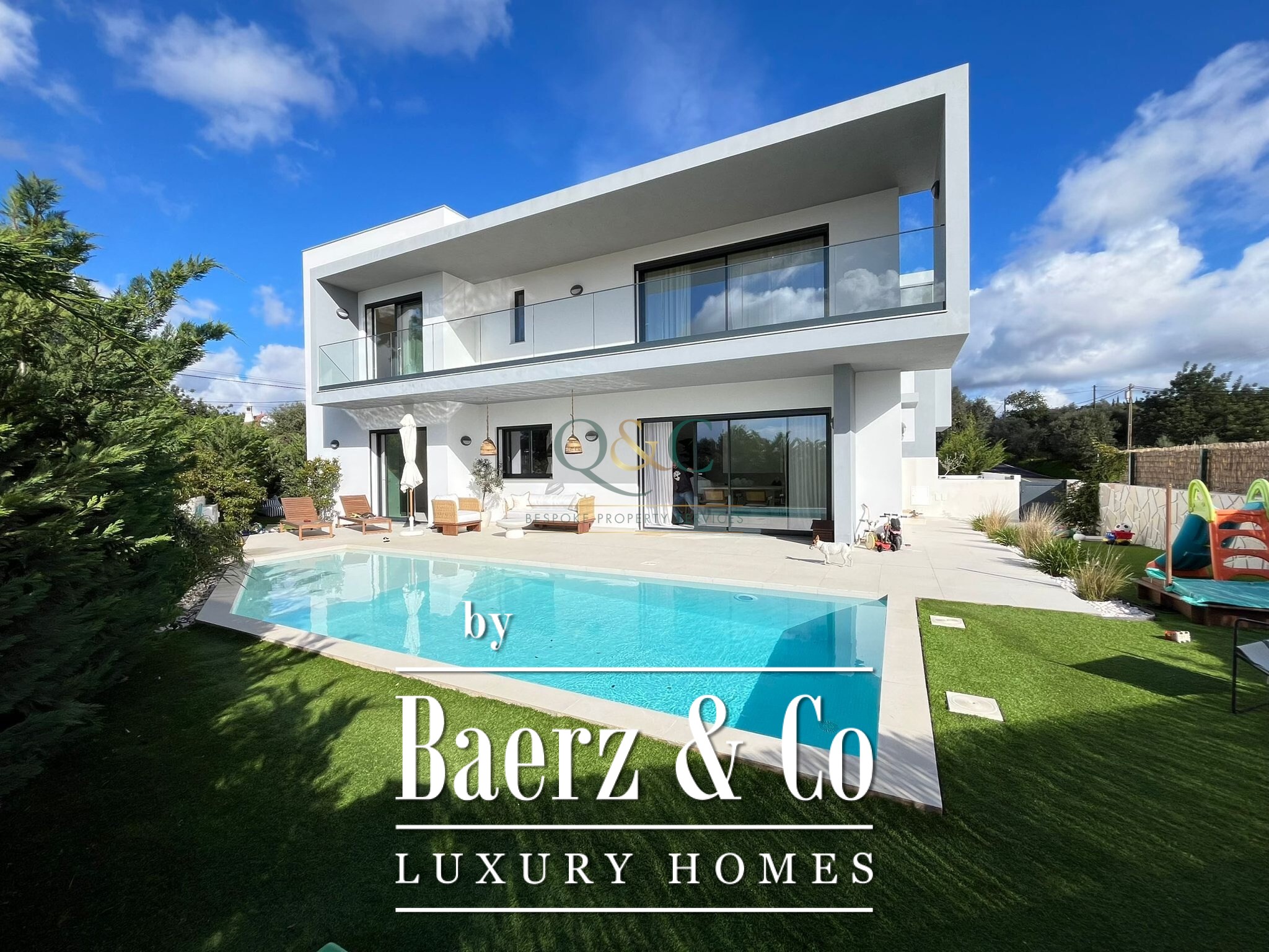 Contemporary house Santa Bárbara de Nexe presents a refined architectural approach, bringing together four bedrooms and three bathrooms across a living area of 273 m². From the moment of arrival, two private parking spaces in the basement provide direct, discrete access to the heart of the house.