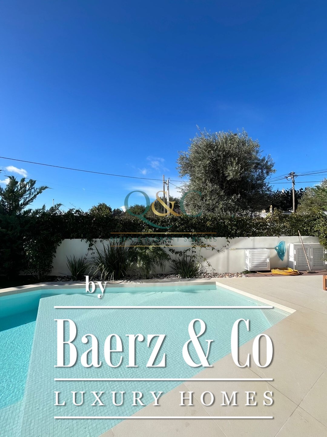 On the ground floor, an open living and dining room with an ethanol marble fireplace creates a soft rhythm between interior space and sunlight, complemented by central air conditioning. The open-plan kitchen, laundry, and pantry support daily living, while the patio invites relaxation beside the chlorine pool and a garden shaped for quiet enjoyment. Almost every room is oriented south and benefits from abundant natural light.