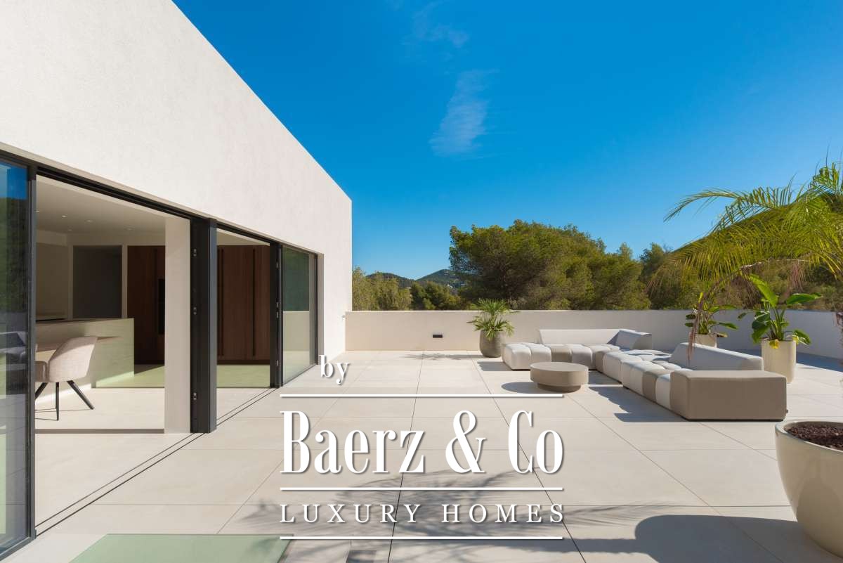 for a sophisticated touch. The master bedroom has its own private terrace, providing a peaceful retreat where you can enjoy the stunning views and surrounding nature. Thanks to its smart design, the villa offers a perfect balance between privacy and open living areas, making it an ideal home for both family life and relaxation.The property is equipped with modern technology and high-end features, including air conditioning, central heating, and a security system, ensuring maximum comfort throughout the year. The combination of stylish architecture, premium finishes, and a functional layout makes Casa Llisa a unique villa in one of the most desirable locations on the island.Outdoor Living in Style: A Garden and Terraces Designed for EnjoymentThe outdoor space of Casa Llisa is designed for relaxation and comfort. The villa is set on a beautiful plot surrounded by Mediterranean plants and palm trees, creating a serene and private atmosphere. The highlight of the outdoor area is the spacious swimming pool, perfect for a refreshing dip on warm summer days. Around the pool, sun loungers and lounge areas provide the perfect spot to relax in the sun or shade.The villa boasts multiple large terraces, ideal for alfresco dining, entertaining guests, or simply enjoying the peace and privacy of the surroundings. The covered outdoor space ensures that you can enjoy Ibiza’s pleasant climate all year round.Additionally, Casa Llisa offers a large garage and ample parking space on the property, providing extra convenience and security. The villa is also equipped with sustainable features, allowing you to enjoy luxury living in an eco-friendly way.Whether you are looking for a permanent residence, a holiday home, or a valuable investment, this villa in Roca Llisa has everything you need for a carefree and comfortable life in Ibiza.