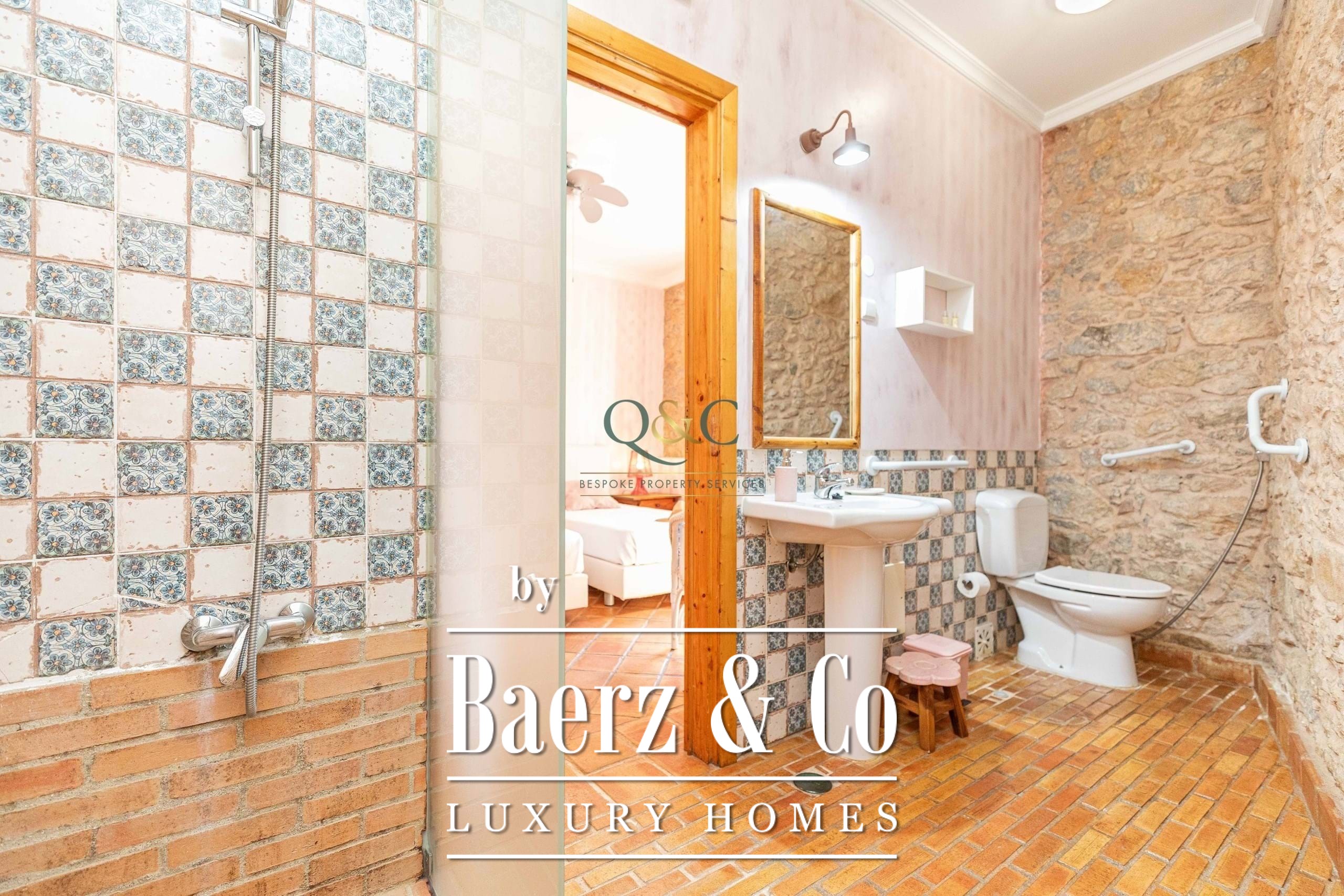 The right wing offers another equipped kitchen, dining room and living room with a cosy fireplace, three additional bedrooms, three bathrooms and plenty of storage space. The high ceilings with natural stone details create an inviting space.