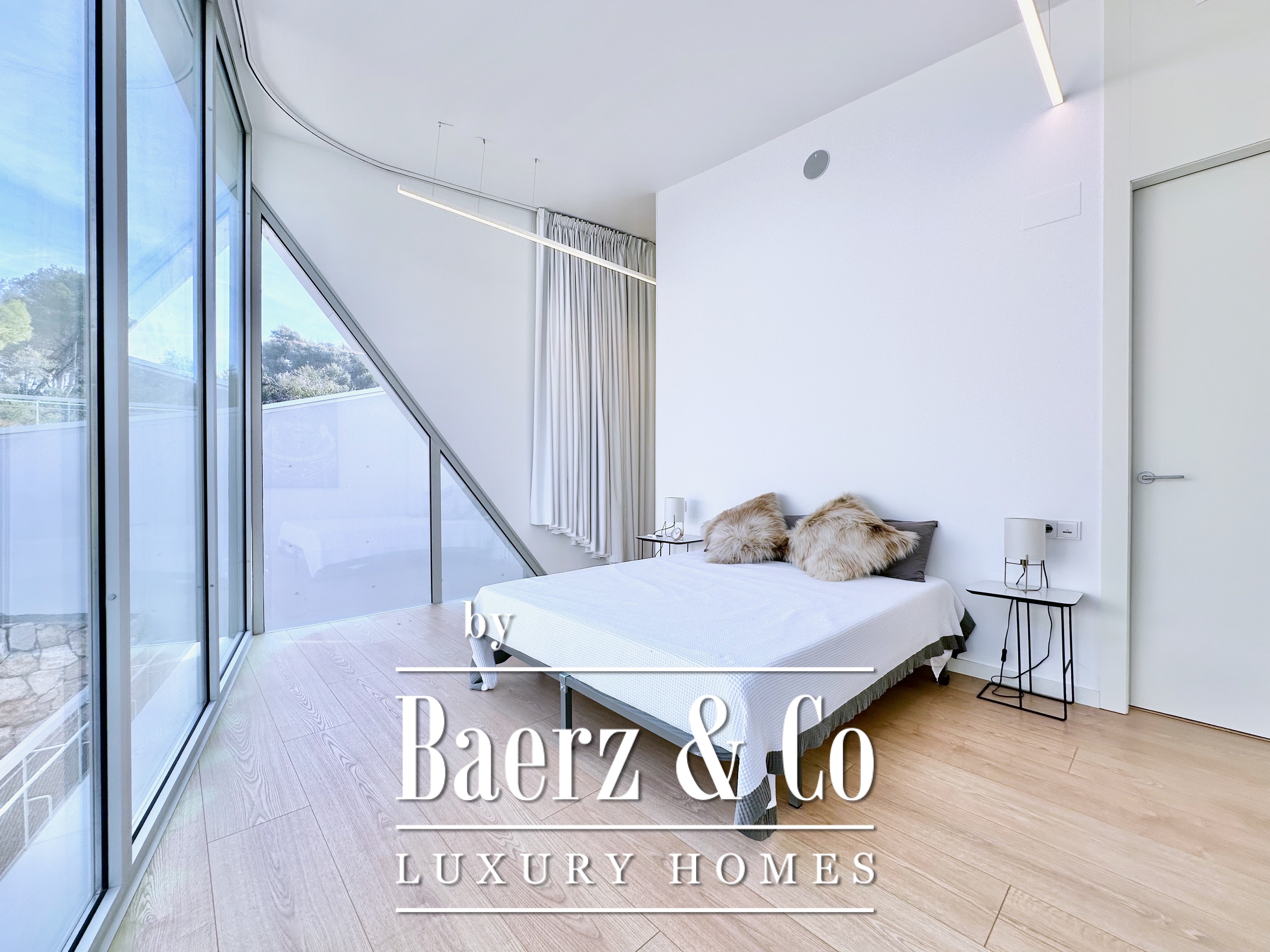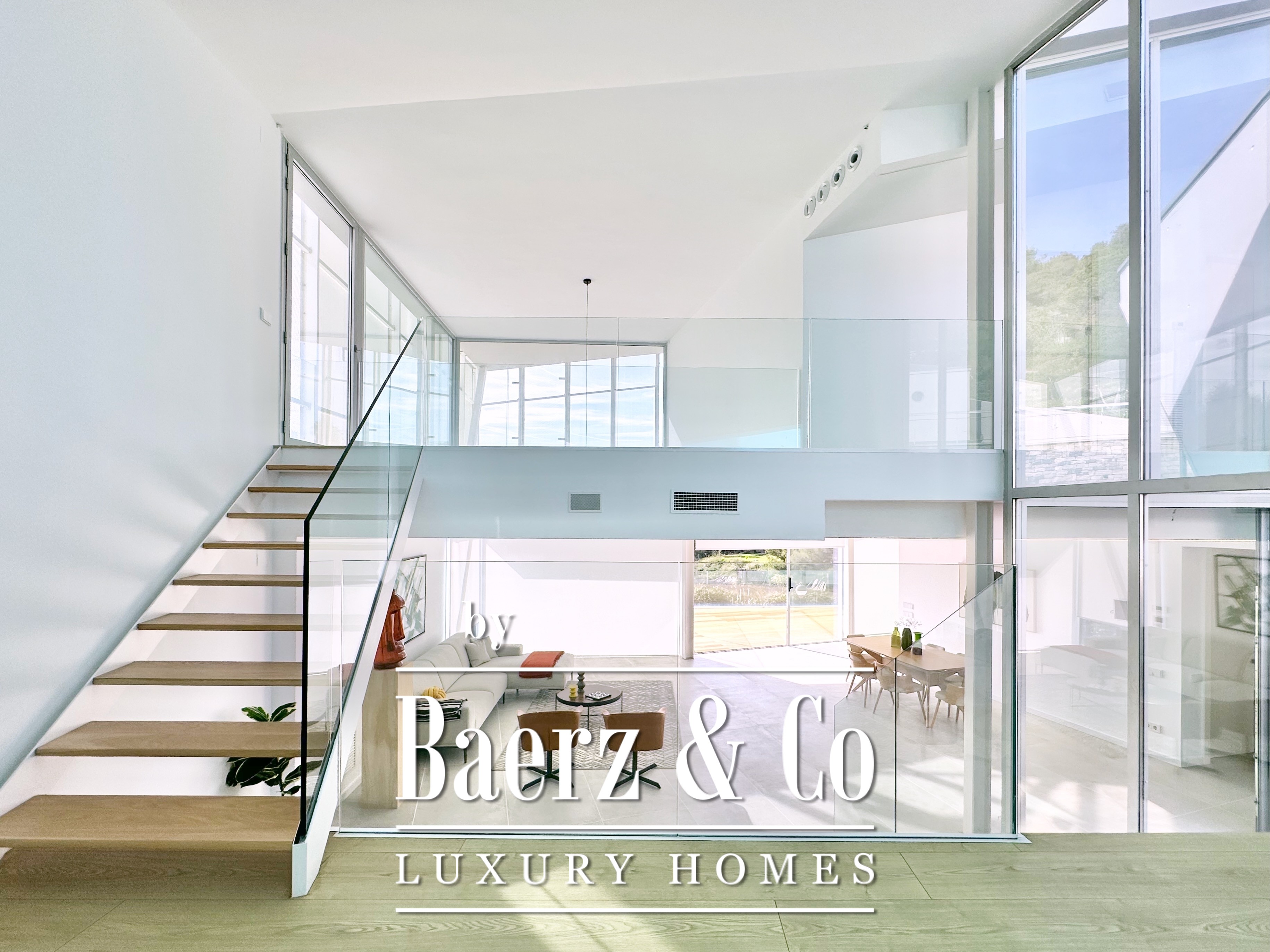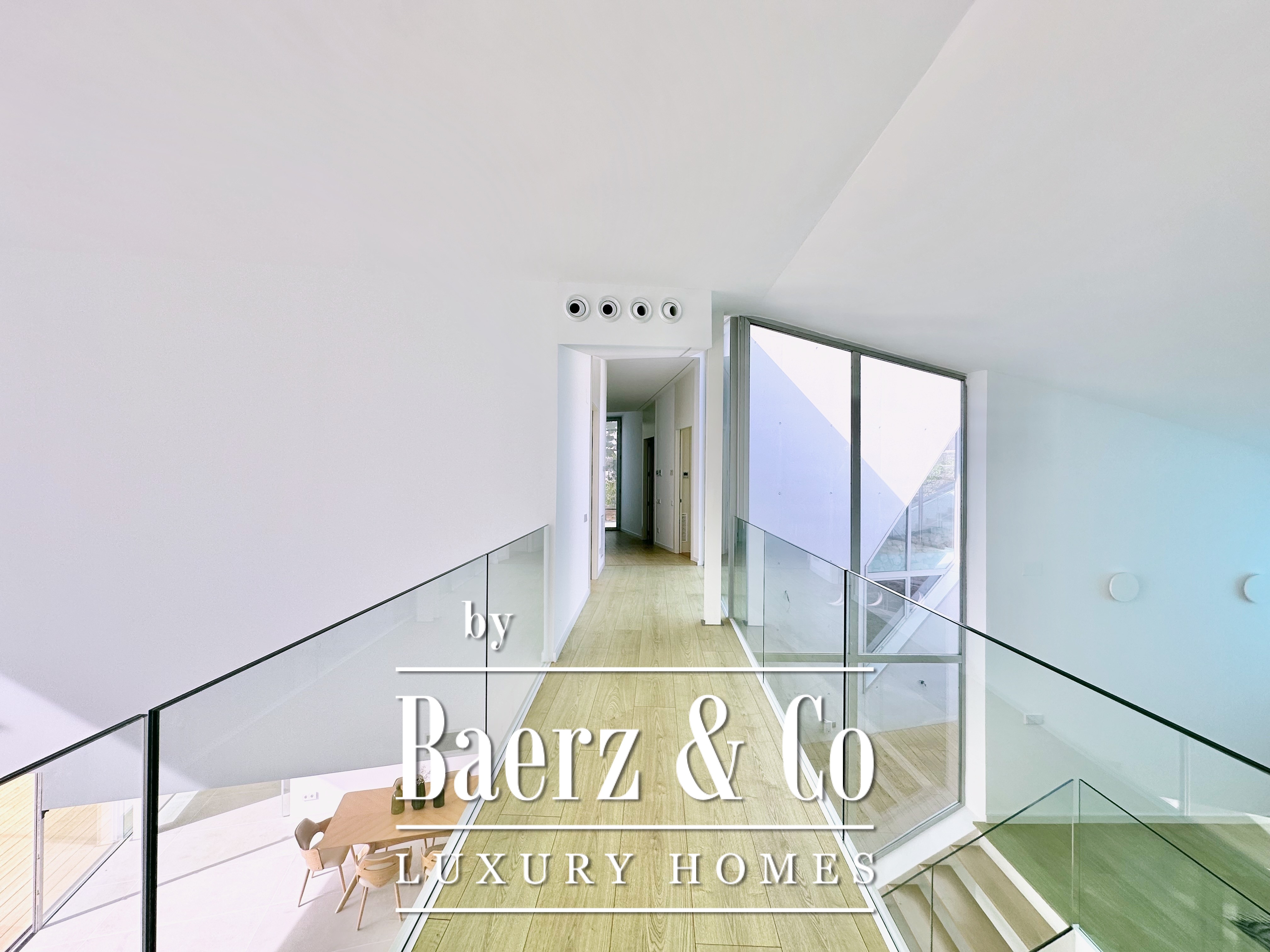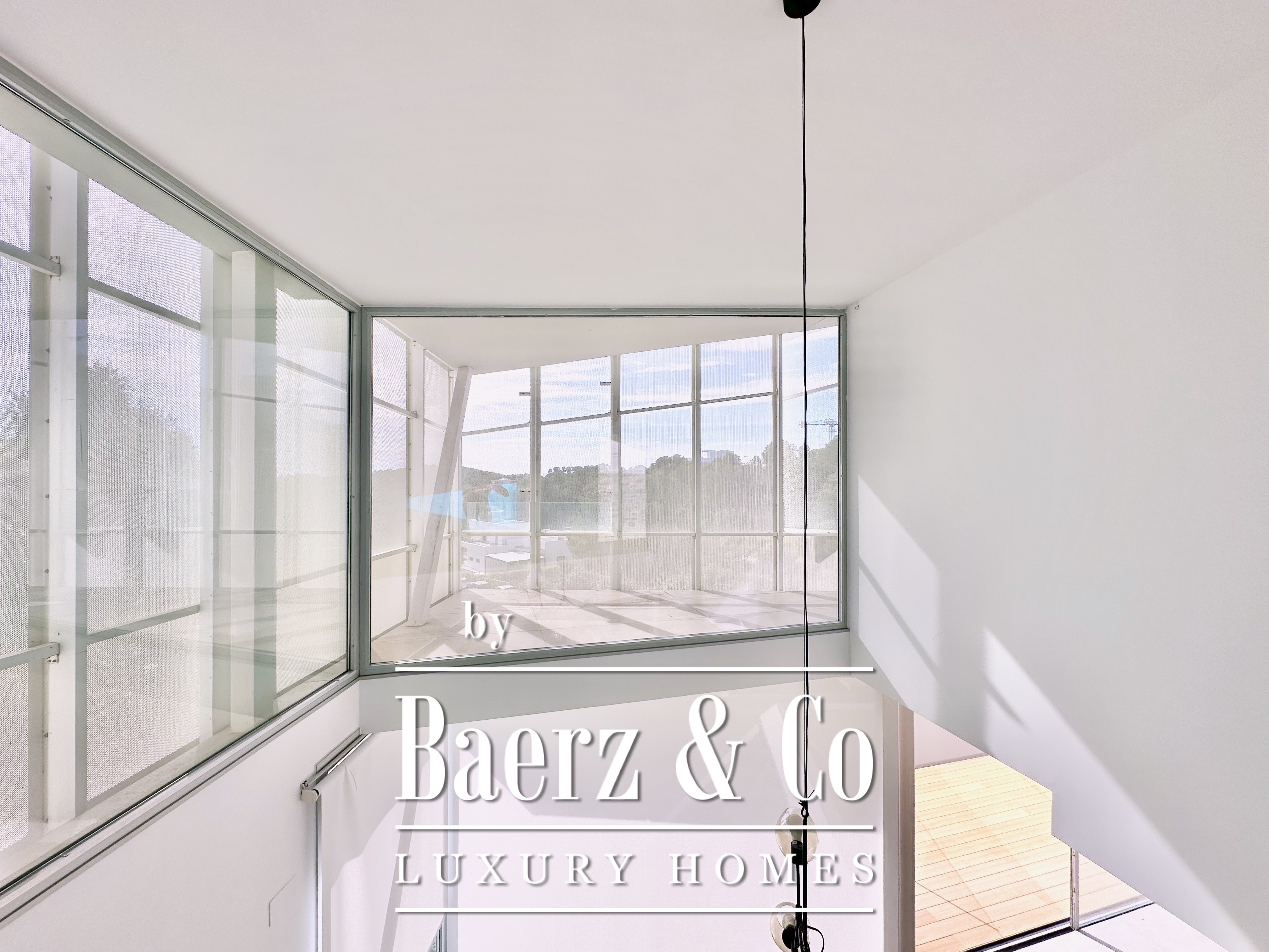 Ascending above the living space, a suspended walkway leads to three double bedrooms, two with private bathrooms. Each room connects to a terrace filtered by metal latticework, balancing openness with privacy. This contemporary villa for sale in Sitges merges architectural precision with an elevated coastal experience.