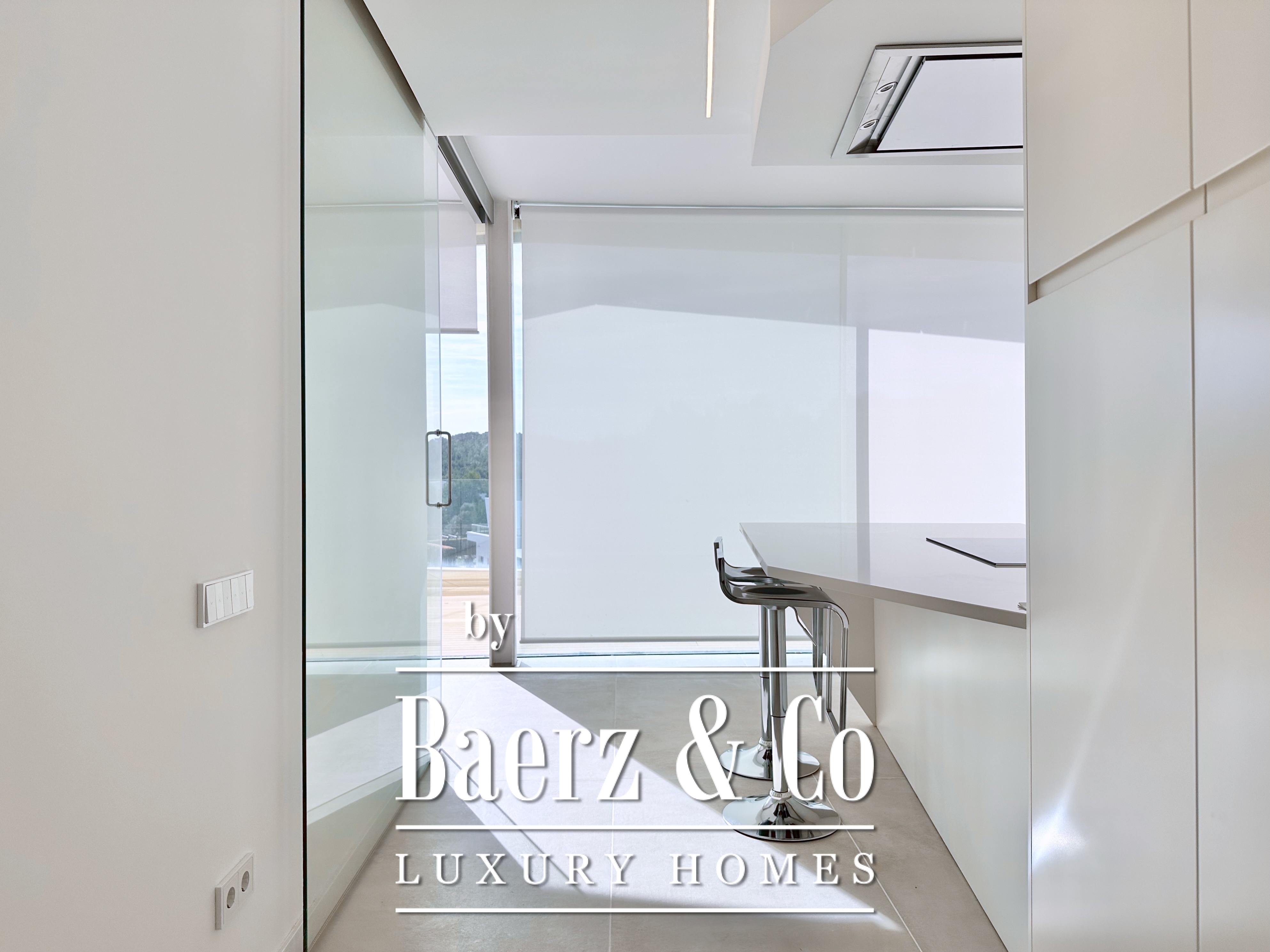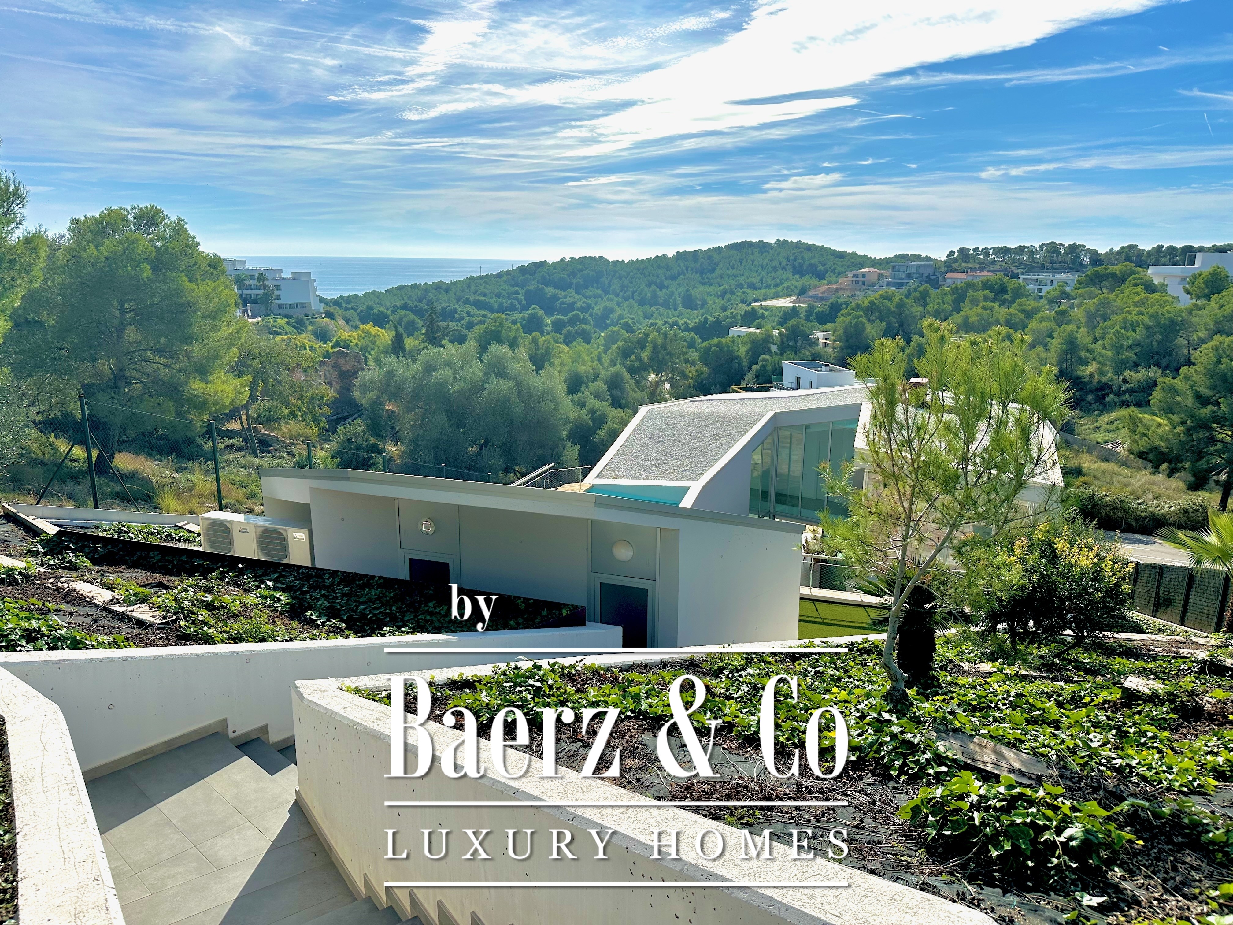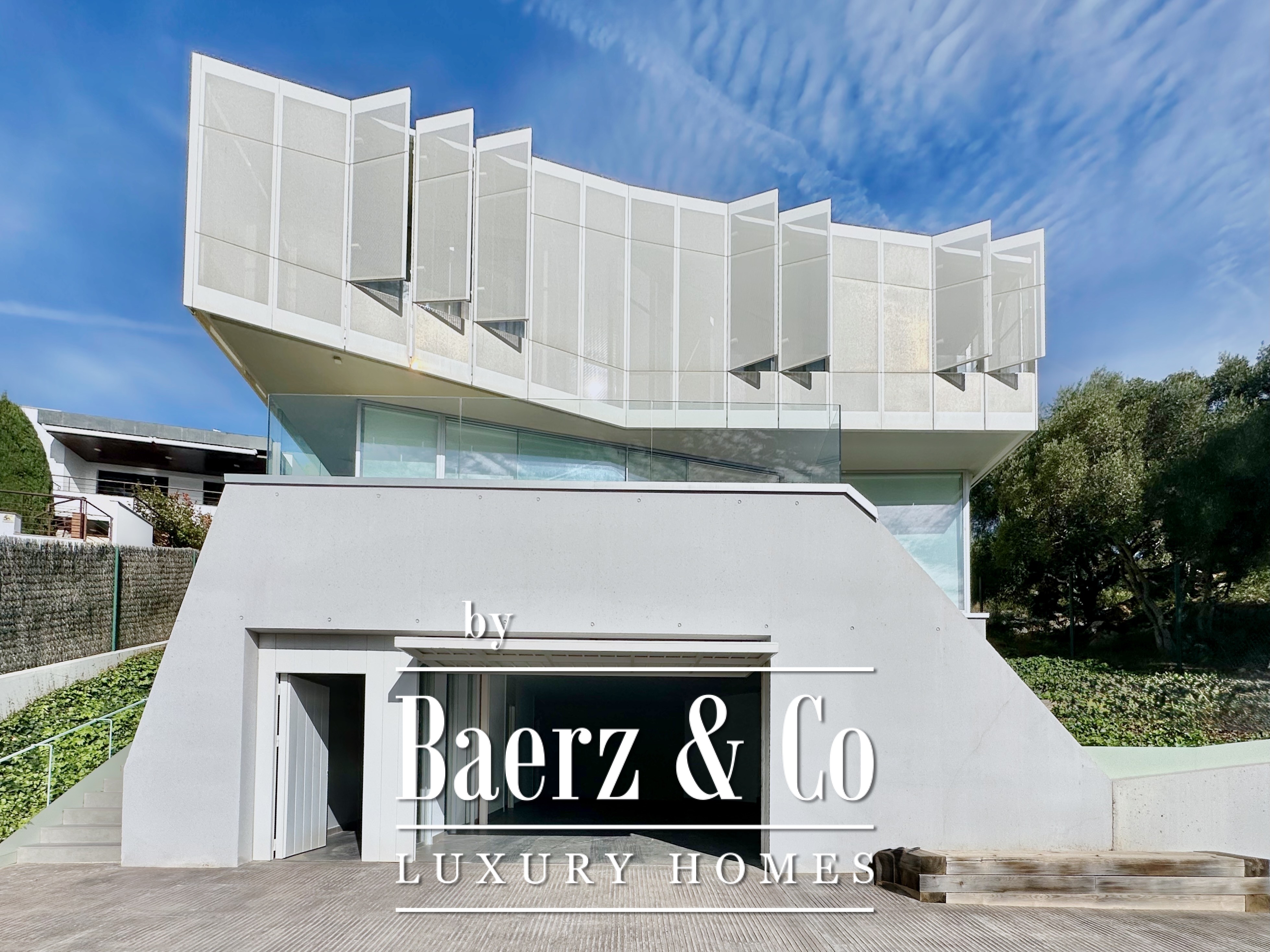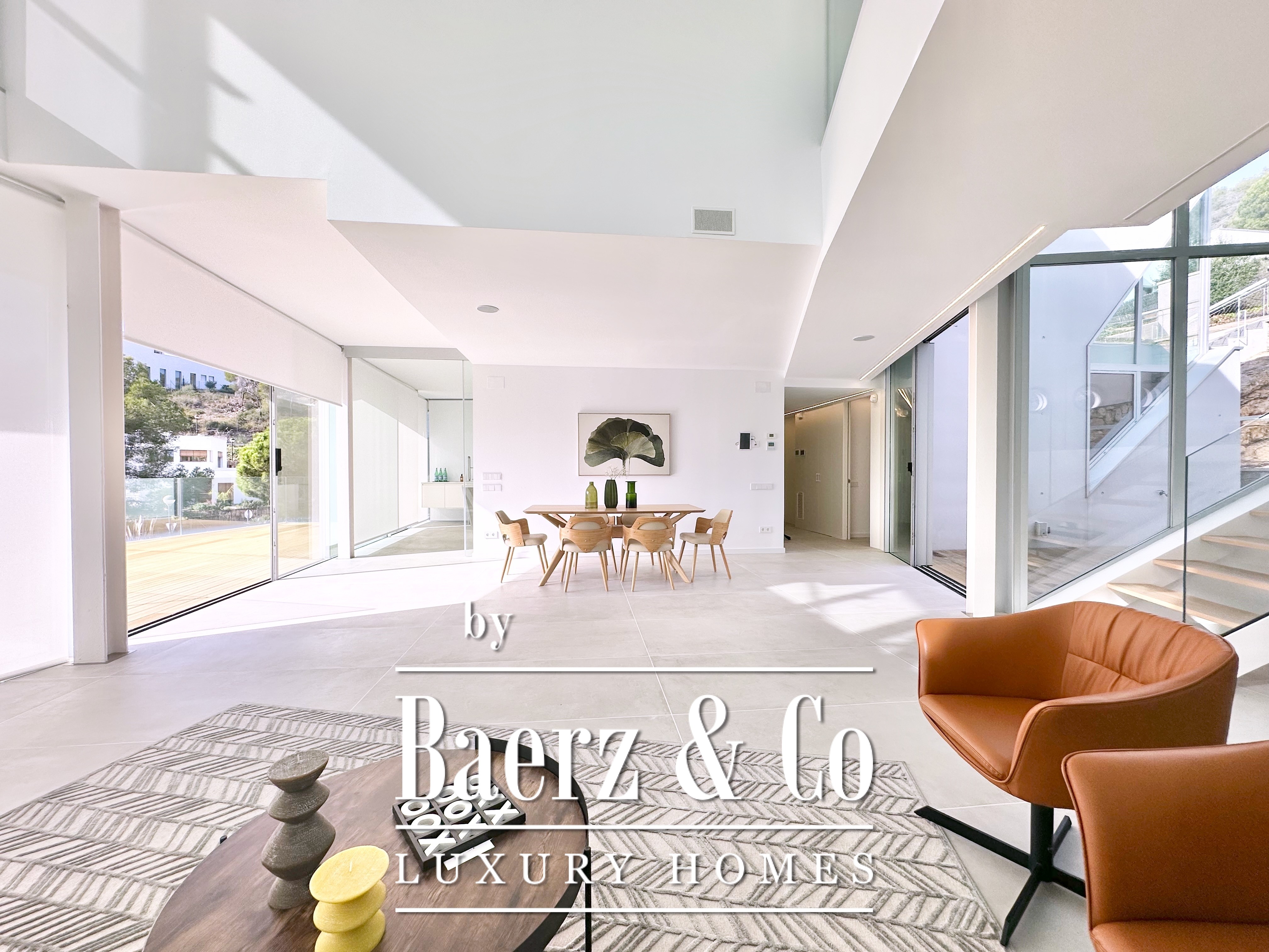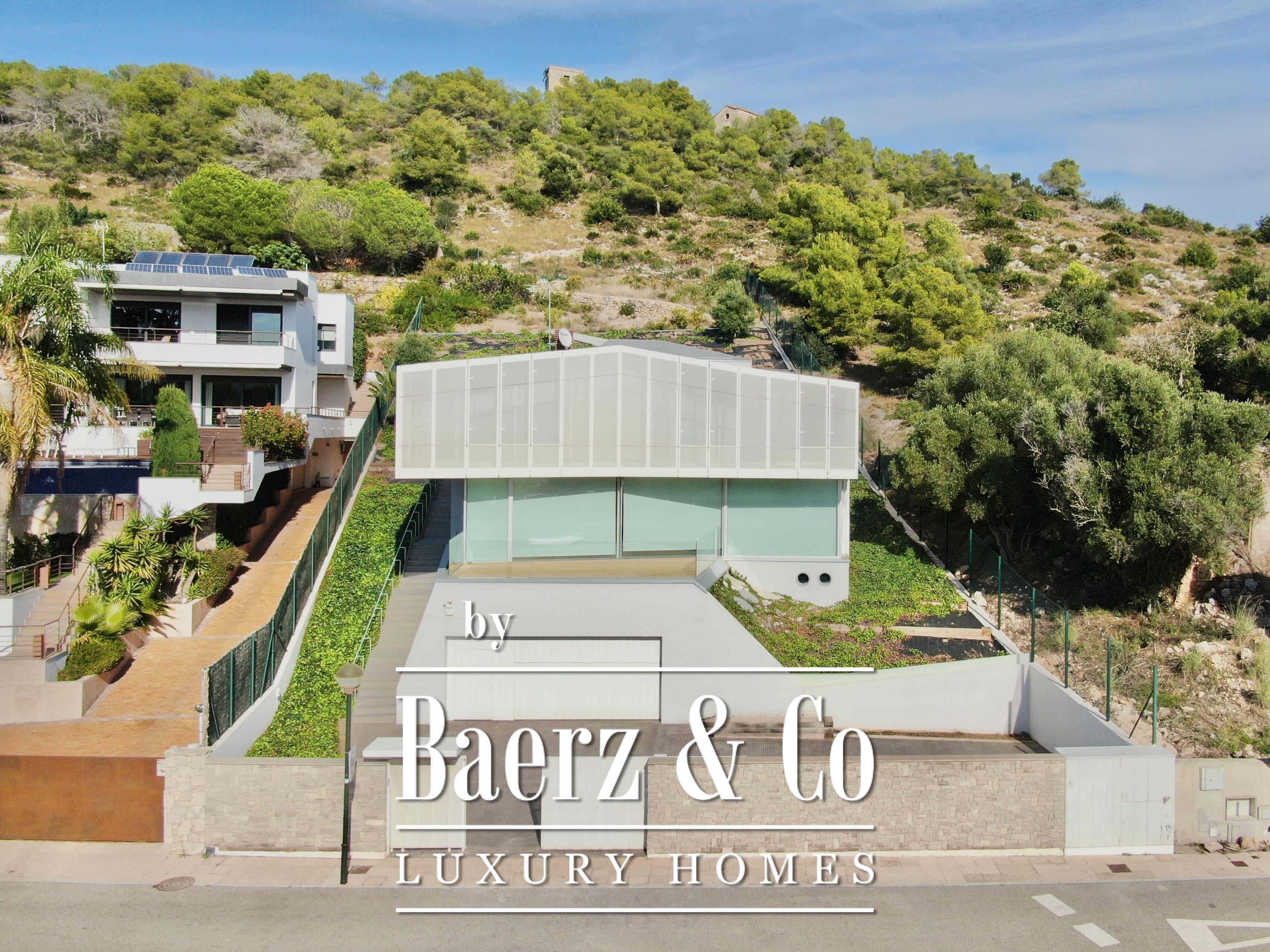 Ascending above the living space, a suspended walkway leads to three double bedrooms, two with private bathrooms. Each room connects to a terrace filtered by metal latticework, balancing openness with privacy. This contemporary villa for sale in Sitges merges architectural precision with an elevated coastal experience.