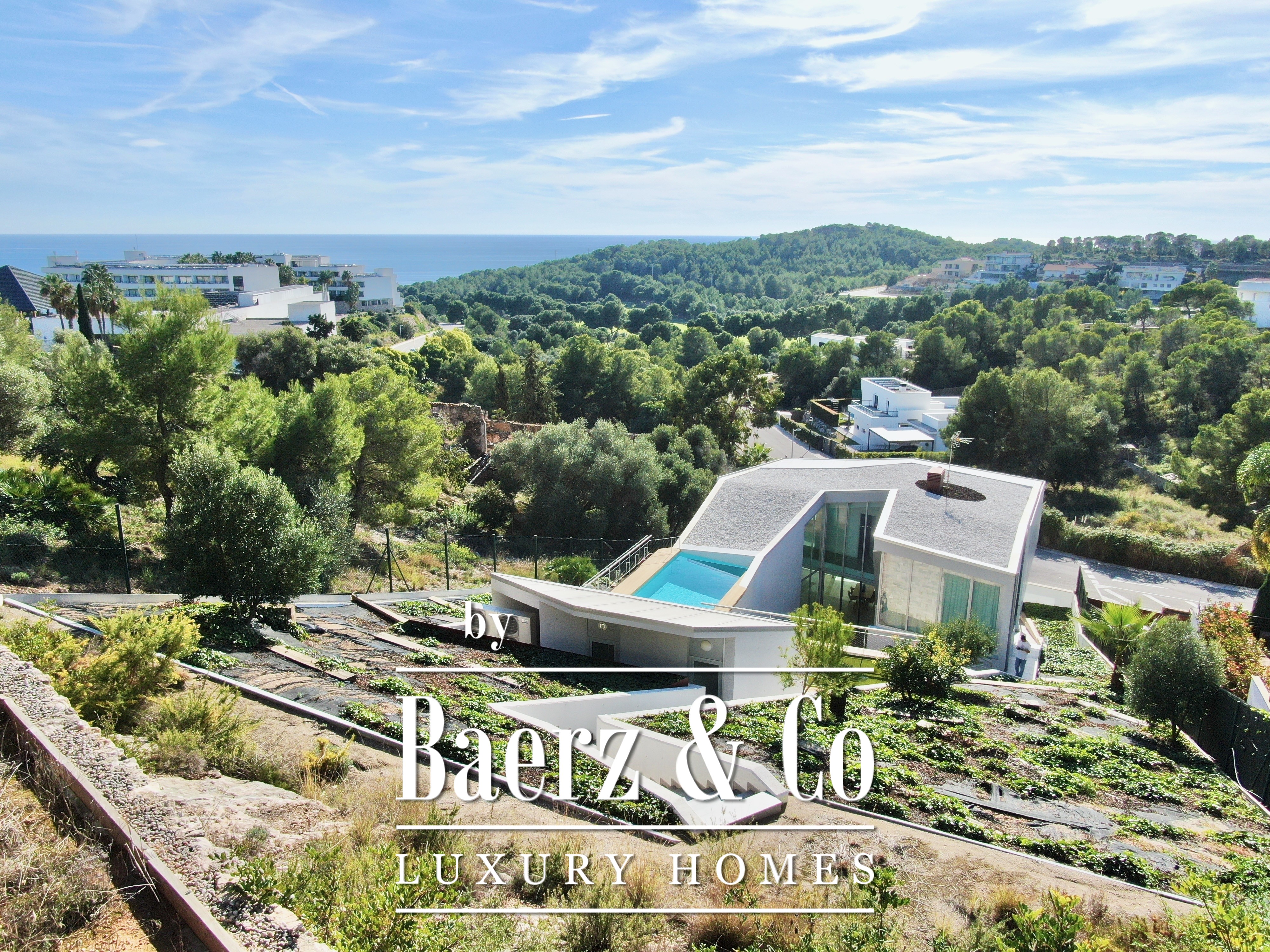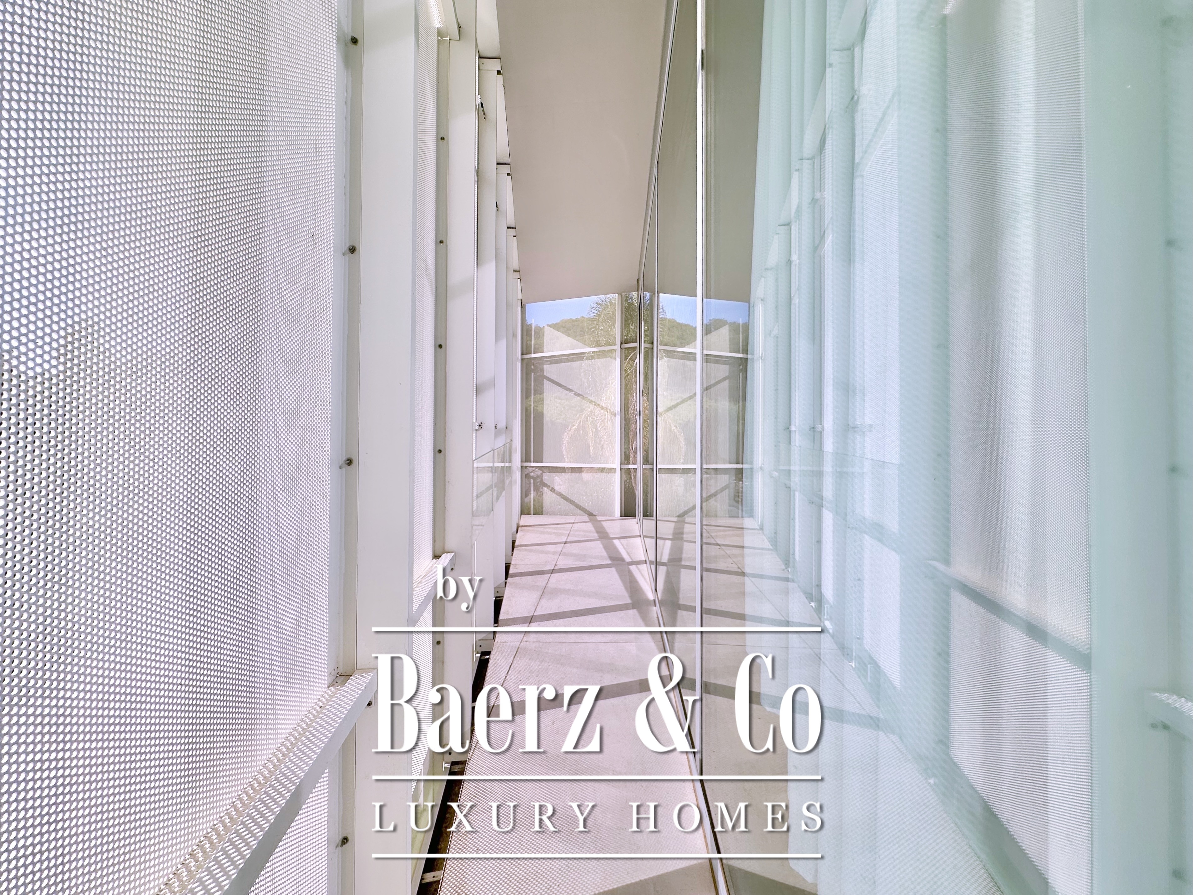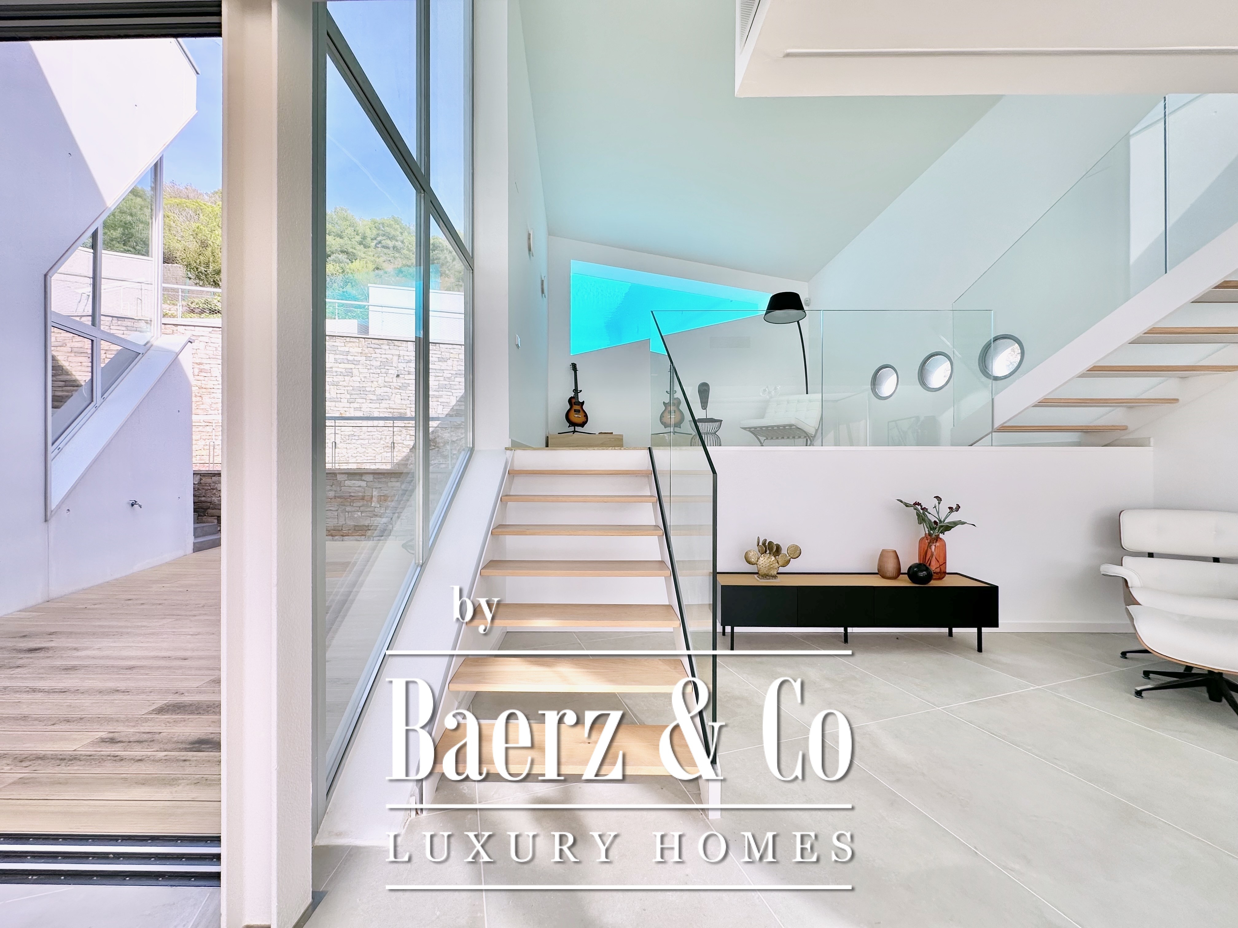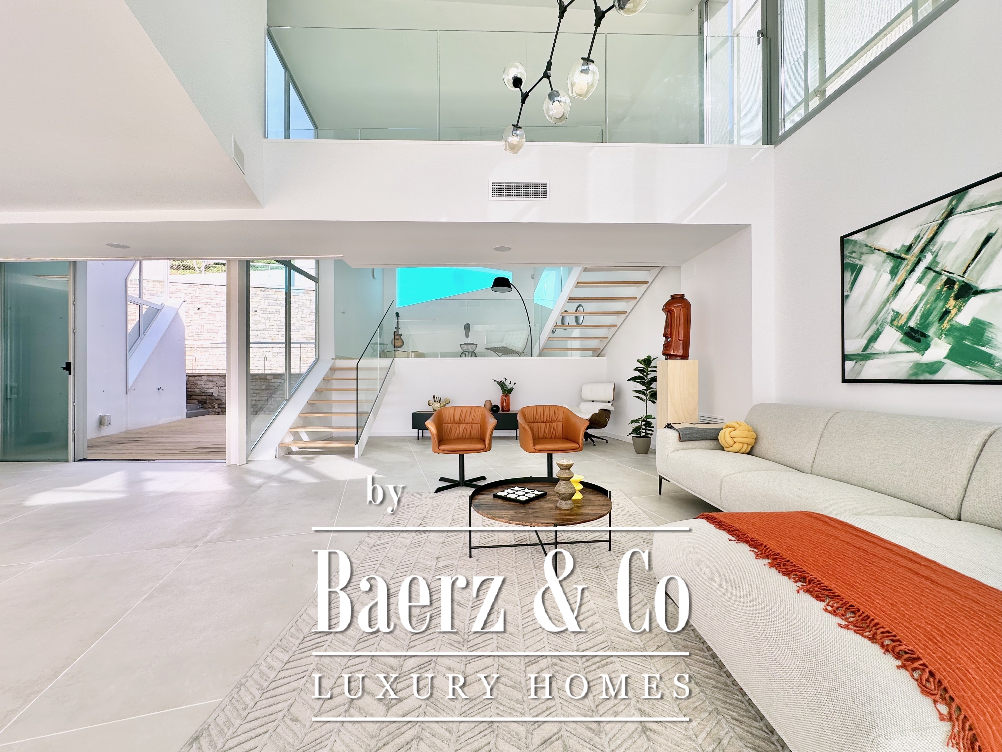 Ascending above the living space, a suspended walkway leads to three double bedrooms, two with private bathrooms. Each room connects to a terrace filtered by metal latticework, balancing openness with privacy. This contemporary villa for sale in Sitges merges architectural precision with an elevated coastal experience.