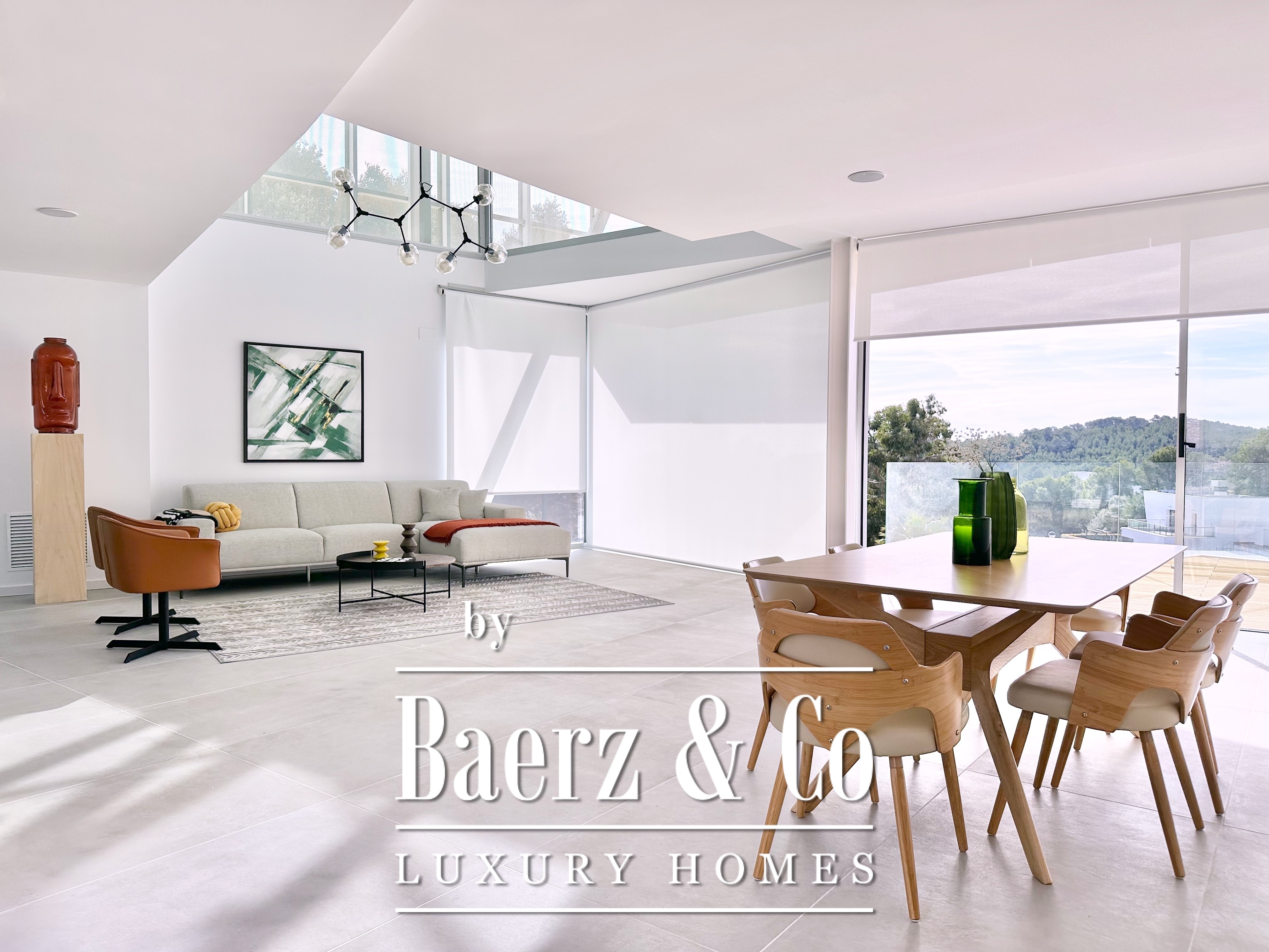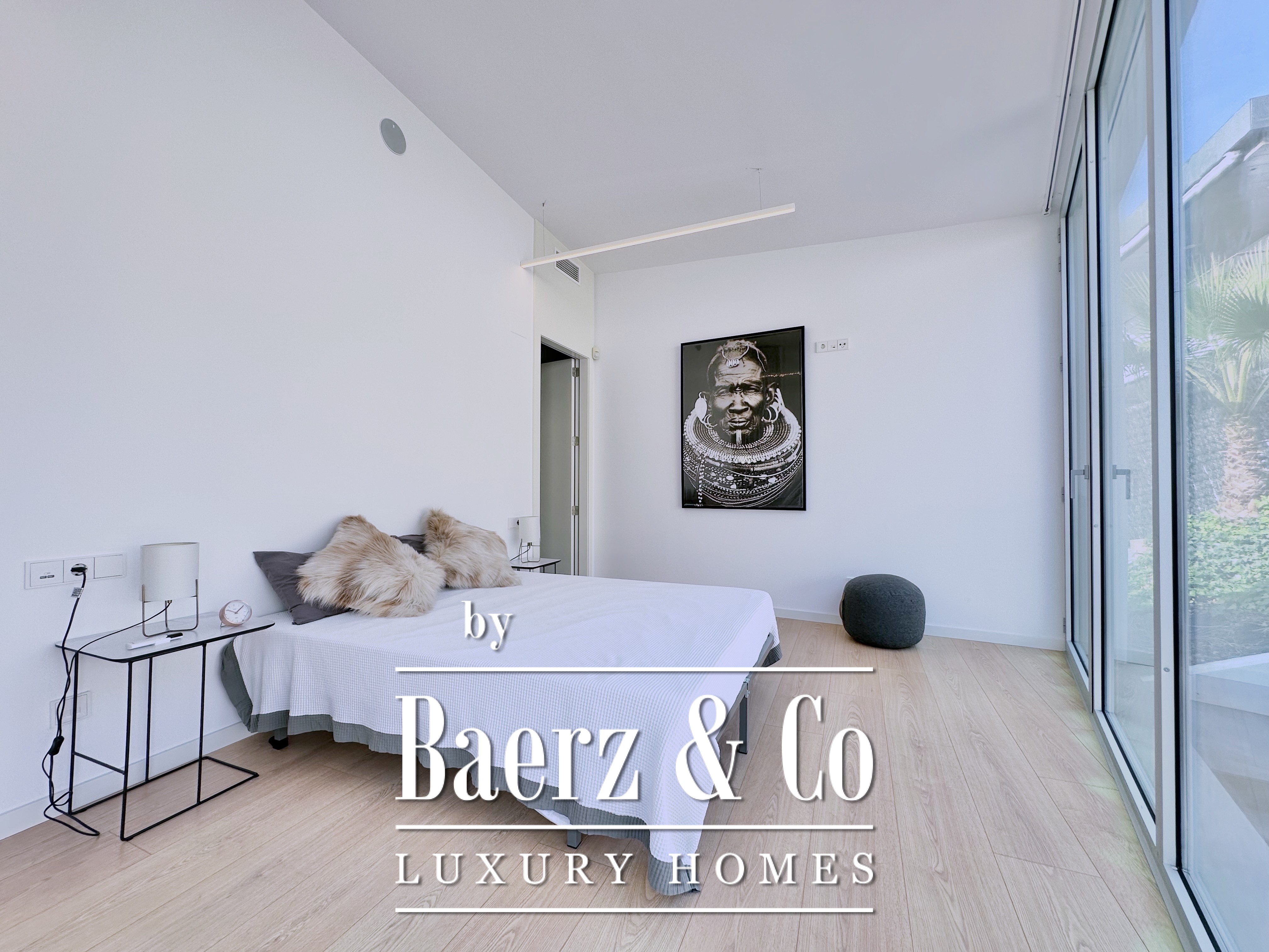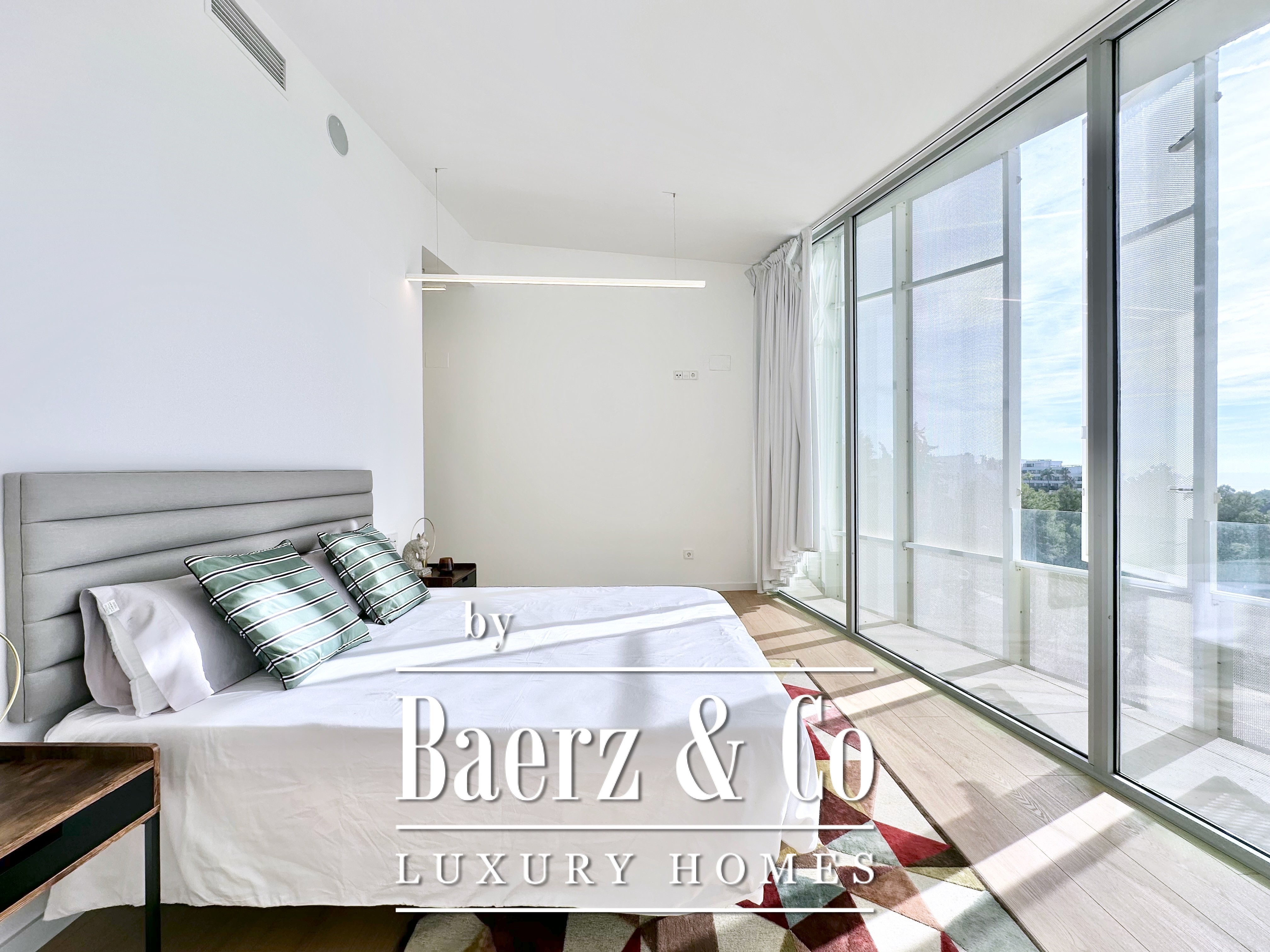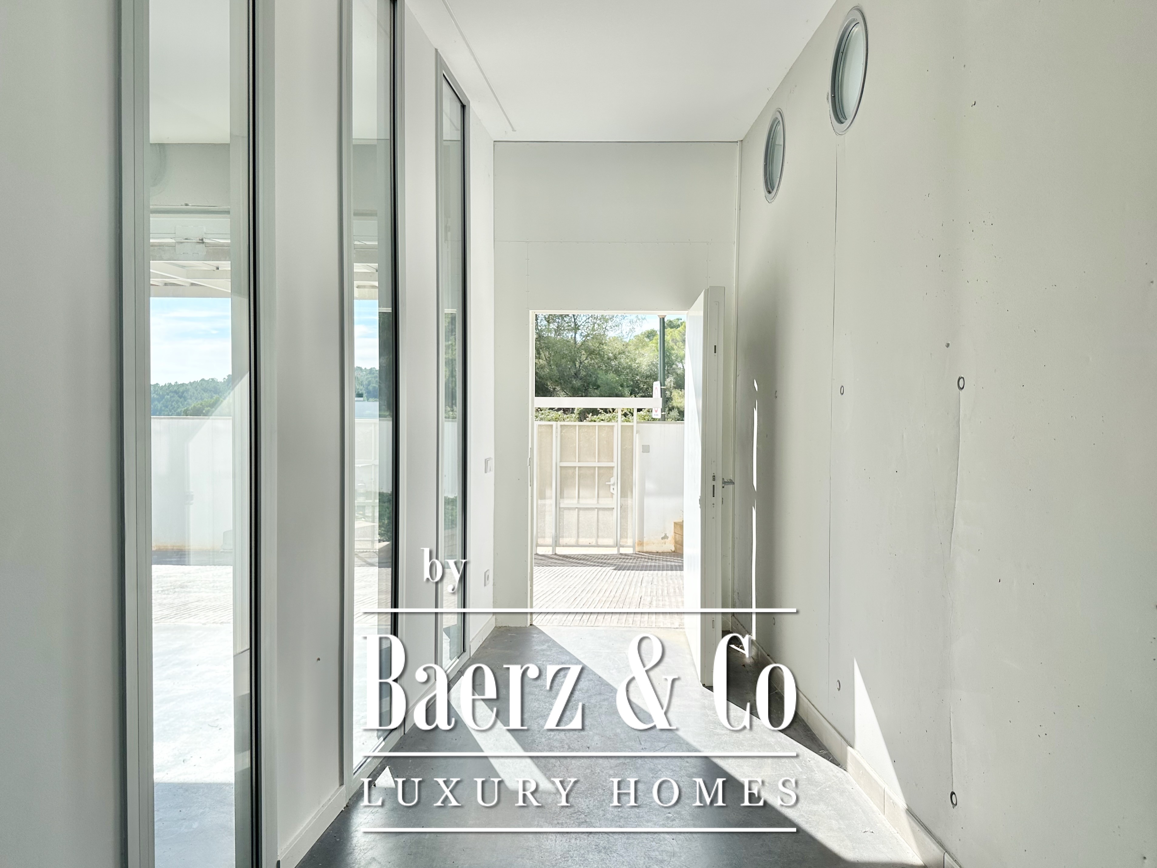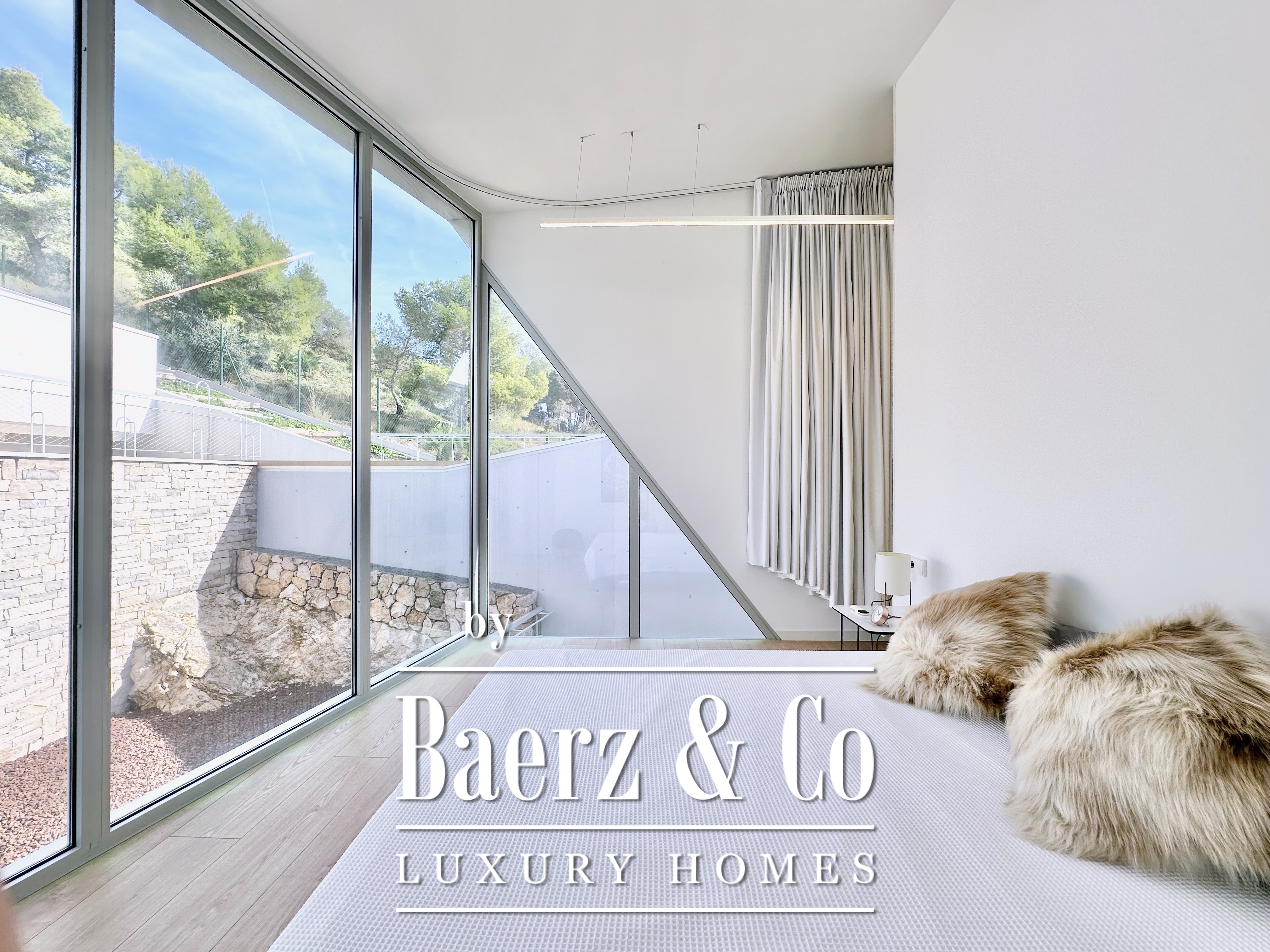 Ascending above the living space, a suspended walkway leads to three double bedrooms, two with private bathrooms. Each room connects to a terrace filtered by metal latticework, balancing openness with privacy. This contemporary villa for sale in Sitges merges architectural precision with an elevated coastal experience.