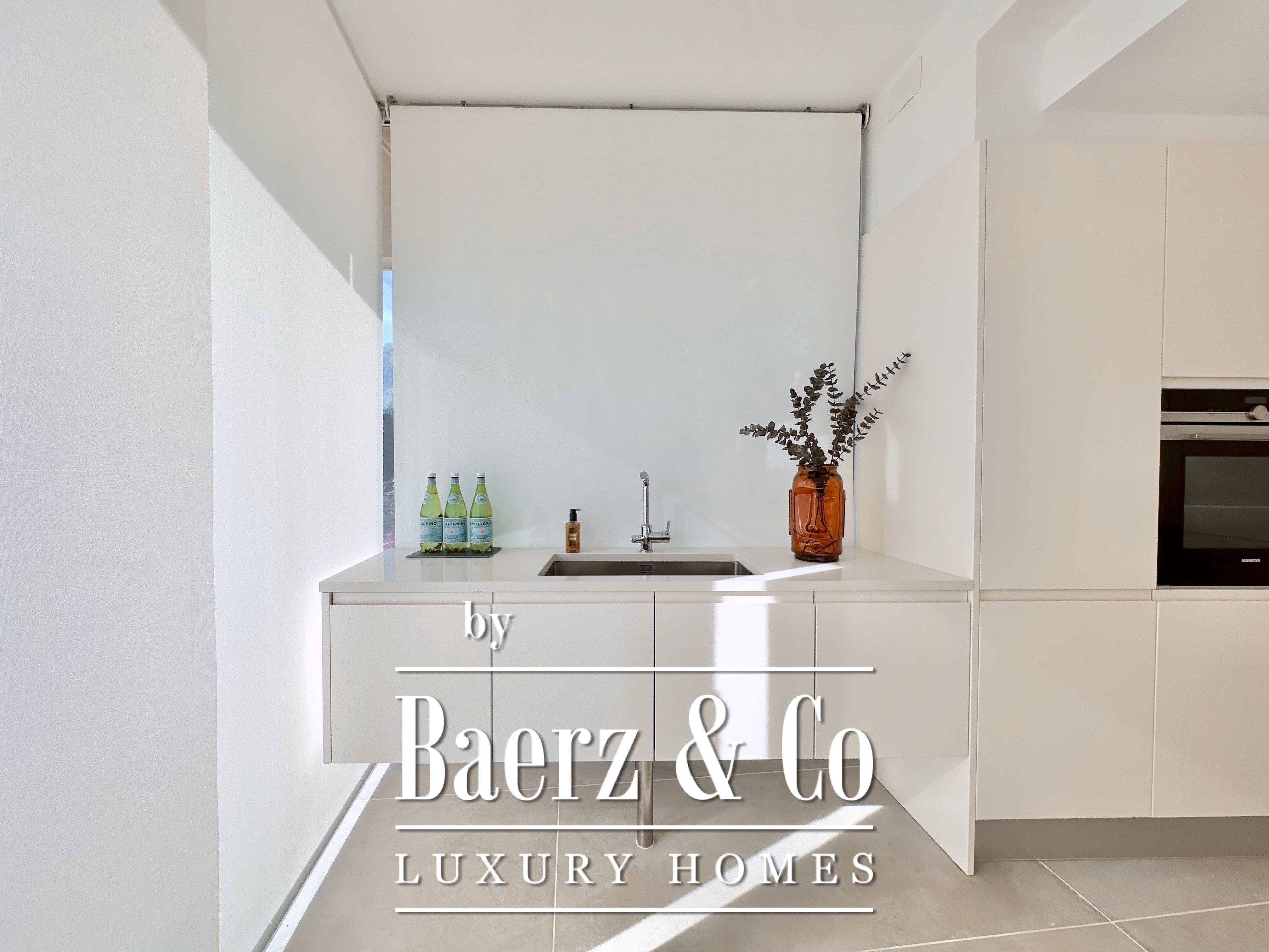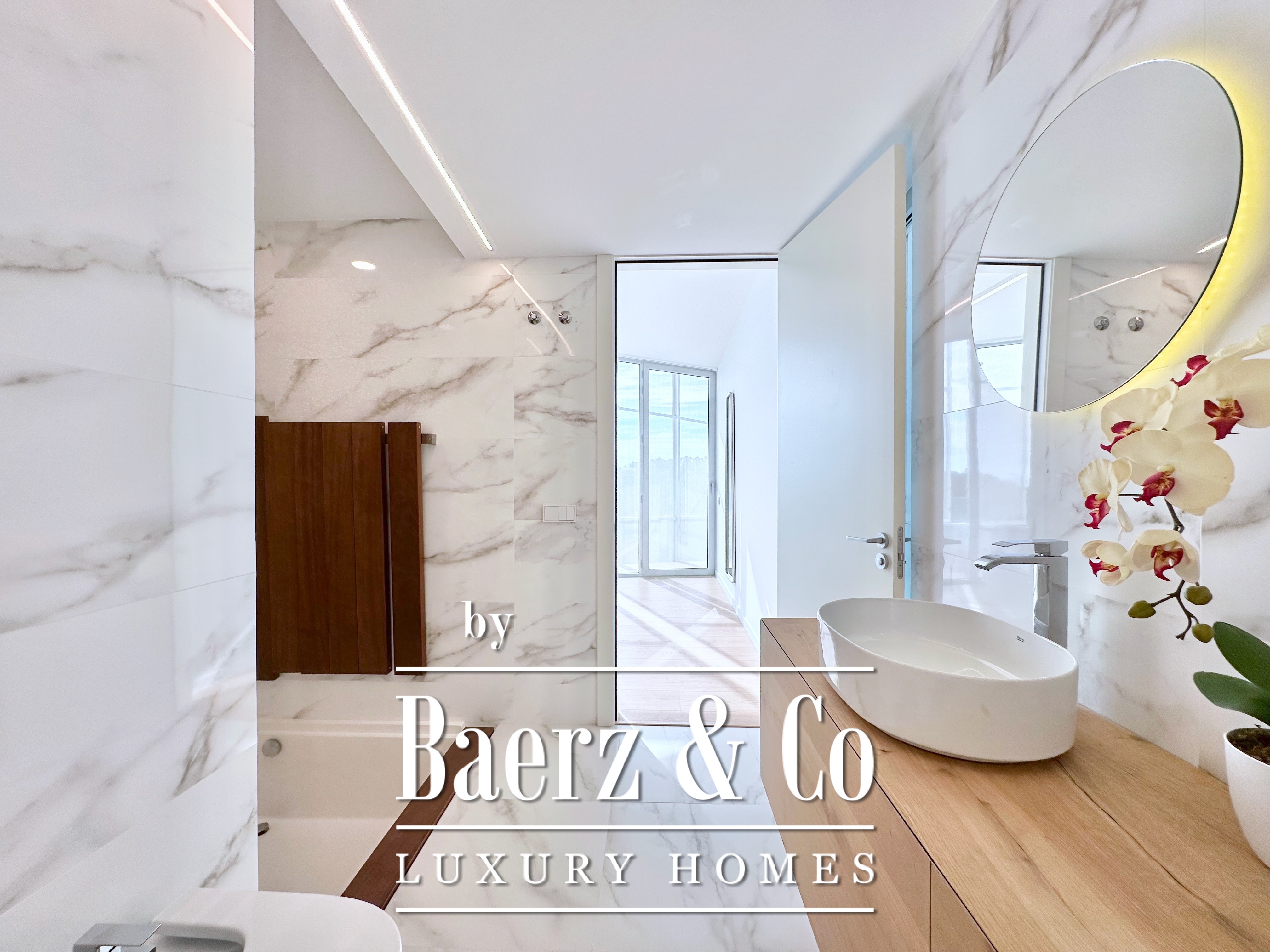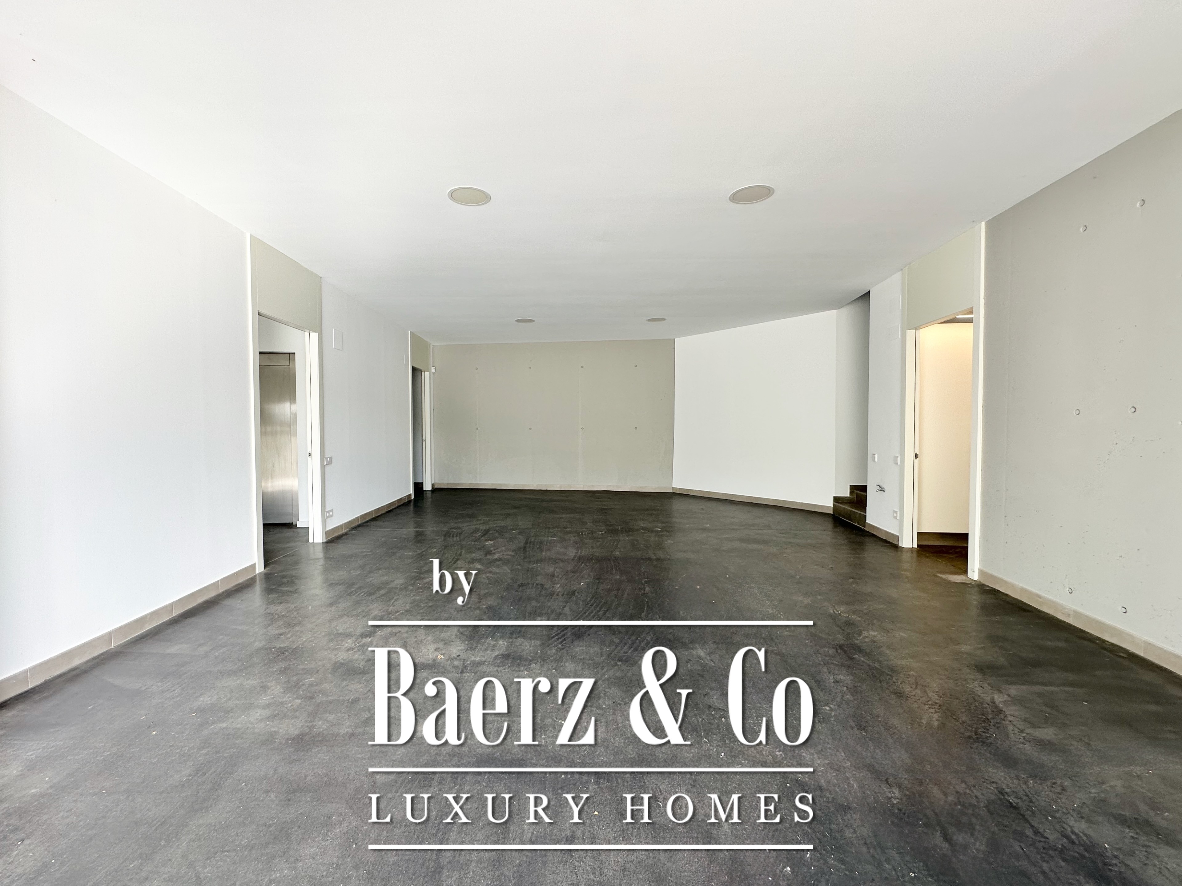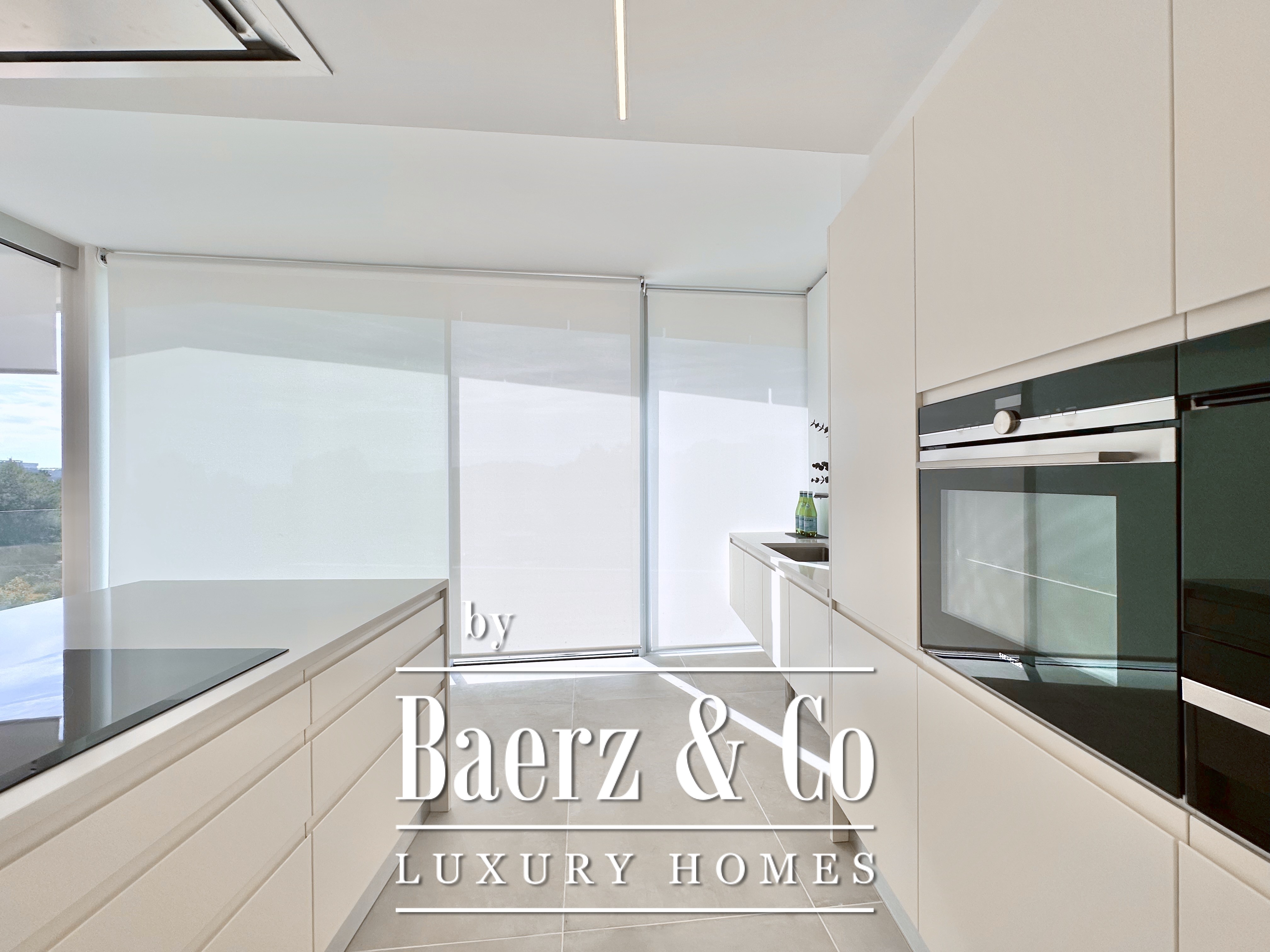 The home spans two principal levels above a versatile basement, connected by a private lift. On the lower ground, a garage accommodates four vehicles, complemented by a wine cellar, storage, laundry, and technical rooms. The main floor, anchored by an 80 m² living-dining area beneath double-height ceilings, is framed by floor-to-ceiling glazing, offering generous natural light and direct access to a covered sea-facing terrace. The kitchen is finished with contemporary white cabinetry, a central island, and integrated Siemens appliances, adaptable via a sliding glass partition. A guest suite with en-suite bathroom and a guest toilet complete this level.