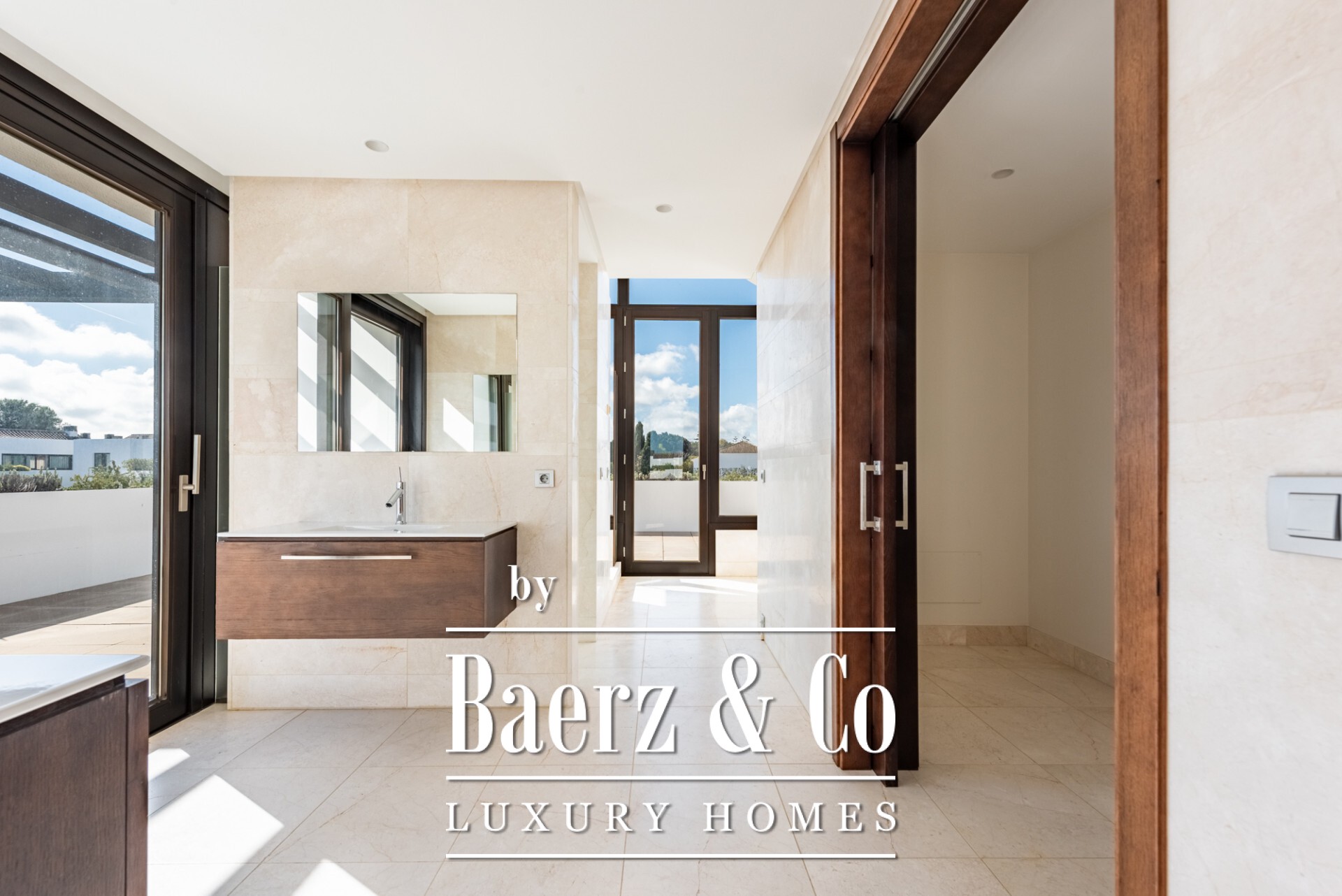 The main floor presents three bedroom suites, each benefitting from considered orientation and quiet outlooks, while the living and dining areas connect seamlessly to a fully fitted kitchen and utility room. The staircase rises to a master suite of presence and calm, framed by panoramic and partial sea views from its private terrace. Marble floors, underfloor heating, a smart home system, and double glazing offer comfort and control throughout.