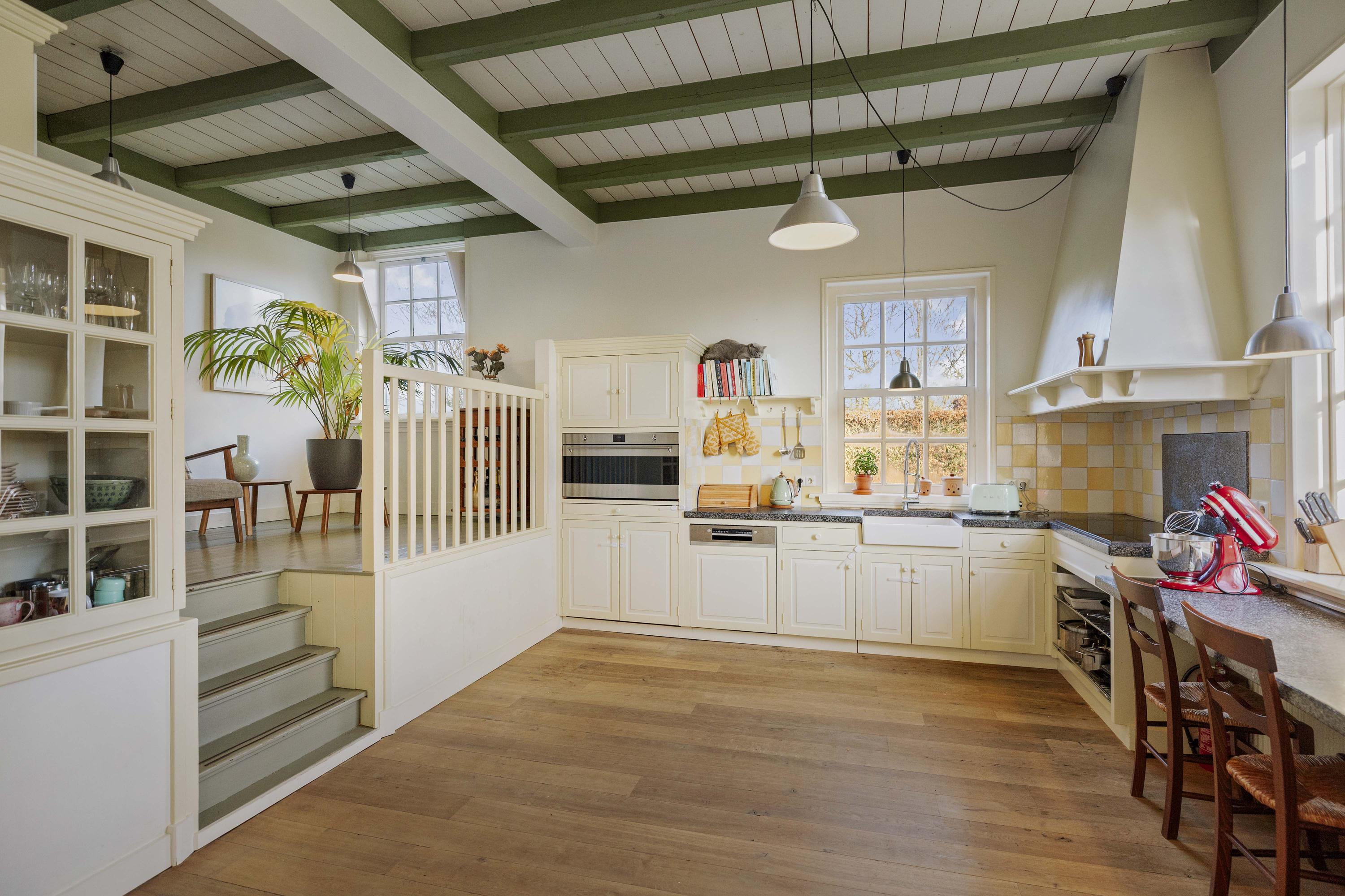 The kitchen, with its cozy upstairs room, perfectly matches the nostalgic look and feel of the house, but is surprisingly modern and fully equipped; a kitchen for foodies! The kitchen has cream-colored cabinets—there is plenty of storage space here—and a honed bluestone countertop. Cooking is done here on the extra-wide induction hob, and the built-in appliances are also top-notch, with a fridge-freezer, an extra-wide convection oven (90 cm, SMEG), and a dishwasher (Bosch). Underneath the upstairs room is the second storage cellar.