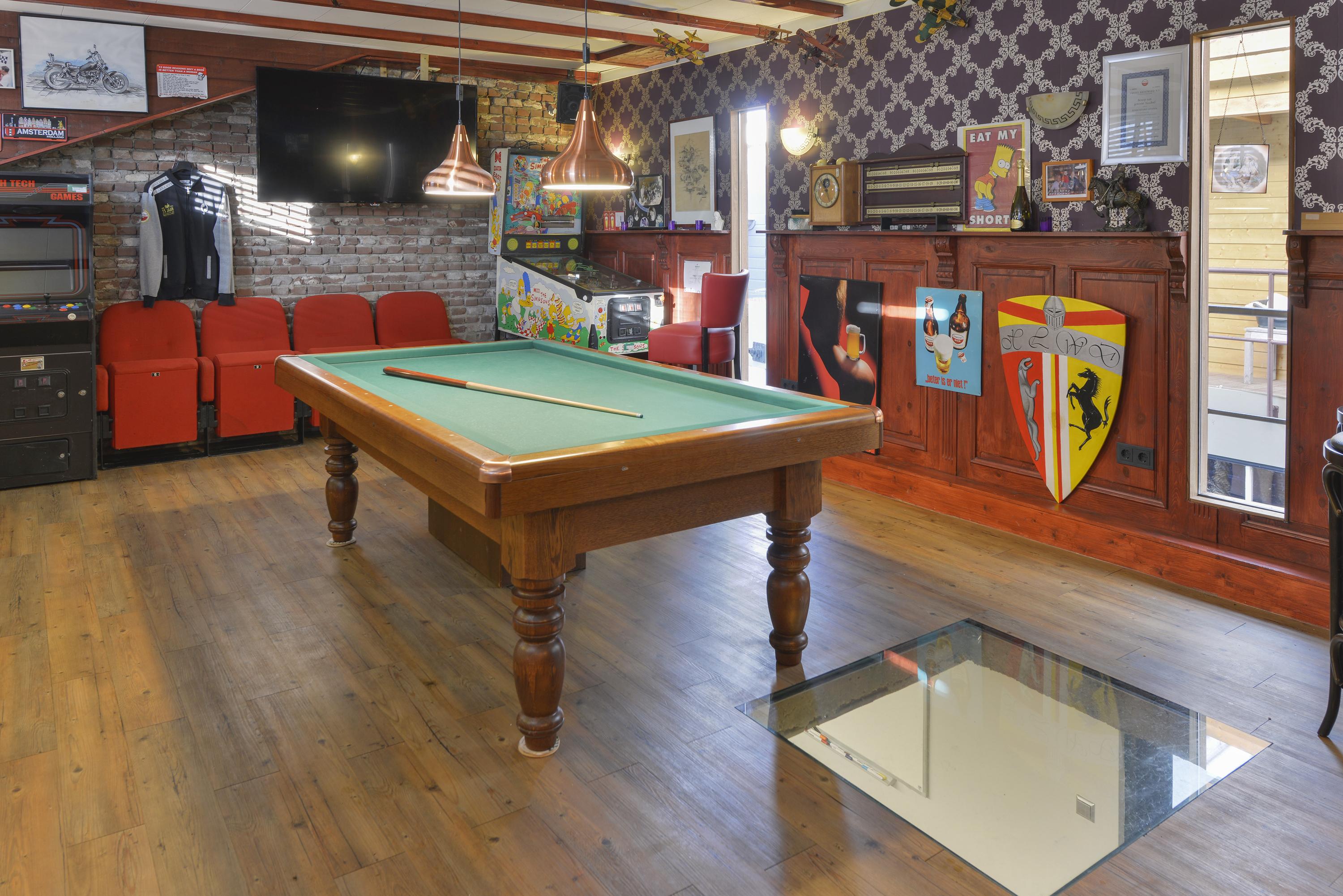First floor: landing with access to the first bedroom the first bathroom and the second landing. This bedroom is located at the front of the house. The complete bathroom is equipped with a bathtub shower washbasin and toilet. Spacious landing with walk in closet and workspace. From this second landing the hallway to the remaining bedrooms is accessible. There are four additional spacious bedrooms and a multifunctional room with bar currently used as a pool room. There are also two more bathrooms and a separate toilet. These spaces are located above the multifunctional outbuildings and feature a spacious and bright mezzanine with terrace.