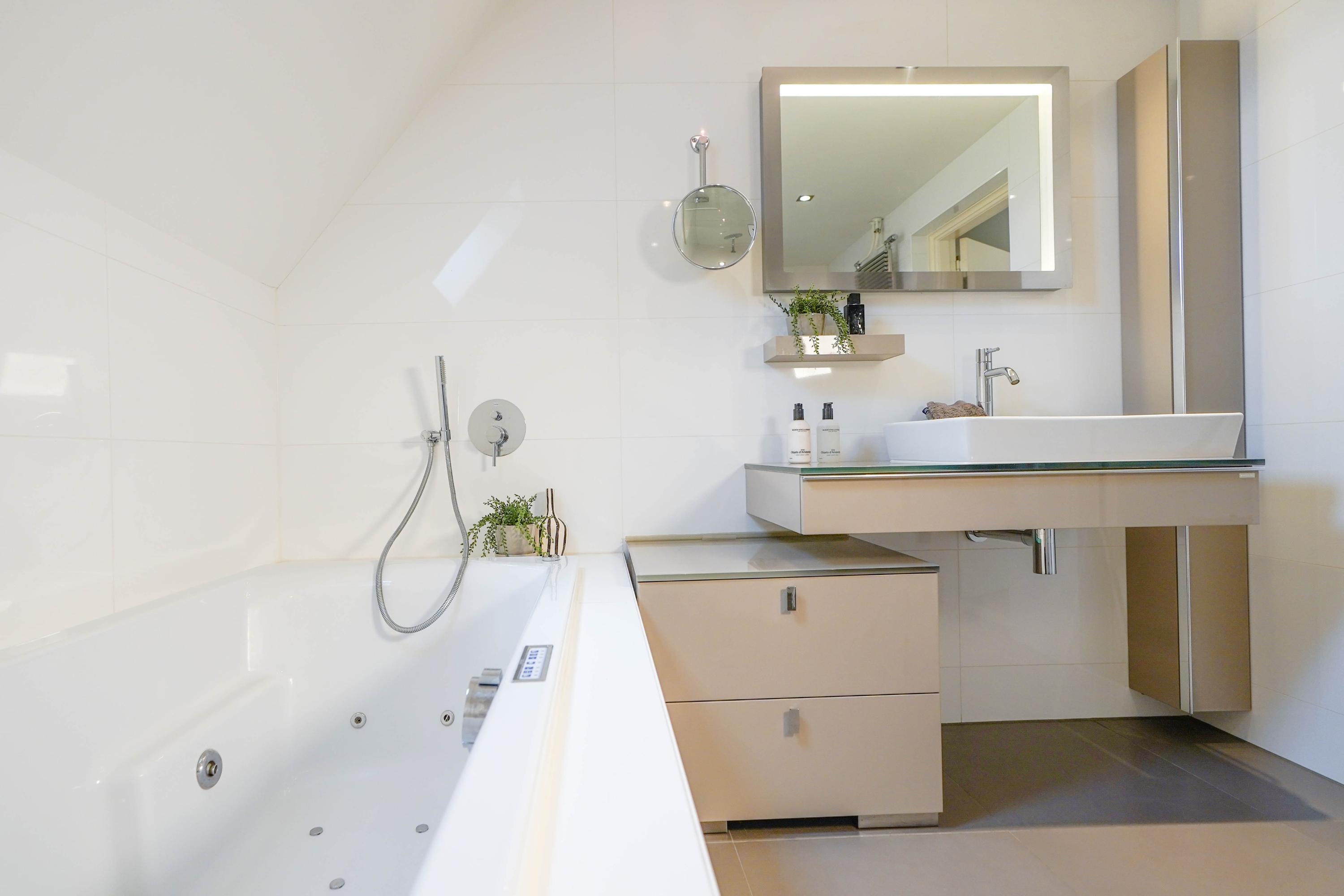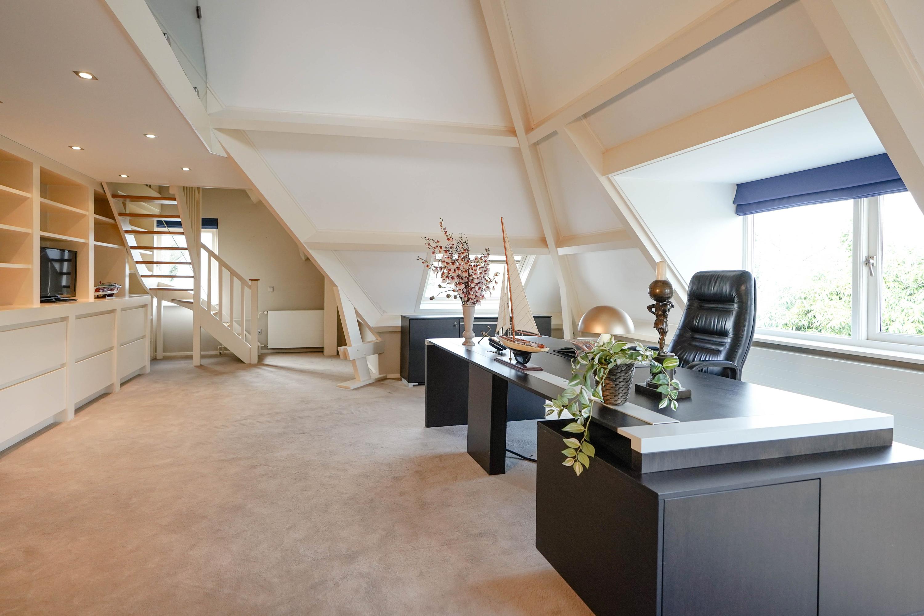 Landing, the first bathroom with shower, double sink and a toilet. Two spacious, identical children's bedrooms with a fixed staircase to a sleeping loft. The master bedroom has its own bathroom en suite (equipped with underfloor heating), fixed cupboard wall and French doors to a roof terrace with breathtaking views. Last but not least, on the first floor you will find the very spacious study with gas fireplace, view of the water, custom-made built-in cupboards and a fixed staircase to the vide and large storage attic.