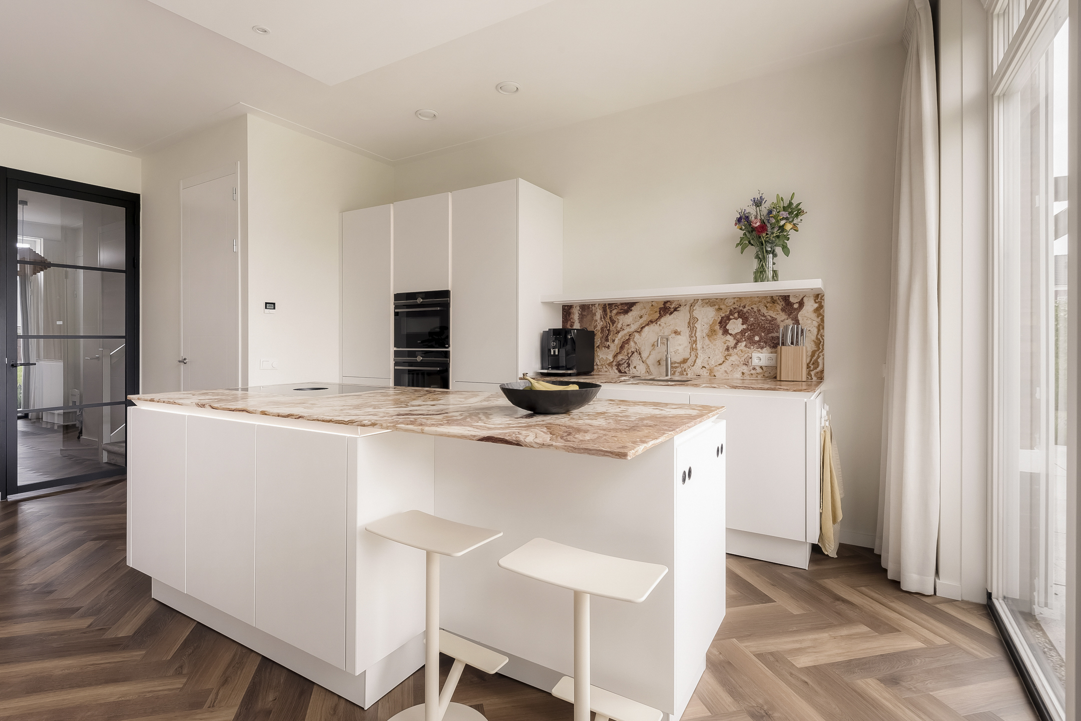 At the rear, the luxurious Siematic kitchen is a dream for culinary enthusiasts. It is equipped with an induction cooktop with Bora extraction system, high-quality Onyx natural stone countertops and Siemens Studioline appliances, including a combination oven, steam oven, convection oven, fridge-freezer combination, dishwasher and a Quooker with Cube extension. LED lighting and ample cabinet space complete the kitchen. French doors with decorative glazing connect the kitchen to the spacious, sunny southwest-facing garden. The area behind the storage room can be extended and incorporated into the living room.