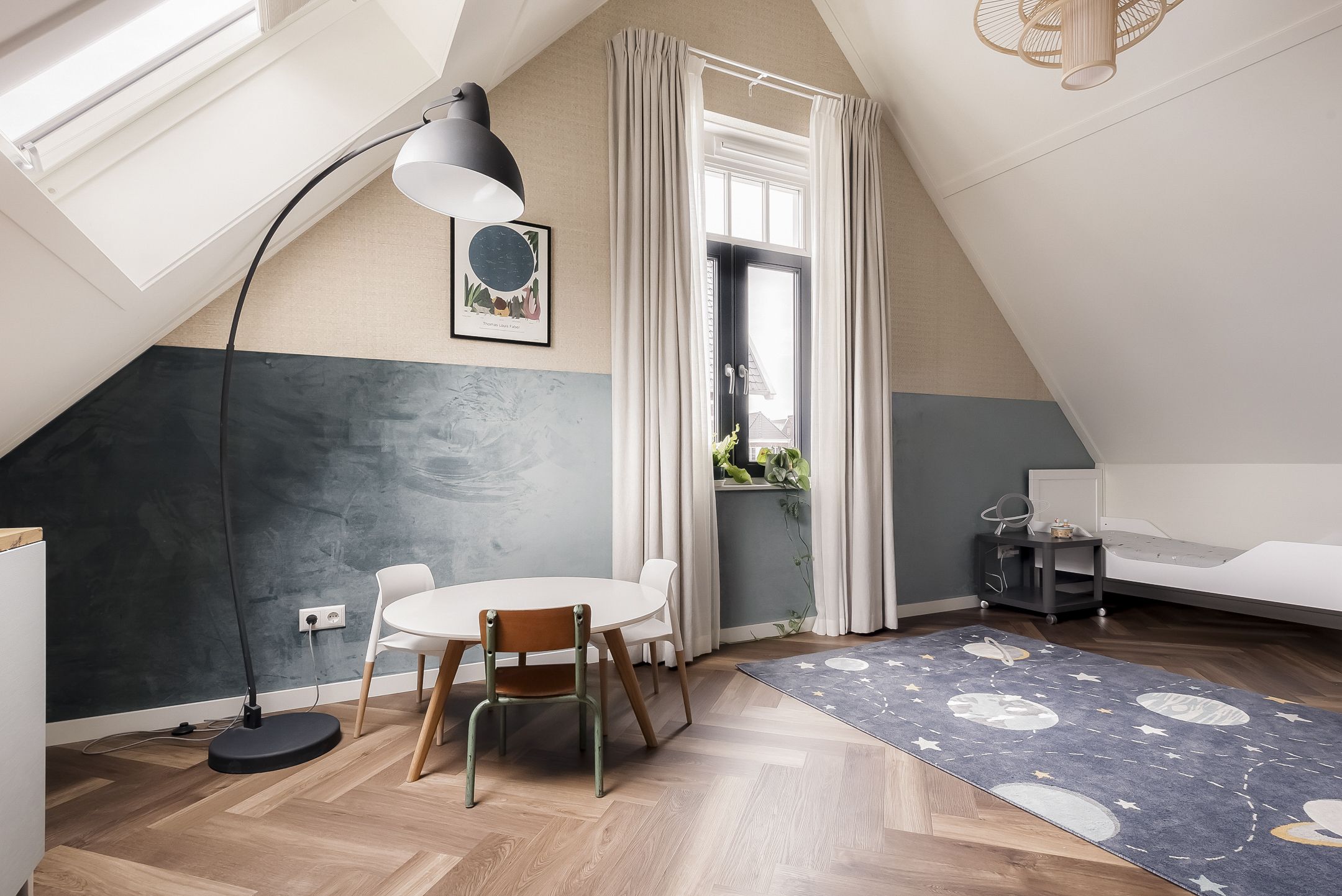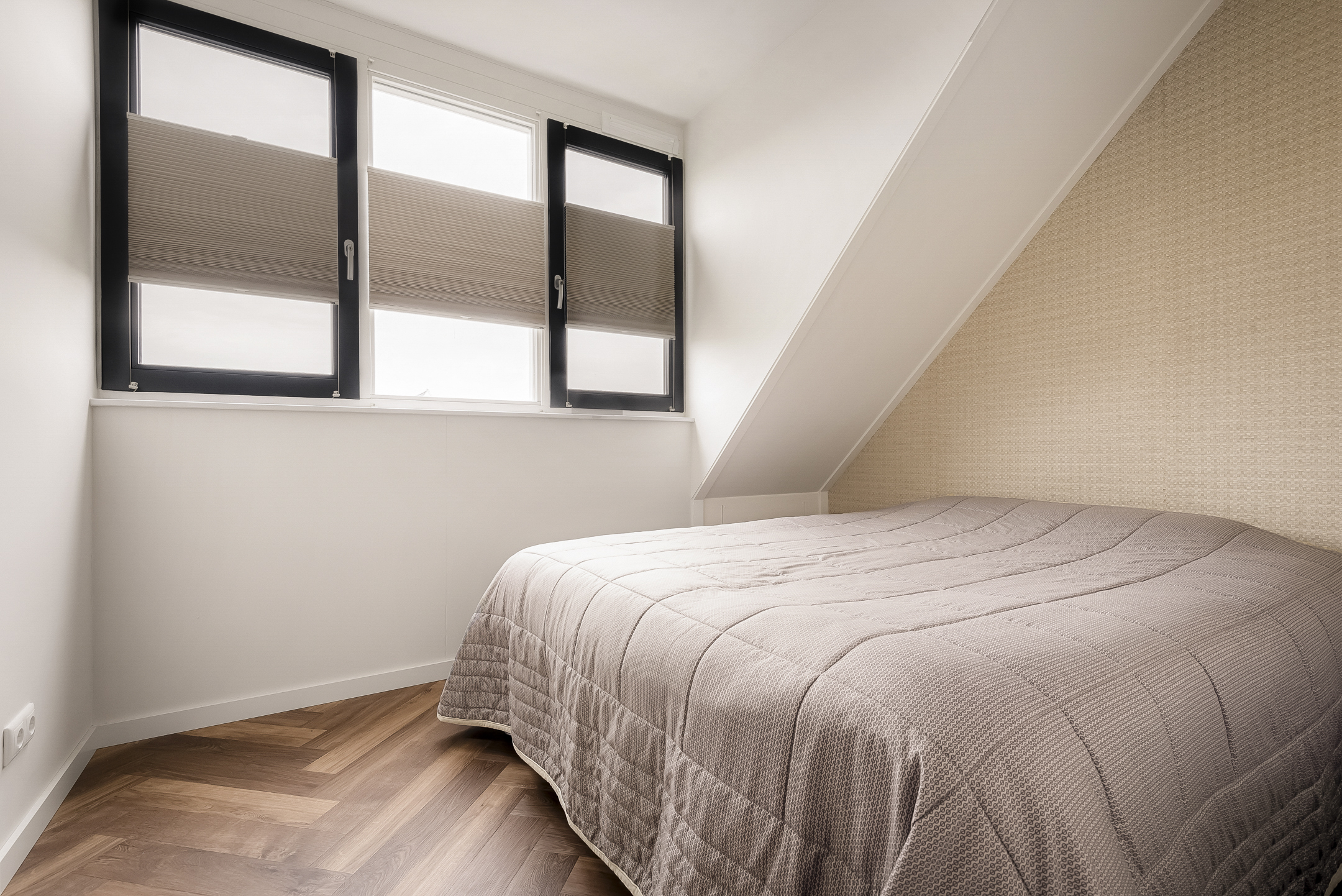 The first floor comprises four bedrooms and a spacious bathroom. The front-facing bedroom includes a walk-in closet. A second large bedroom is located above the storage room and features a Velux skylight with sun blinds and a side window with decorative glazing. The two rear bedrooms are ideal for children, guests, or a home office.