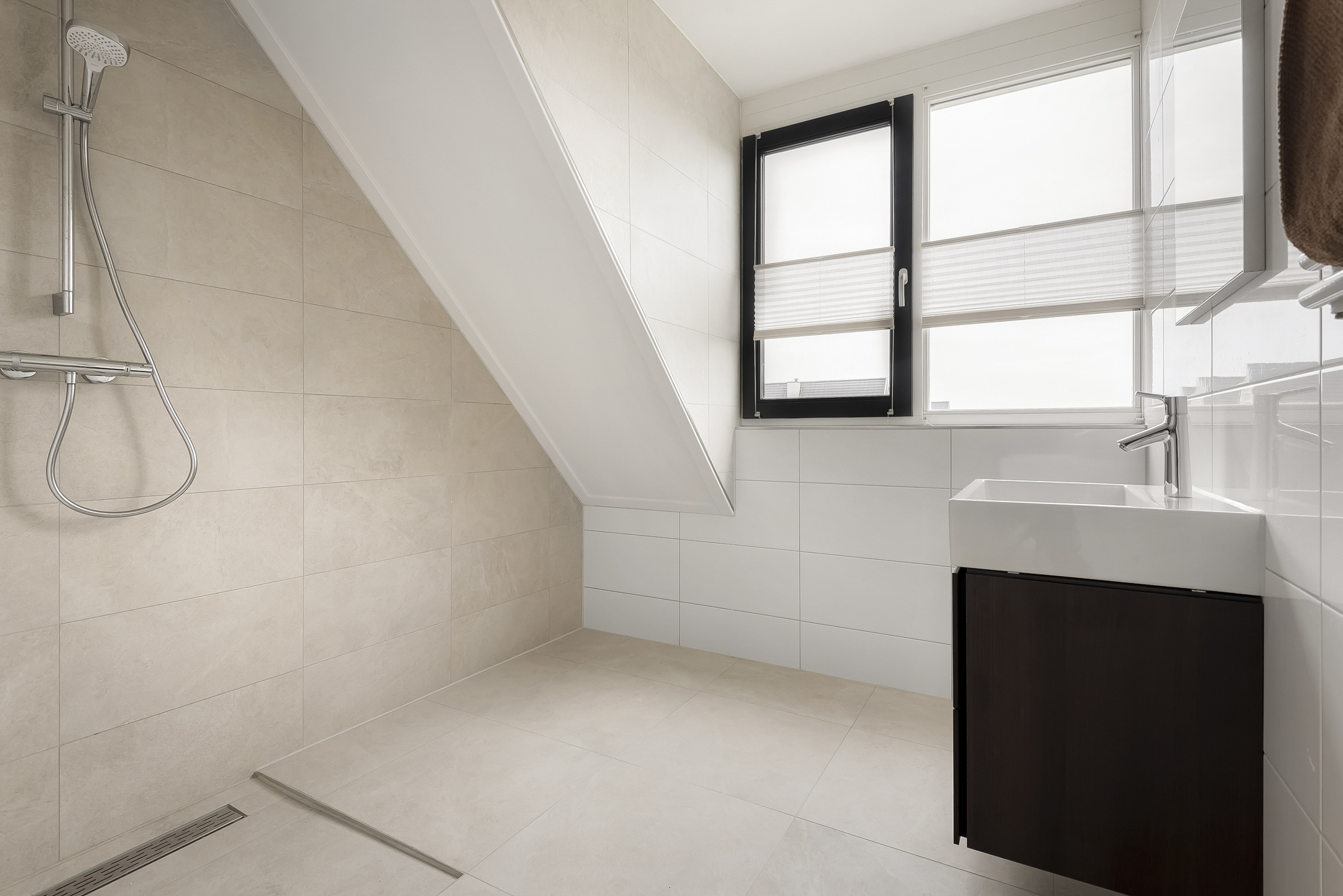 The second bathroom includes a walk-in shower with linear drain, a vanity unit, a designer radiator and a dormer window providing plenty of natural light. Opposite the bathroom is a separate toilet for added convenience.