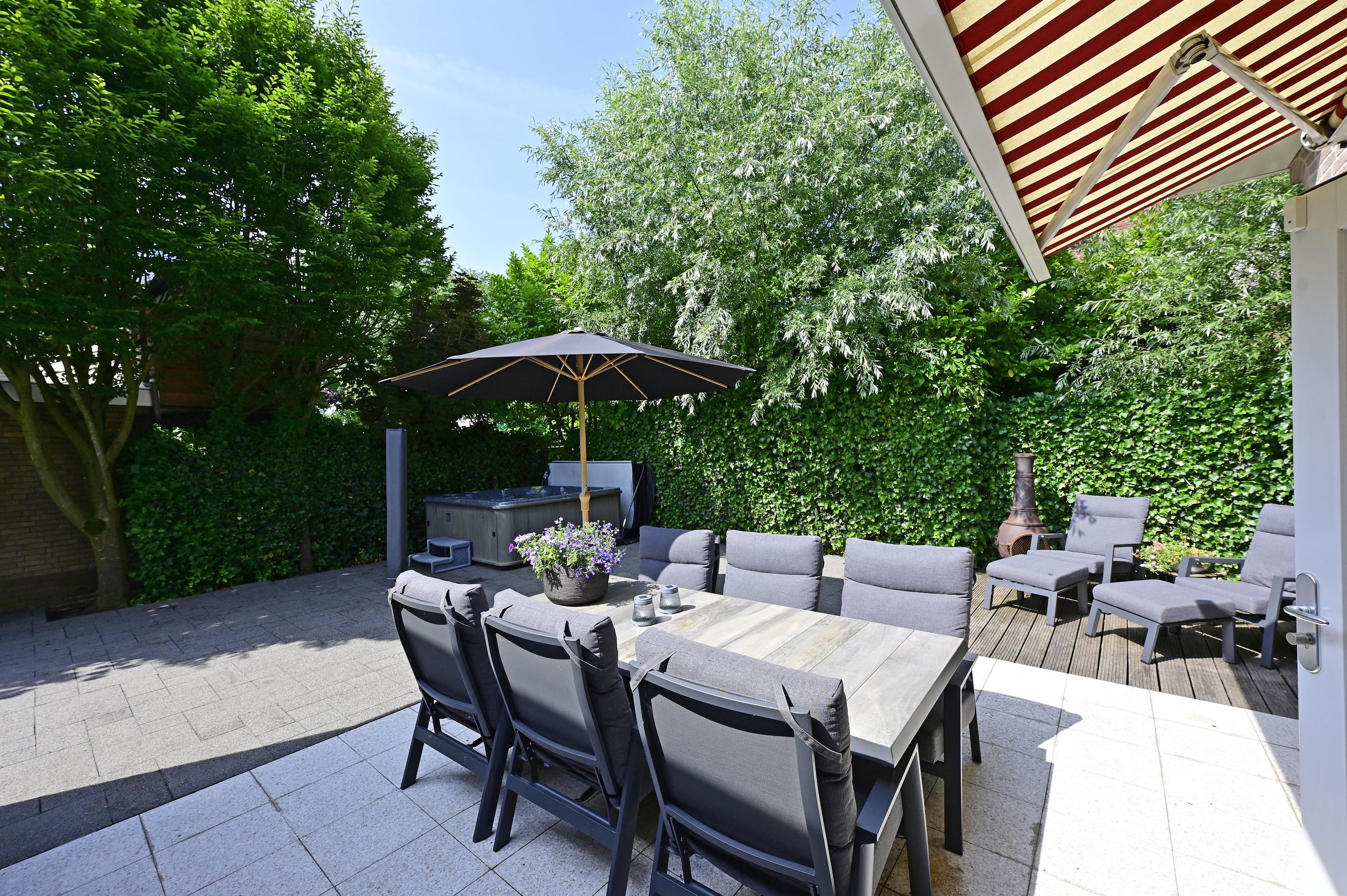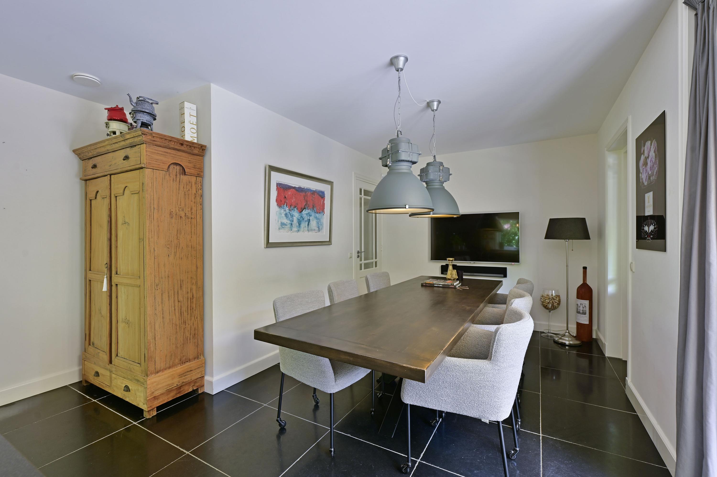 Double doors lead to the spacious kitchen-diner, designed with functionality and style in mind. A central cooking island with induction hob and integrated extractor, ample drawers, and workspace, along with an additional countertop with sink and Quooker. The adjacent tall cabinet wall houses luxurious built-in appliances, including a combination steam oven/microwave, coffee machine, large oven, sliding fridge, dishwasher, vacuum, and warming drawer. The Siematic kitchen features Miele built-in appliances from 2018. Naturally, there is also ample space for a large dining table, with French doors (fitted with insect screens) opening onto the sunny rear garden. An awning provides additional comfort.