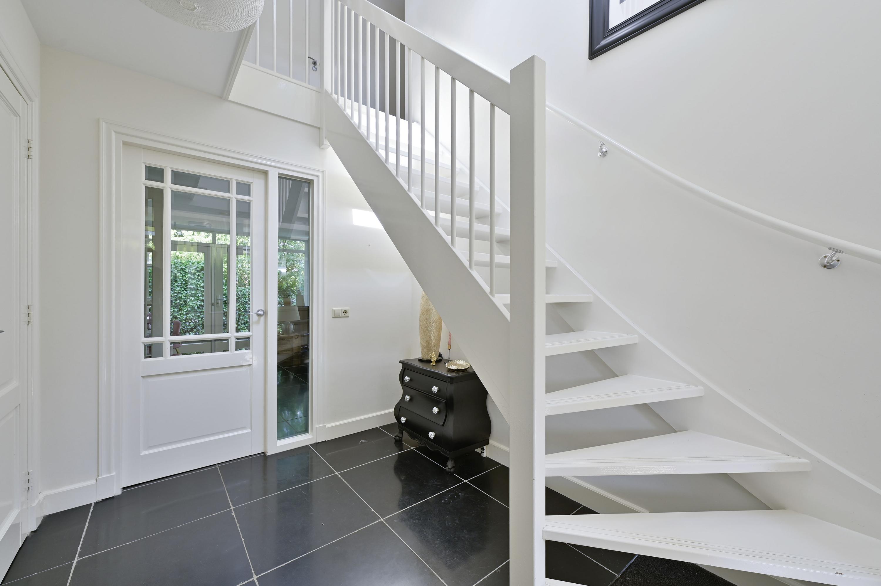 Upon entering the house, the spacious and tall staircase immediately catches the eye. Thanks to the large skylight above the stairwell, this central and highly representative hallway is remarkably bright. The hall offers a practical cloakroom, the meter cupboard, and a spacious toilet with a washbasin. From the hall, you enter the living room. This L-shaped living room is located at the front of the house and offers beautiful views of the front and side garden through the many low windows. A charming wood-burning stove (Dick Geurts) forms the cosy heart of the room. To the side is a delightful bay window with double doors leading to a decked terrace by the water — a perfect place to unwind.