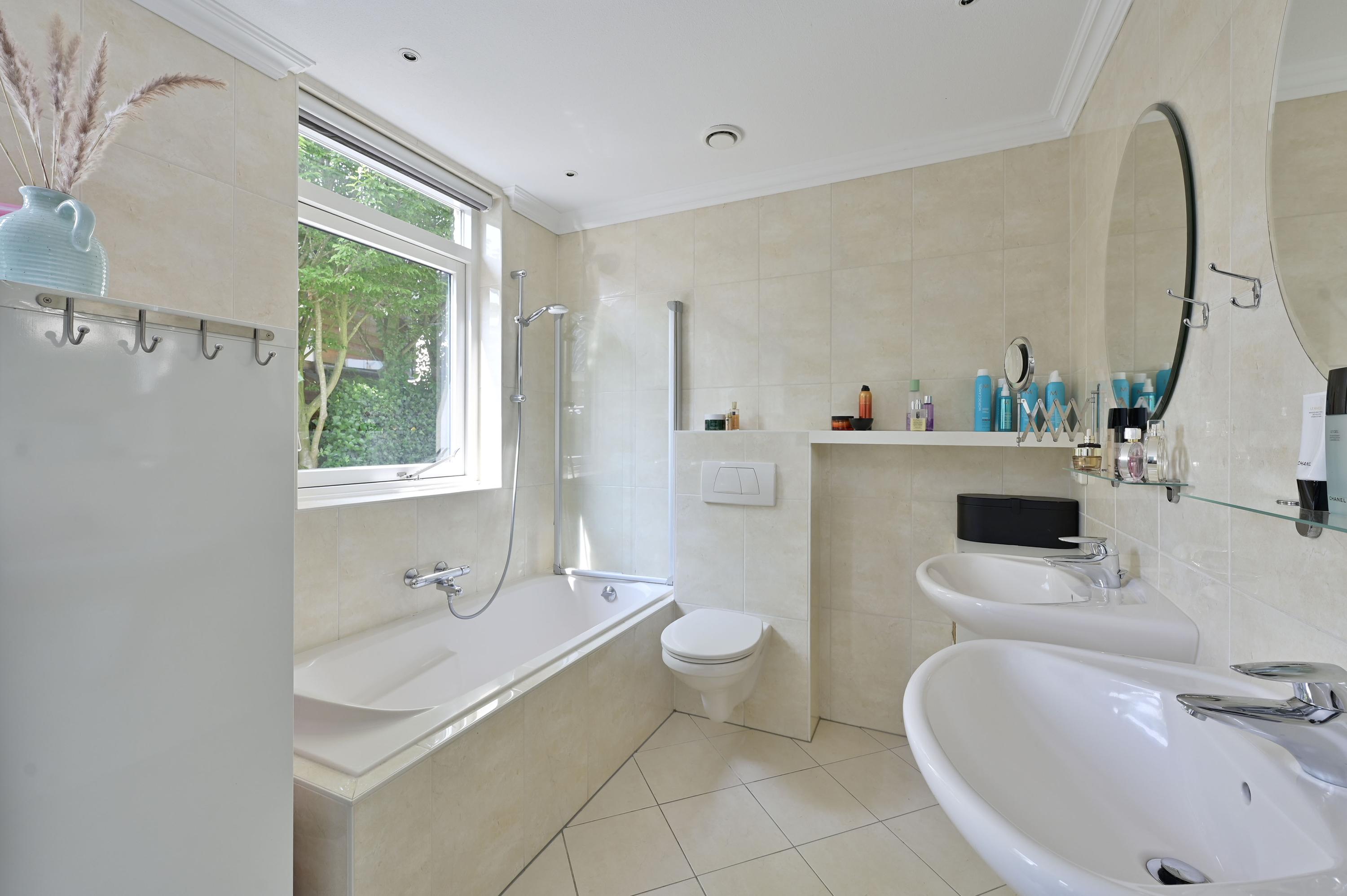 A spacious landing provides access to four generously sized bedrooms, all bright thanks to large windows. A separate toilet is also located on this floor. The luxurious bathroom features a broad dormer window and offers comfort with a bathtub, walk-in shower with glass screen, rain shower, hand shower, double washbasin, and underfloor heating.