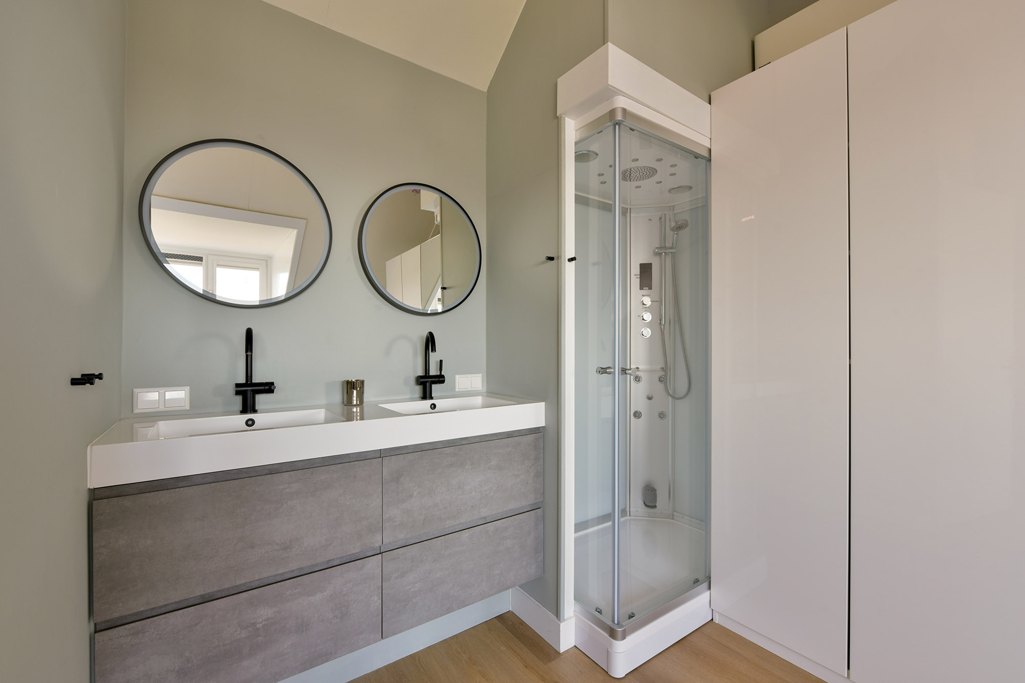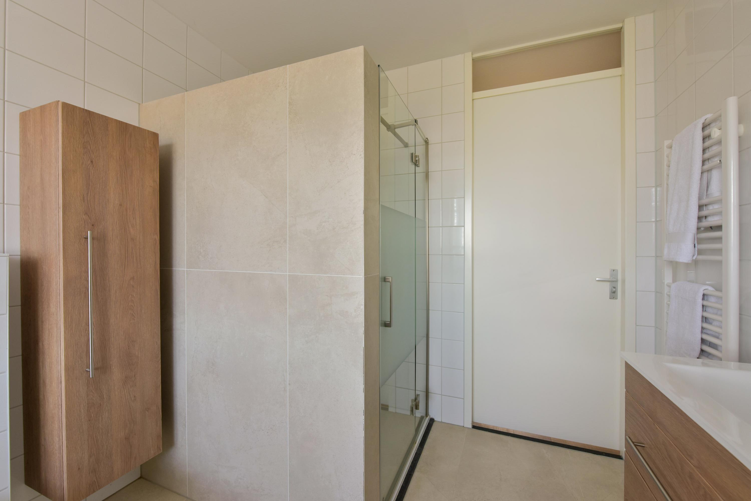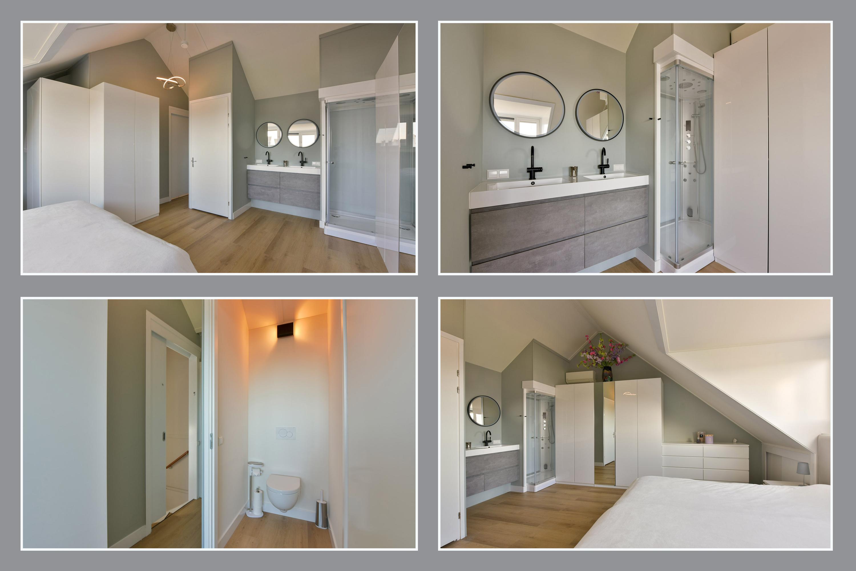 The bathroom feels like a luxury spa, with a large walk-in shower with glass door, a relaxing bathtub, a modern double vanity with heated and illuminated mirror, and a toilet. The high-quality tiling aligns with the style of the ground floor. The entire first floor features a PVC floor with underfloor heating, and most windows are fitted with screens.