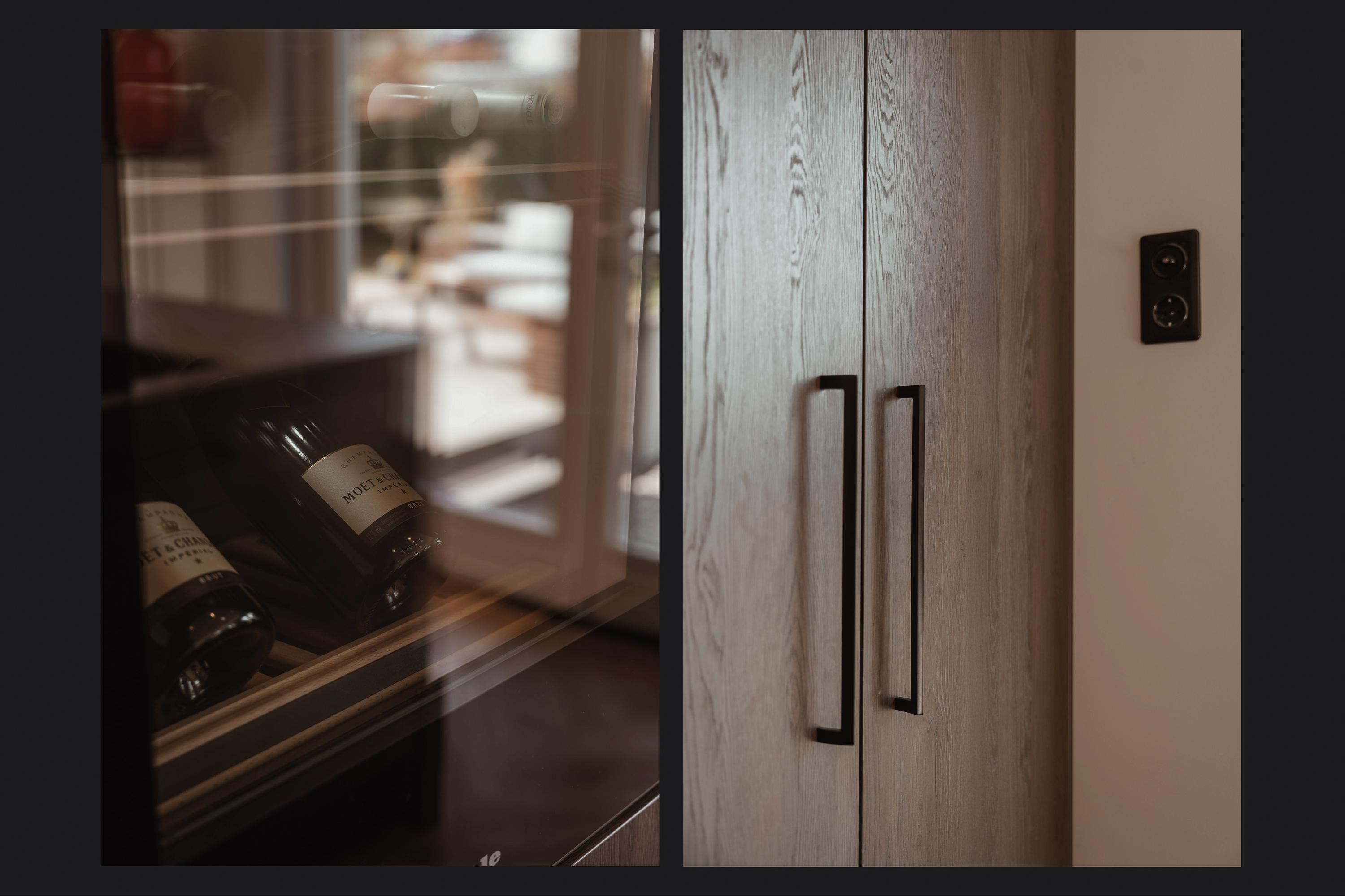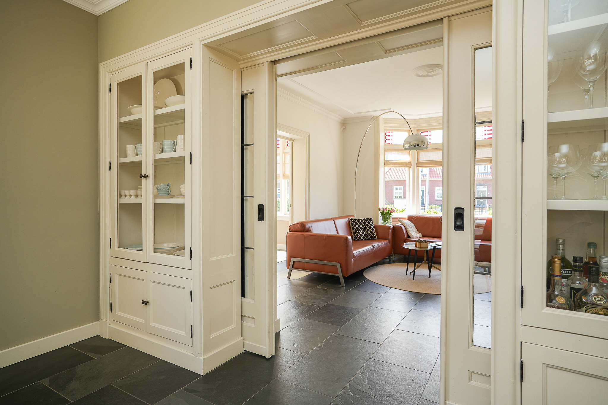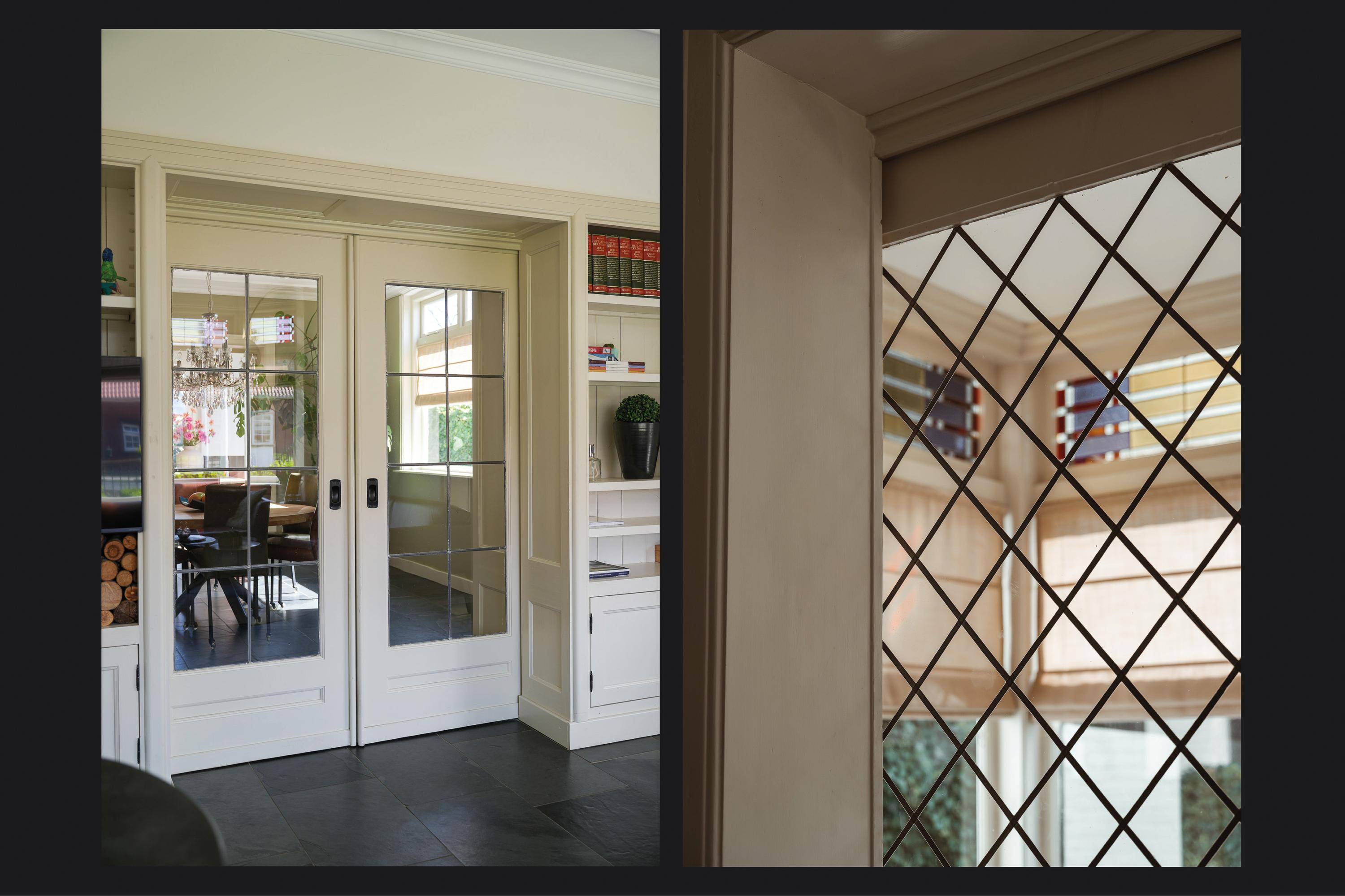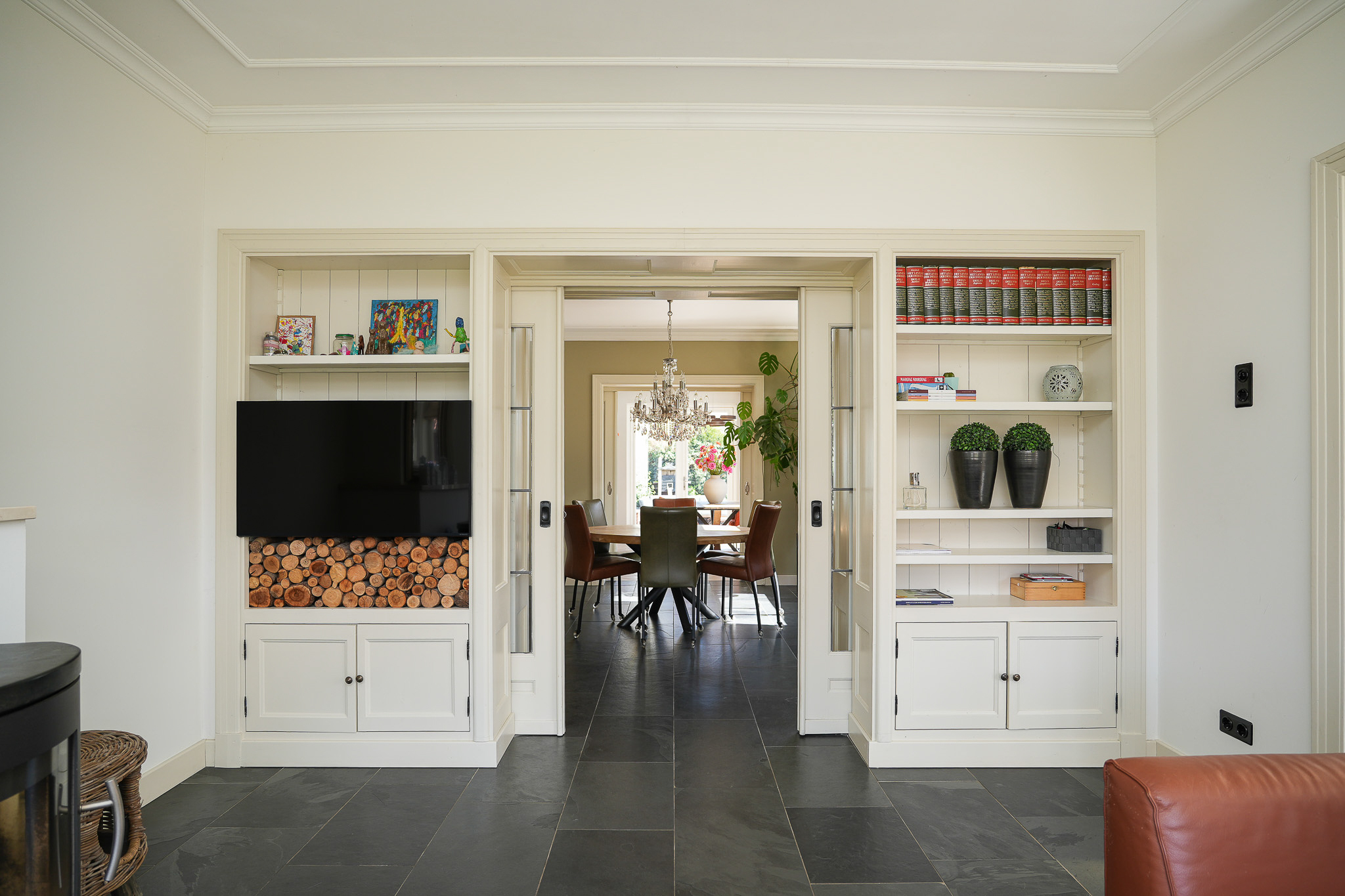 Double en suite doors with stained glass, flanked by built-in cupboards, lead to the rear room, which connects directly to the kitchen-diner. This kitchen-diner is located in the extension completed in 2021/2022 and is fully oriented towards the garden. It forms the heart of the home, with views of the garden and direct access outside.
