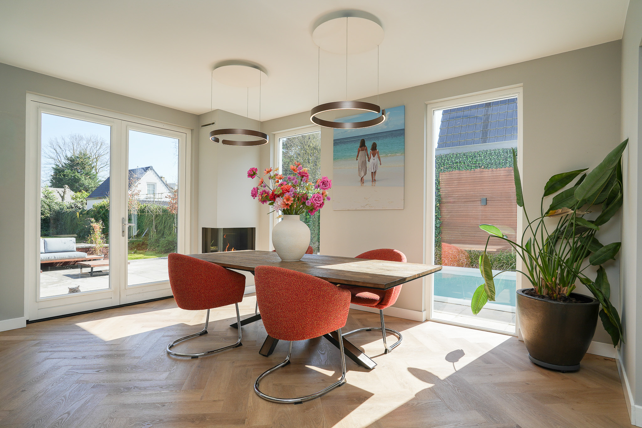 The kitchen is finished to a high standard, featuring a wide wall of cabinetry with premium built-in appliances and a large island with a Dekton worktop. On the dining side, the island incorporates a breakfast bar near the coffee corner. Adjacent to the gas fireplace there is space for a large dining table. Two sets of French doors provide an abundance of natural light and direct access to the full-width terrace and garden.
