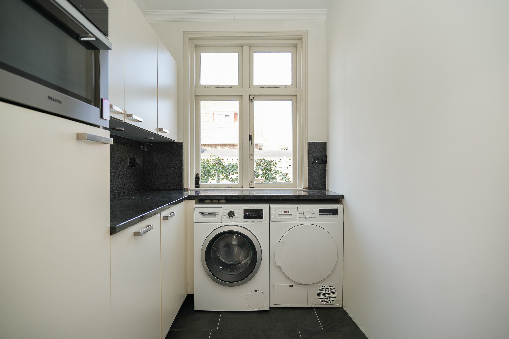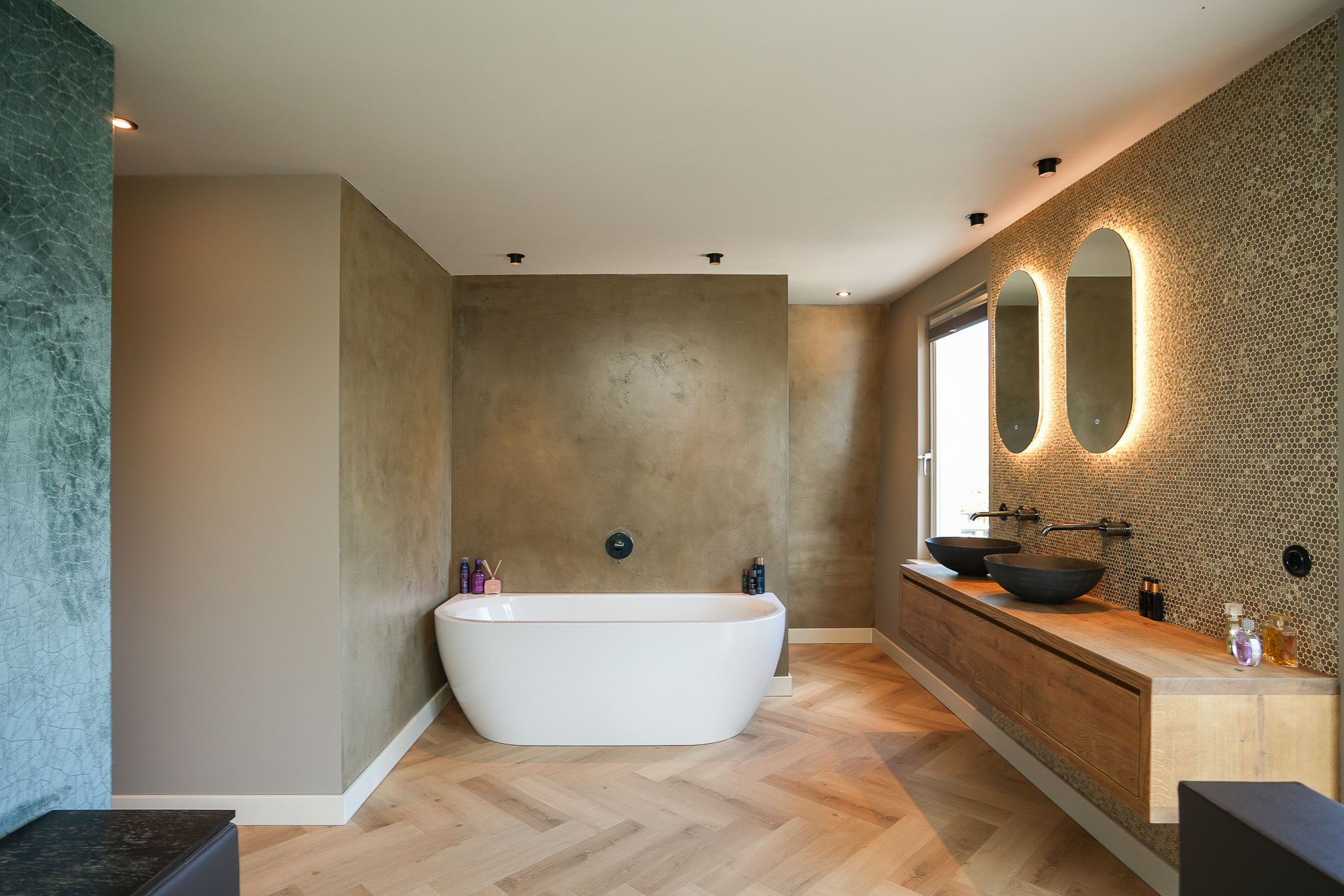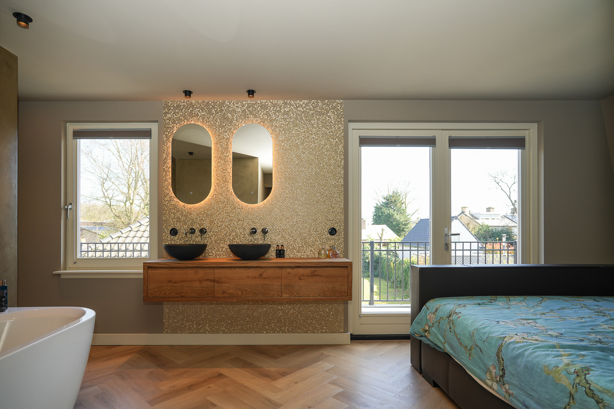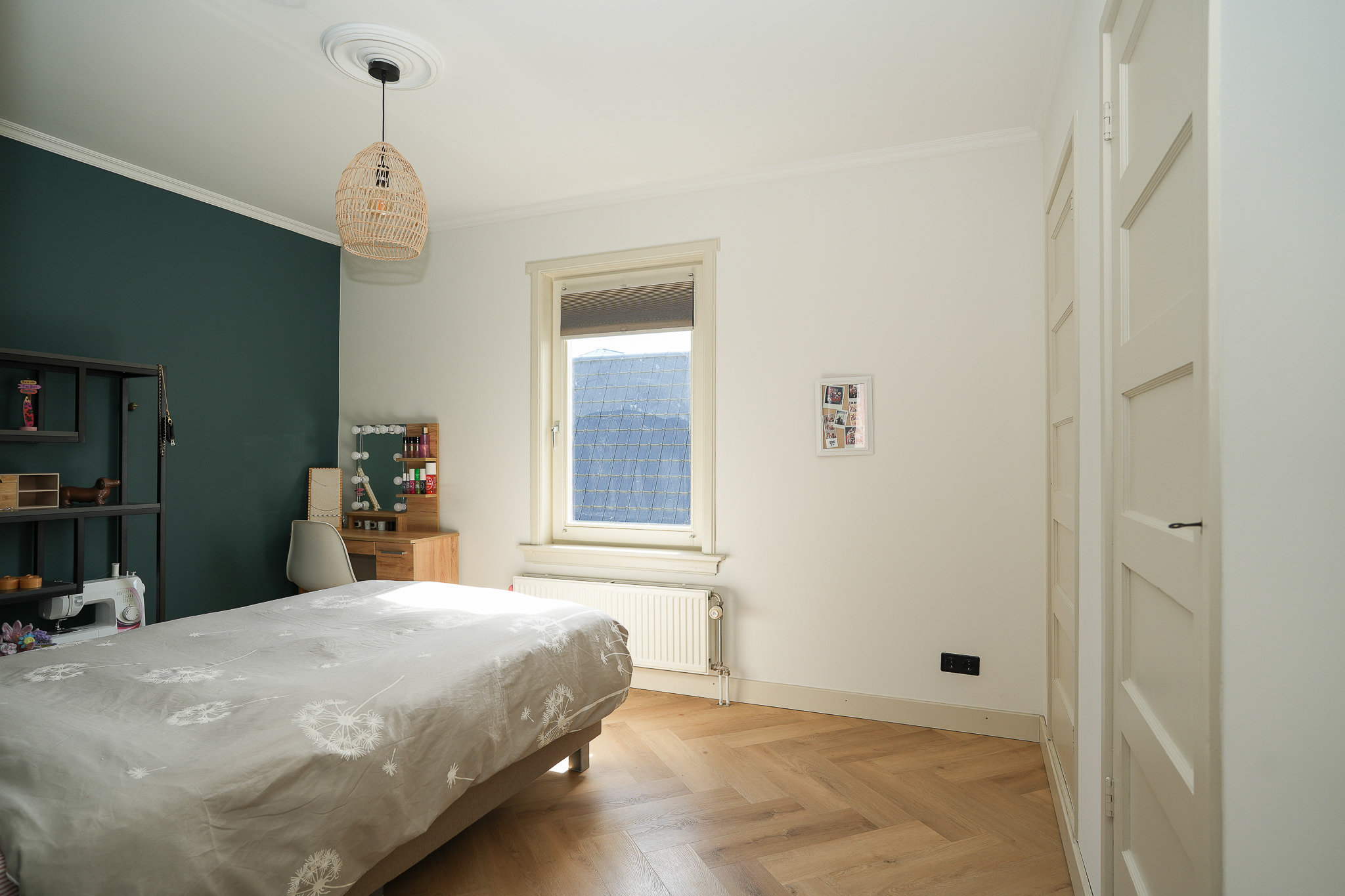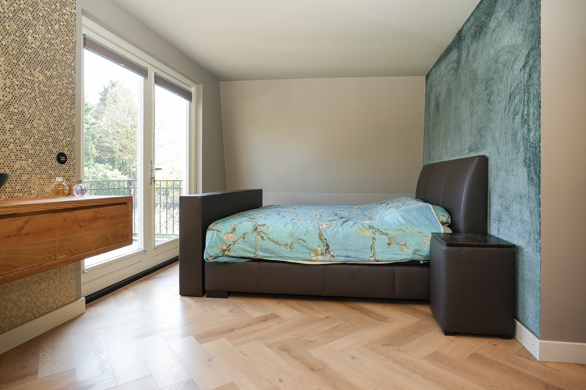 The landing reflects the care and attention given to the renovation. The new extension blends seamlessly with the original architecture. There is also a separate toilet on this level. In the rear extension is a bedroom with balcony, a luxurious open bathroom and a walk-in closet. The bathroom is fitted with a semi-freestanding bathtub, a spacious walk-in shower with rainfall shower and a stylish vanity unit. The wall behind the vanity is finished with hexagonal mosaic tiles, while the shower and bath areas feature concrete ciré finishes. Thanks to its east-facing position, the morning sun enters here, and the balcony is directly accessible from the bedroom.