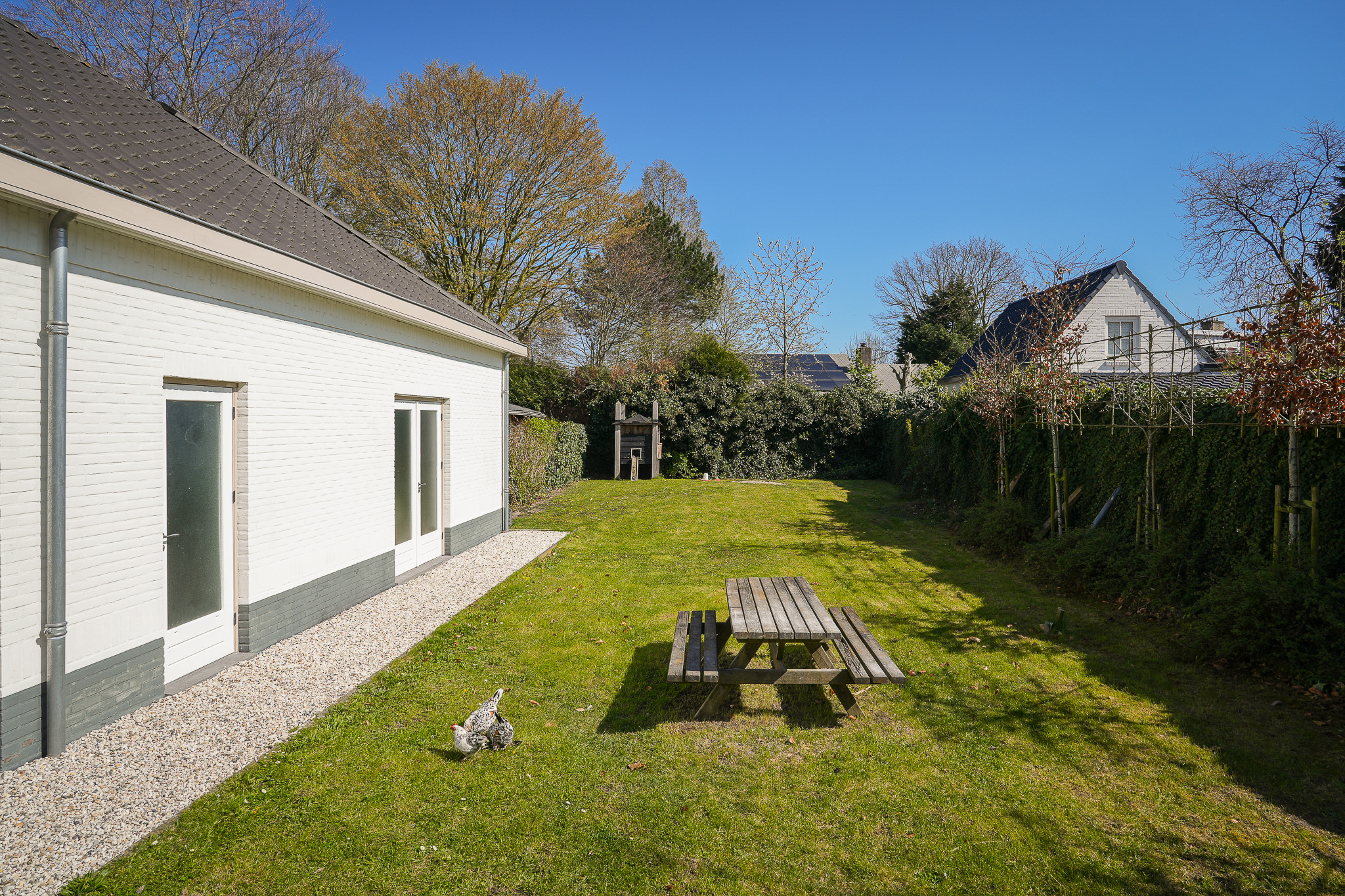 The electrical installation has been completely renewed, incorporating retro-style switches combined with Philips Hue lighting. Twelve solar panels have been installed on the flat roof, and the main roof was fully renovated in 2024, including new battens and tiles. The zinc work had already been renewed the year before.
