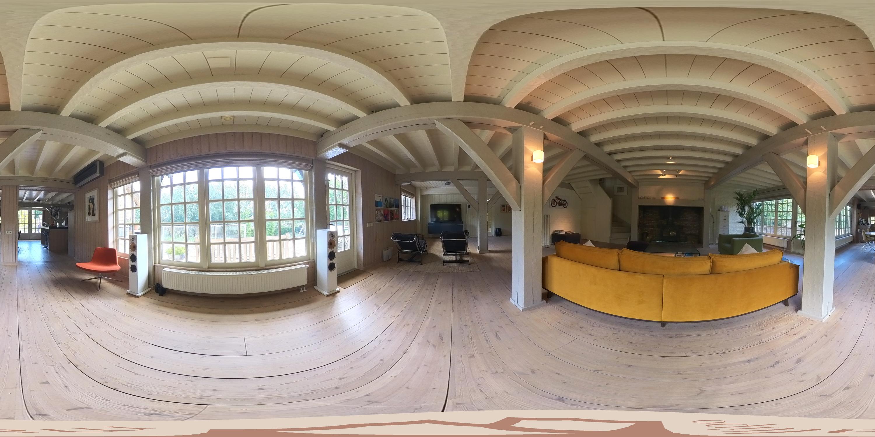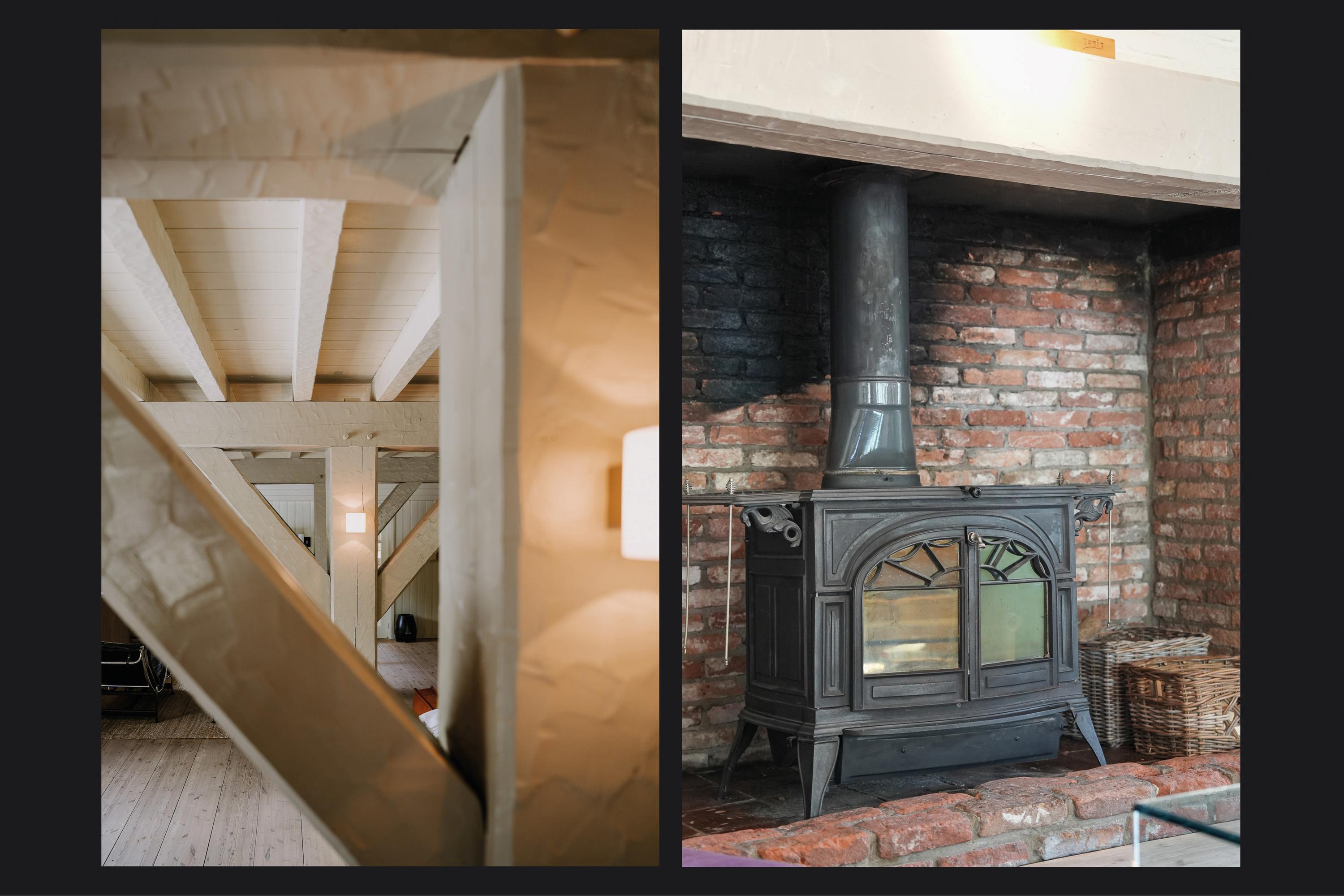 The entrance is located at the rear, by the elevated hardwood terrace. Through wide French doors with mullioned windows, you enter the impressive living space, where broad floorboards, a wood-fired stove, and large windows create a warm atmosphere.