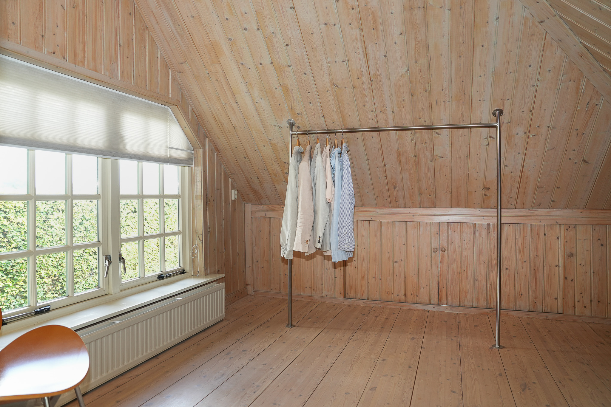 The east-facing bedroom spans the full depth of the house and is fitted with built-in wardrobes under the eaves. The master bedroom opens onto a wide balcony and an adjoining dressing room, currently in use as such but equally suited as an additional study or bathroom.