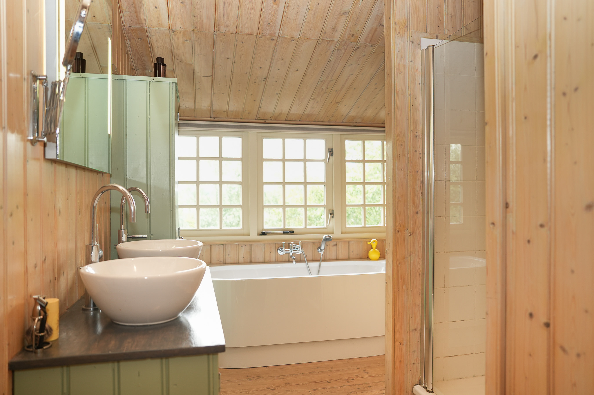 The two remaining bedrooms are playfully designed, with exposed roof beams and mullioned windows offering fine views of the surroundings. The bathroom, styled in line with the bedrooms, is fitted with a bathtub, shower cabin, and double washbasin.