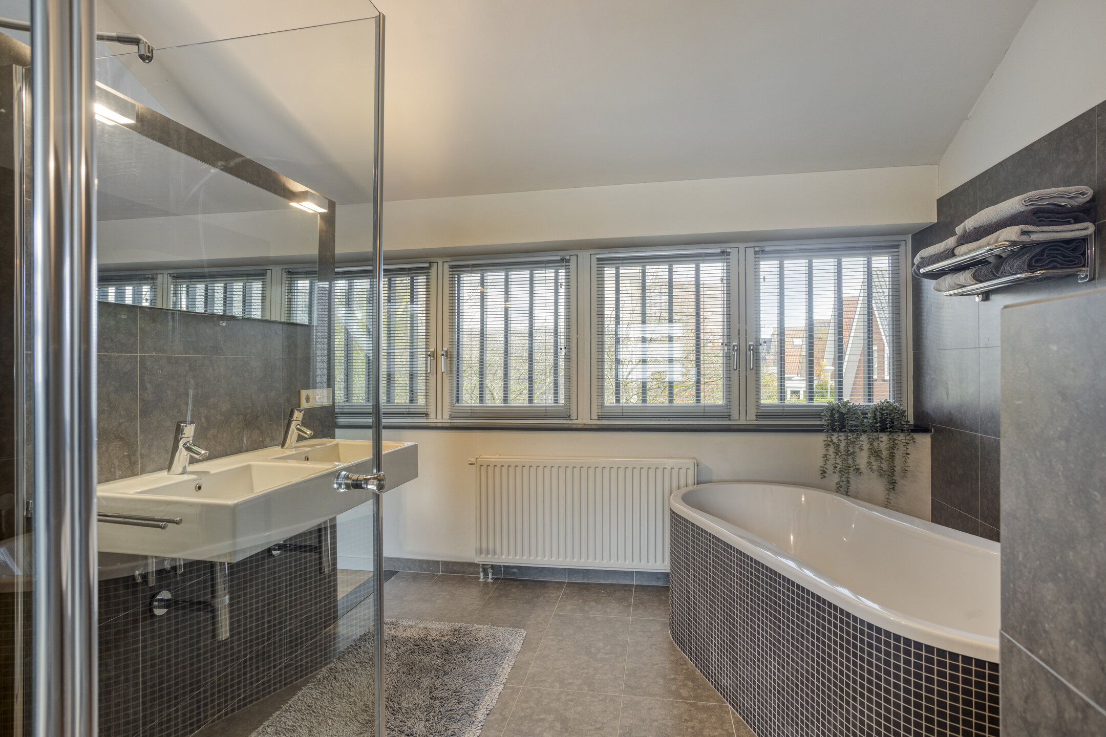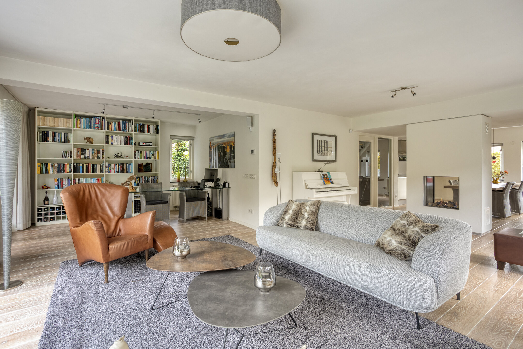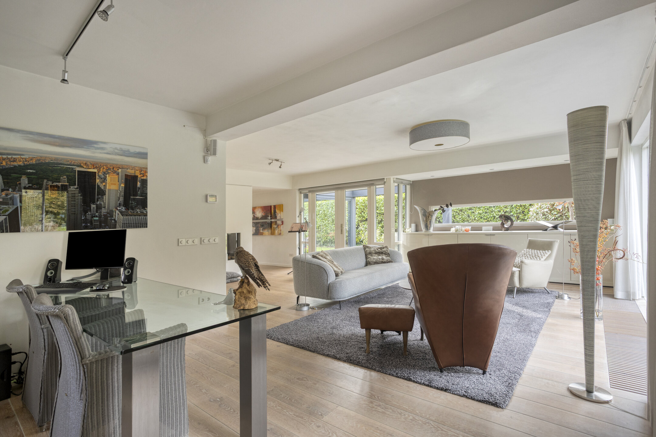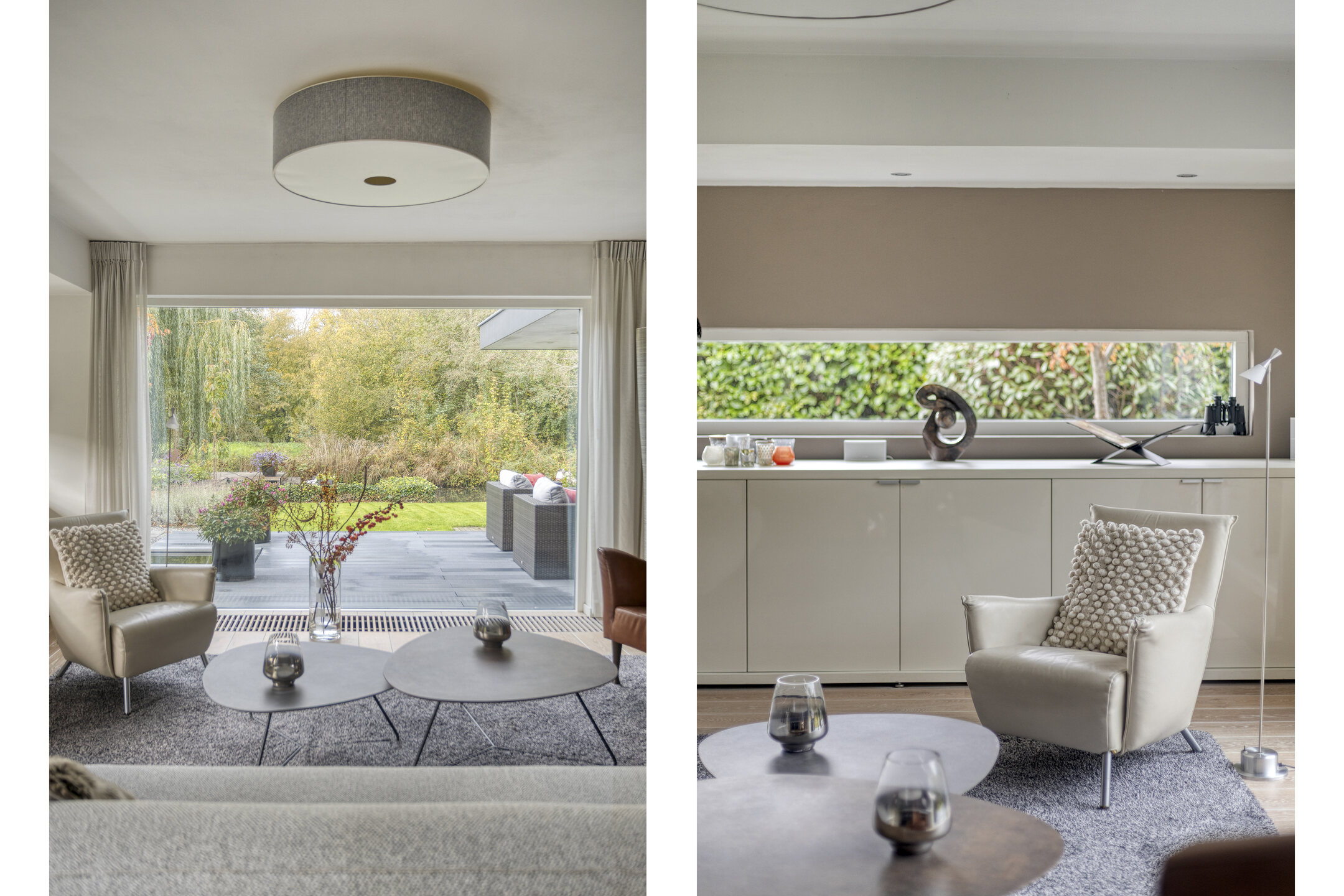 Dès l’entrée, un vaste hall s’ouvre sur un sol en chêne et des portes vitrées aux lignes épurées. Le séjour et la cuisine-salle à manger sont séparés par une cheminée Bellfire à double foyer, diffusant une chaleur apaisante au cœur de l’espace. La cuisine luxueuse, dotée d’équipements haut de gamme et d’un plan de travail en pierre bleue belge, allie usage quotidien et art de vivre. La façade arrière, caractérisée par de larges baies vitrées, sublime l’harmonie du jardin et la perspective protégée de l’Egmonderhout.