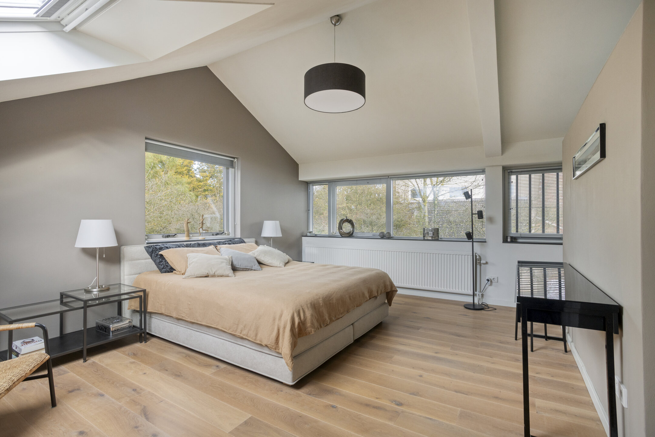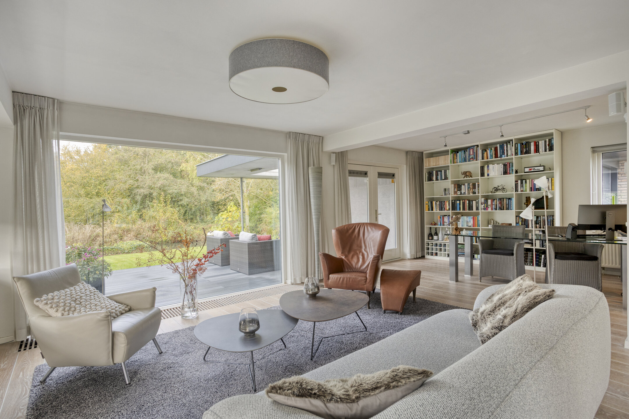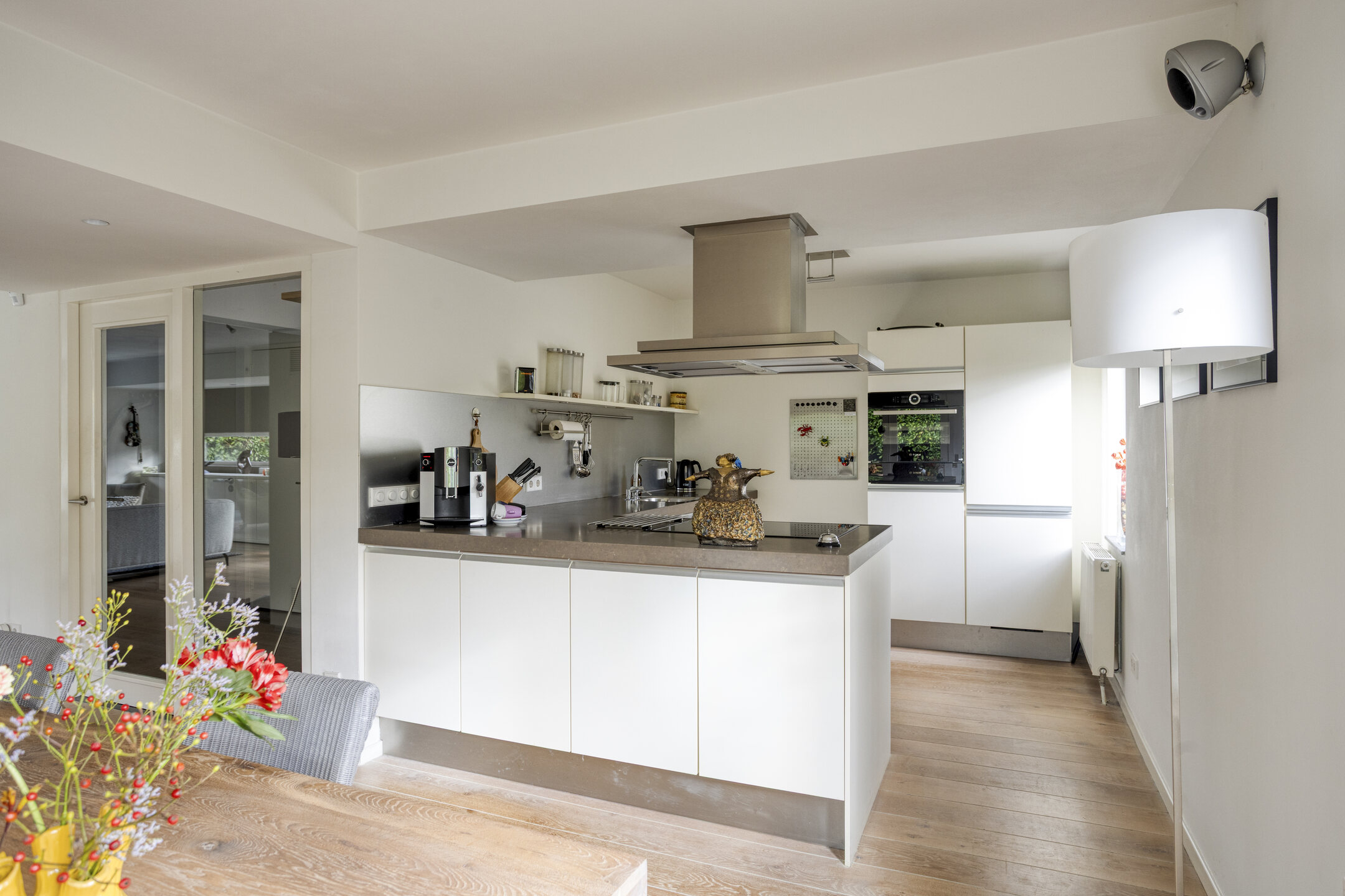 Dès l’entrée, un vaste hall s’ouvre sur un sol en chêne et des portes vitrées aux lignes épurées. Le séjour et la cuisine-salle à manger sont séparés par une cheminée Bellfire à double foyer, diffusant une chaleur apaisante au cœur de l’espace. La cuisine luxueuse, dotée d’équipements haut de gamme et d’un plan de travail en pierre bleue belge, allie usage quotidien et art de vivre. La façade arrière, caractérisée par de larges baies vitrées, sublime l’harmonie du jardin et la perspective protégée de l’Egmonderhout.