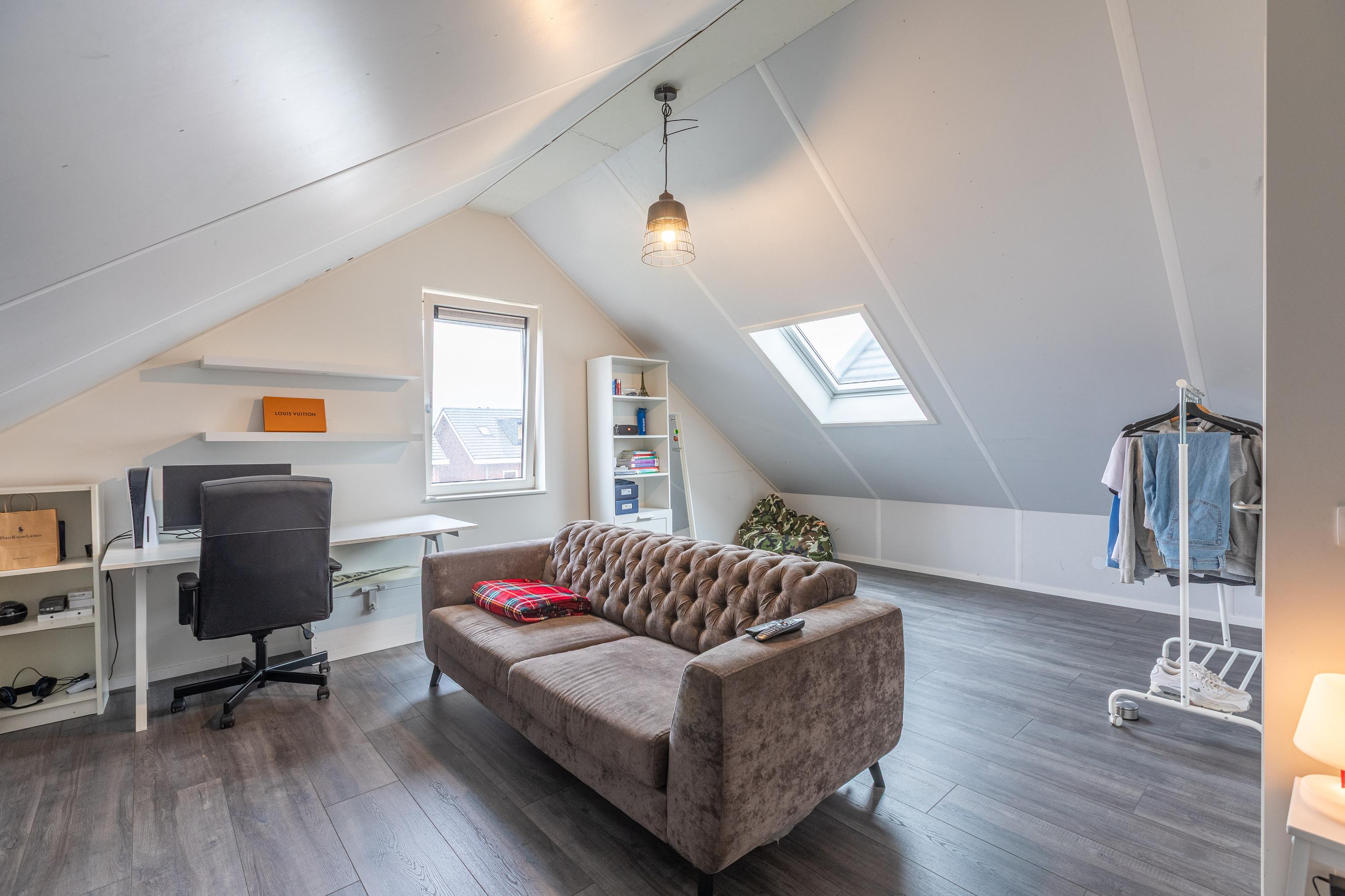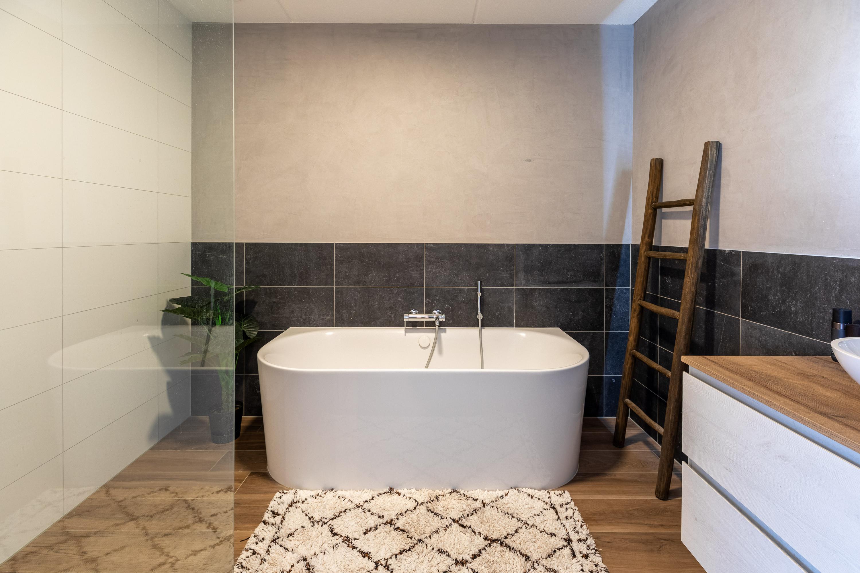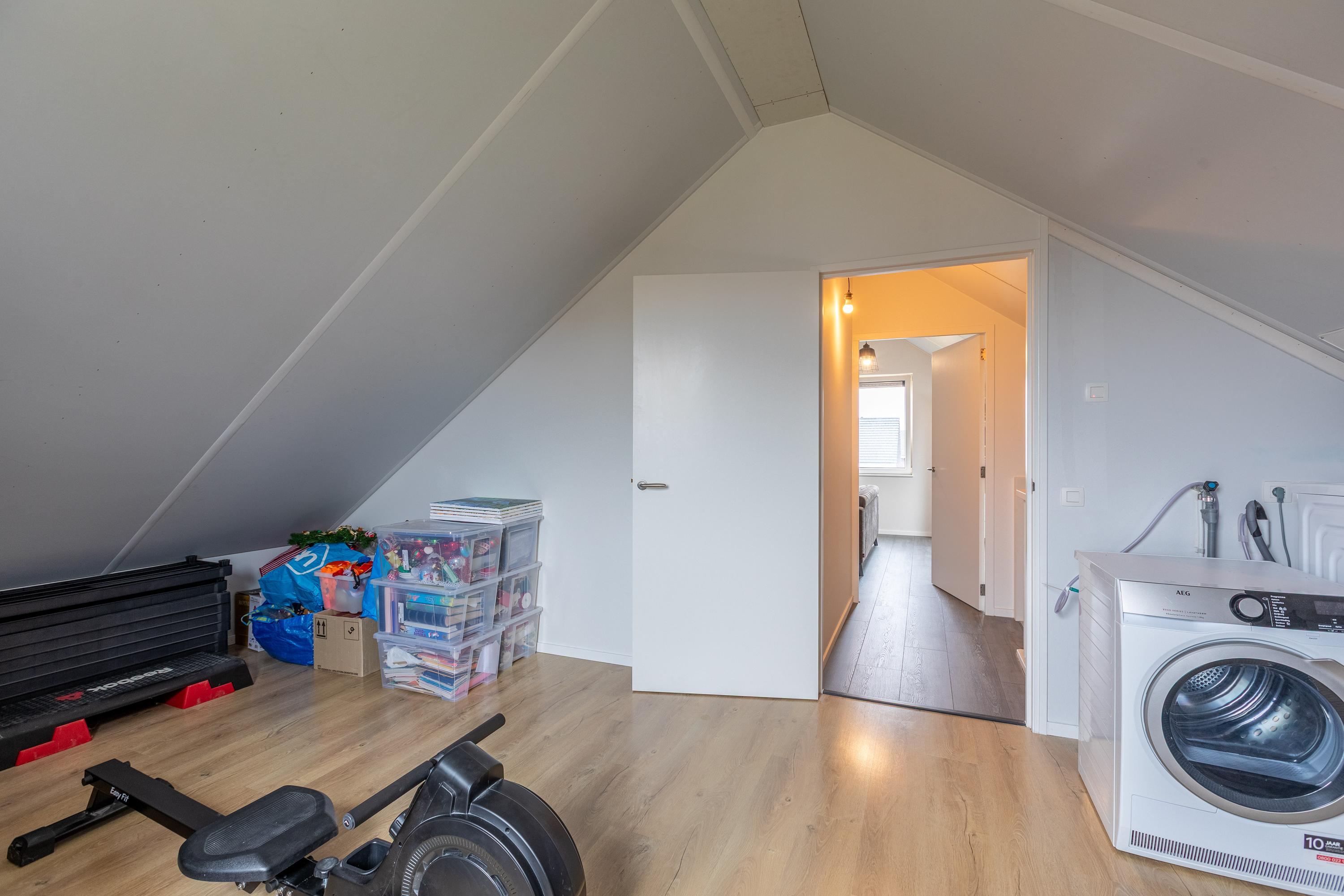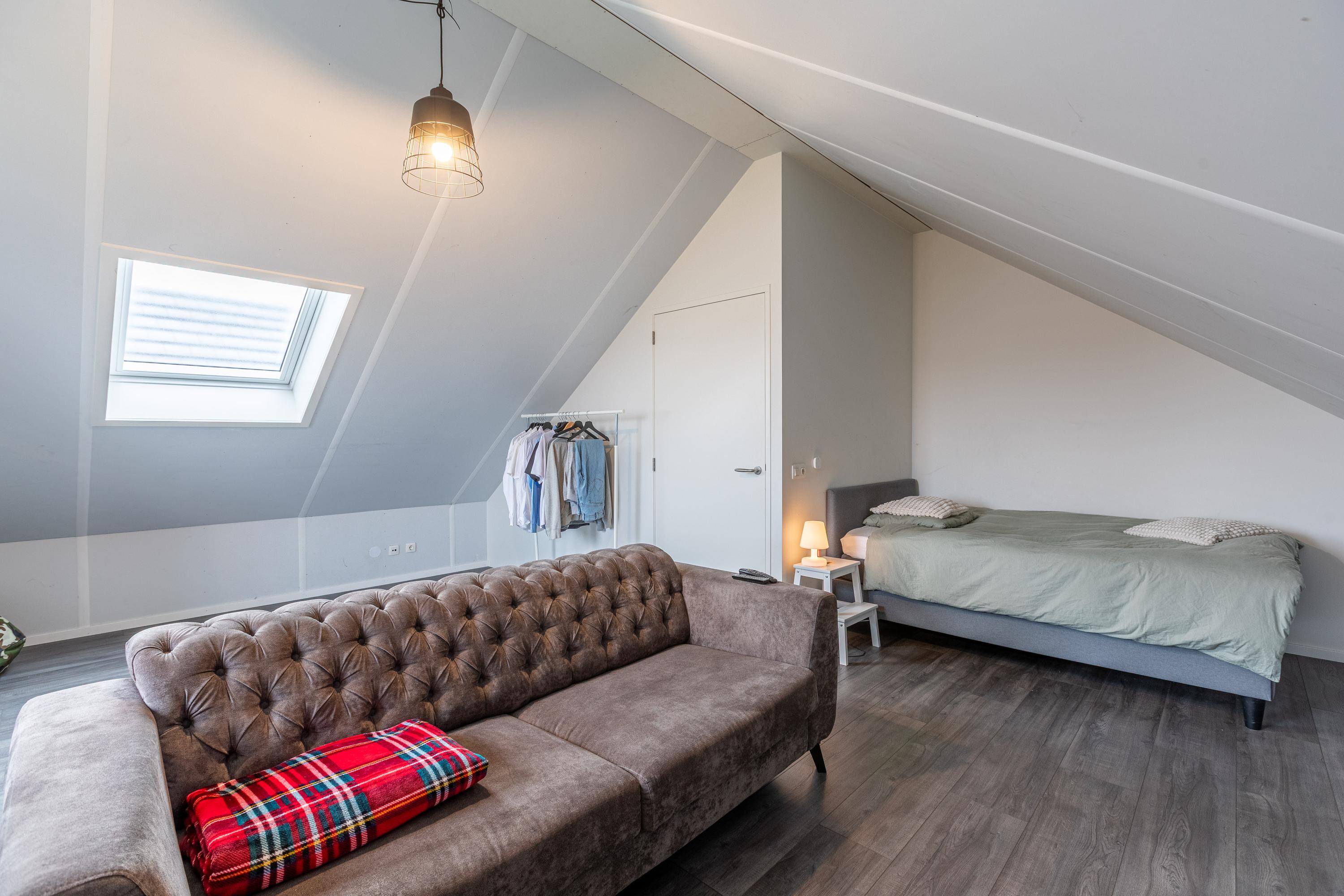 Un escalier baigné de lumière dessert le premier étage, qui accueille quatre chambres paisibles, toutes bénéficiant de portes surélevées et d’un apport lumineux équilibré. La salle de bains centrale dispose d'une douche de plain-pied, d'une baignoire et d'une double vasque, complétée par un second WC séparé pour plus de confort. Le deuxième niveau s’avère modulable, proposant une grande cinquième chambre et une sixième pièce polyvalente, actuellement aménagée pour la buanderie et le rangement, mais prête à accueillir une seconde salle de bains si besoin. Les menuiseries en PVC avec vitrage HR++ soulignent l’attention portée à l’isolation, secondée par une ventilation équilibrée dans toute la maison.