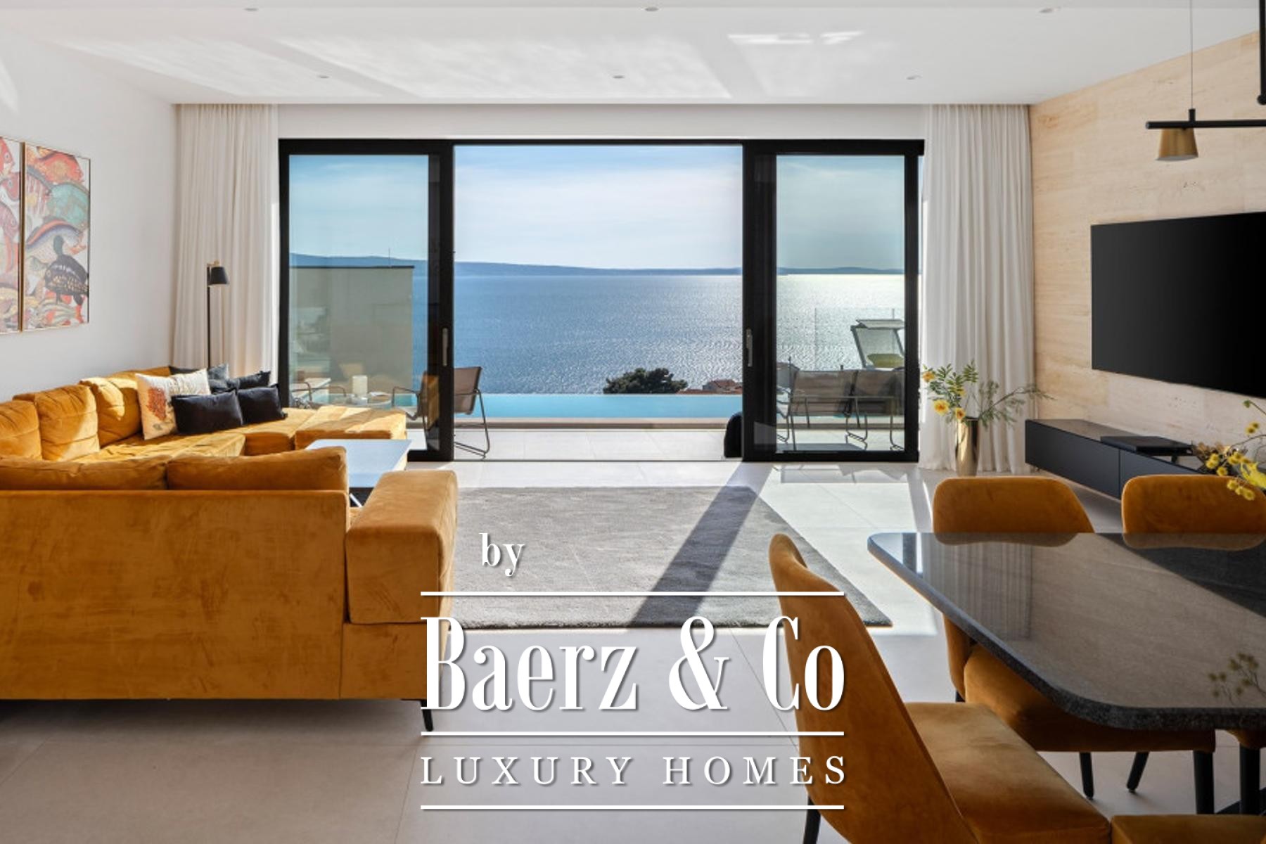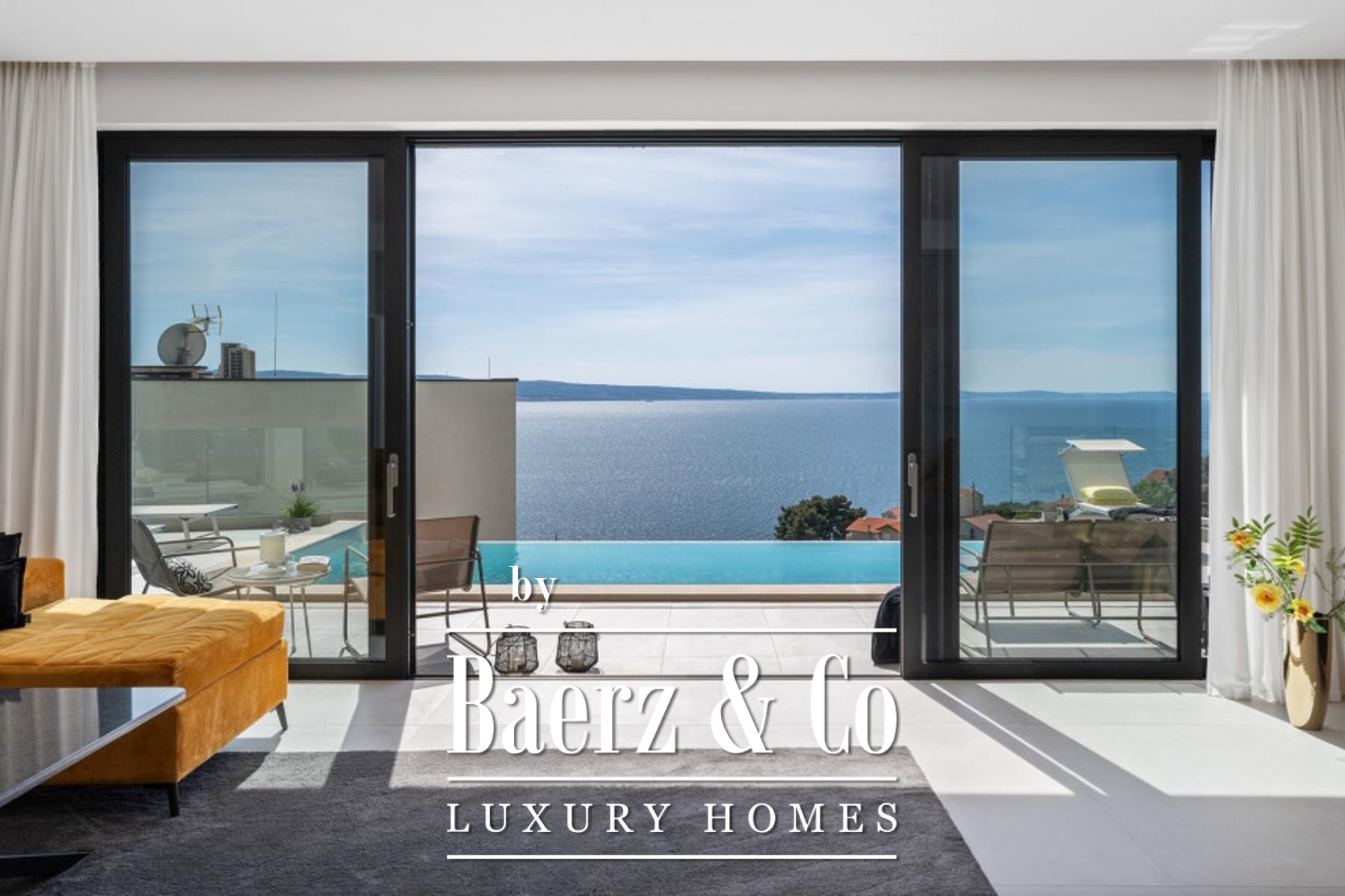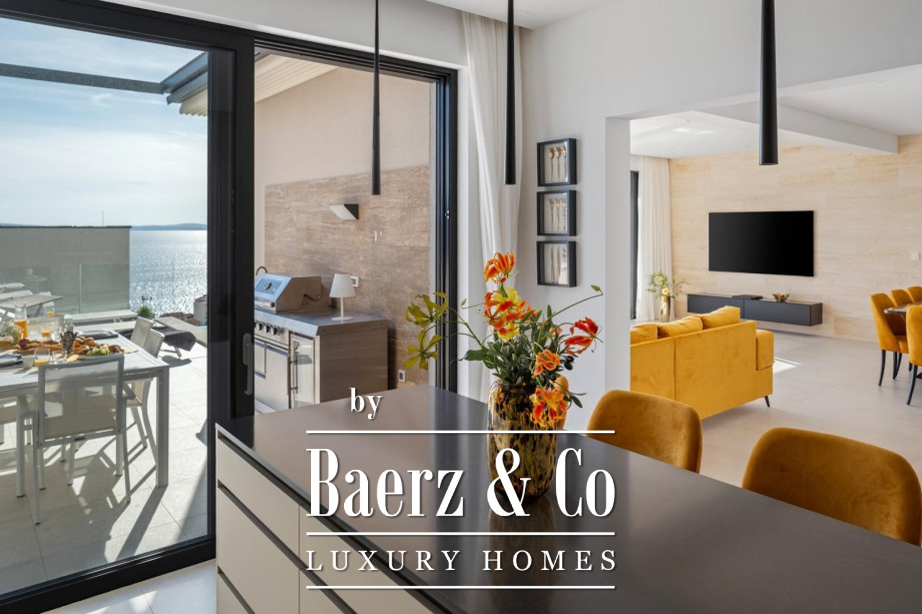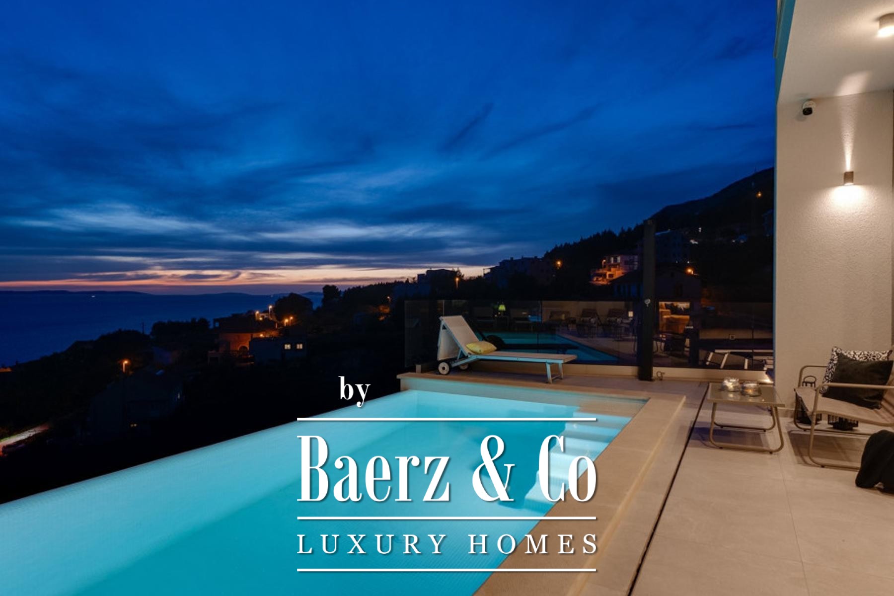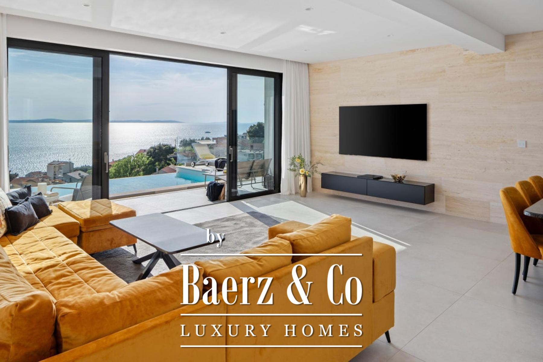 Jesenice, a modern semi-detached villa with a beautiful sea view. It extends over three floors, with a net usable area of 222 m2. It consists of an open-concept living room, kitchen and dining room, 3 bedrooms, 2 bathrooms and one toilet, as well as a beautiful terrace with a swimming pool and a sunbathing area.The large kitchen with dining room and living room have direct access to the terrace through large sliding walls.It has 2 parking spaces.The villa was built to the highest technical standards, including smart home technology, underfloor heating, air conditioning and electrically operated roller shutters.Completed in 2023, it is fully furnished and equipped and is being sold as such.The advertised price refers to the purchase of the villa with the company that owns it.Other information on request