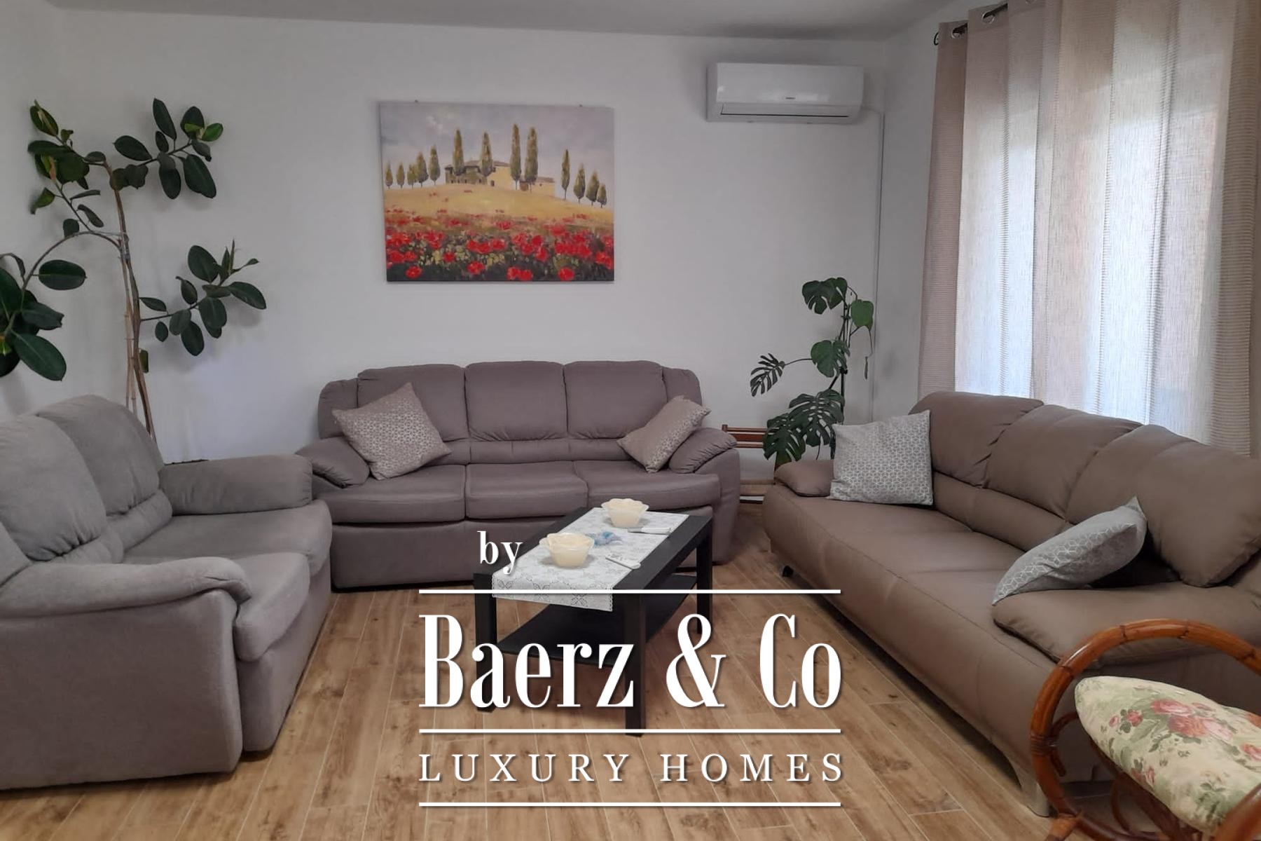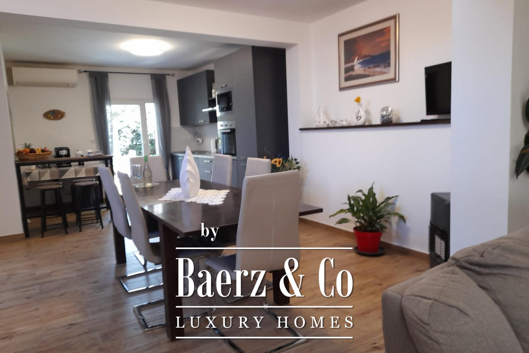 La maison se déploie sur deux niveaux. Le rez-de-chaussée allie luminosité et volumes généreux autour d’un vaste séjour, d’une cuisine entièrement équipée et d’une salle de bains, tous ouverts sur la terrasse et la piscine de 48 m². Un garage discret s’intègre avec élégance à la configuration de l’espace. Le jardin, ponctué d’une cheminée extérieure, ajoute une touche croate subtile à l’ensemble.